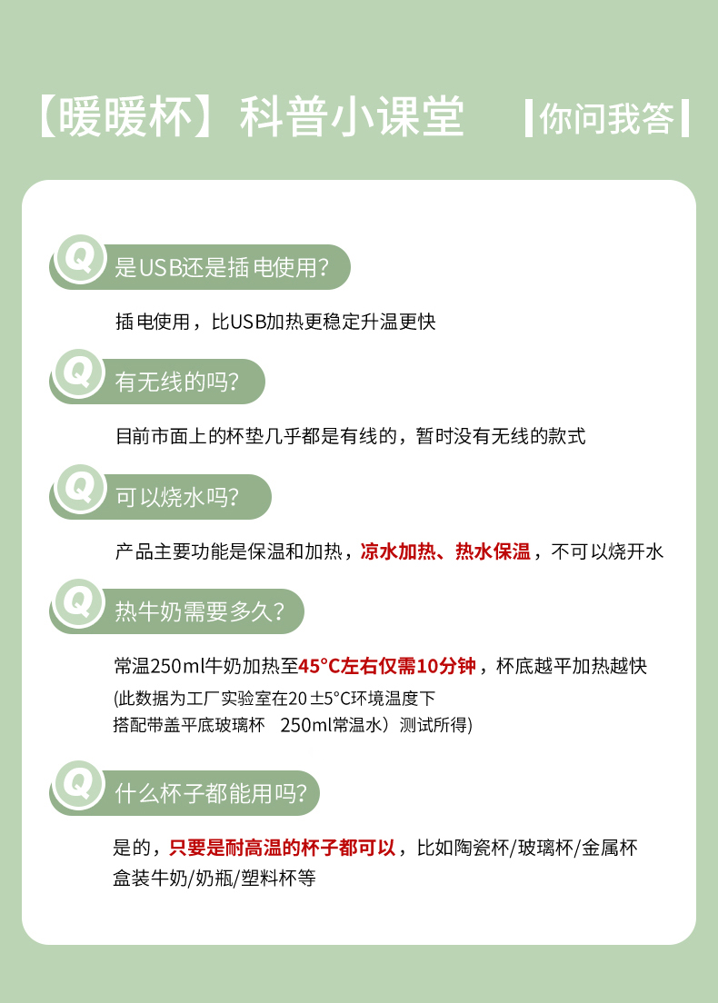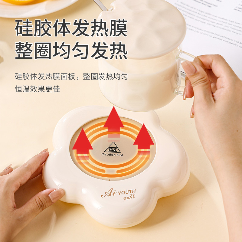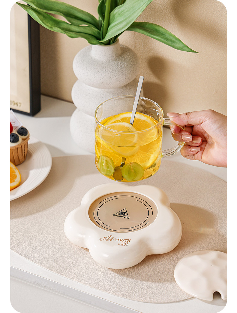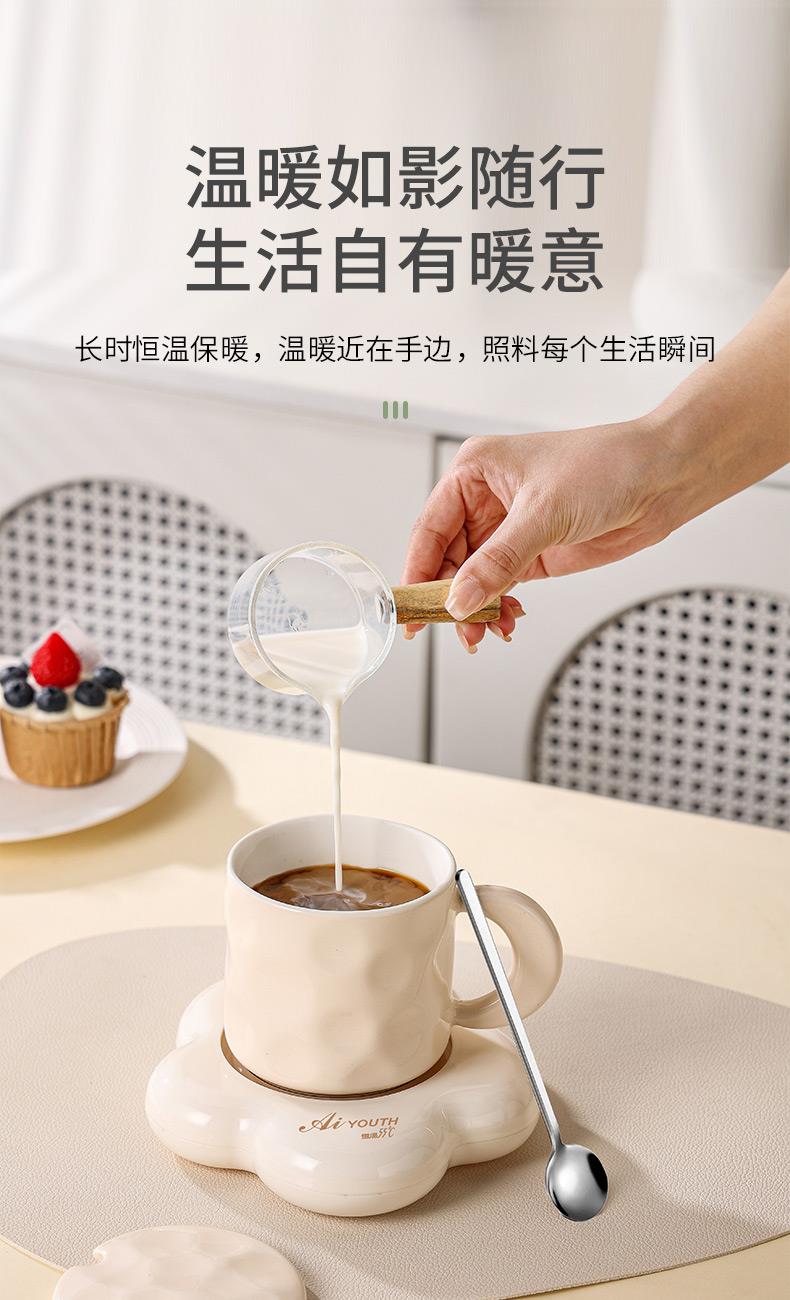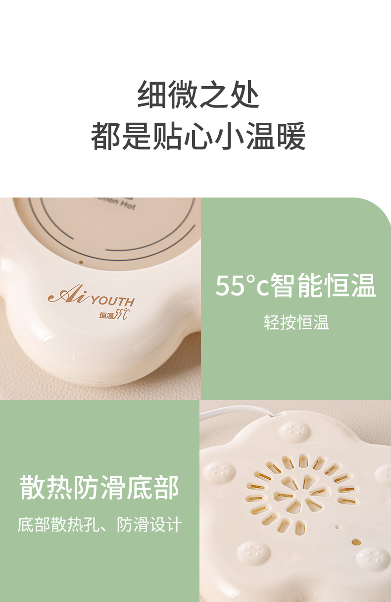 额定电压: 220V~ 额定频率:50Hz 额定功率: 16W 产品容量: 400ML 重 量: 0.8kg 颜 色 :奶油白 包装尺寸: 306*105*210mm 包装清单:陶瓷杯、不锈钢勺、重力感应恒温杯垫 主要材质:陶瓷 特色功能: 1.55℃智能控温,温暖近在手边 2.硅胶体发热,膜面板,整圈发热均匀 3.静音加热,不挑杯子,快速加热,多彩颜色 4.兼容不同款式和材质的杯型,平/薄底器具加热更快