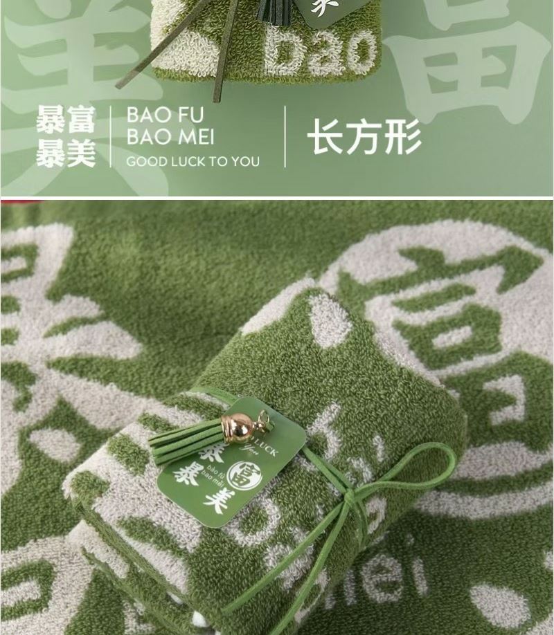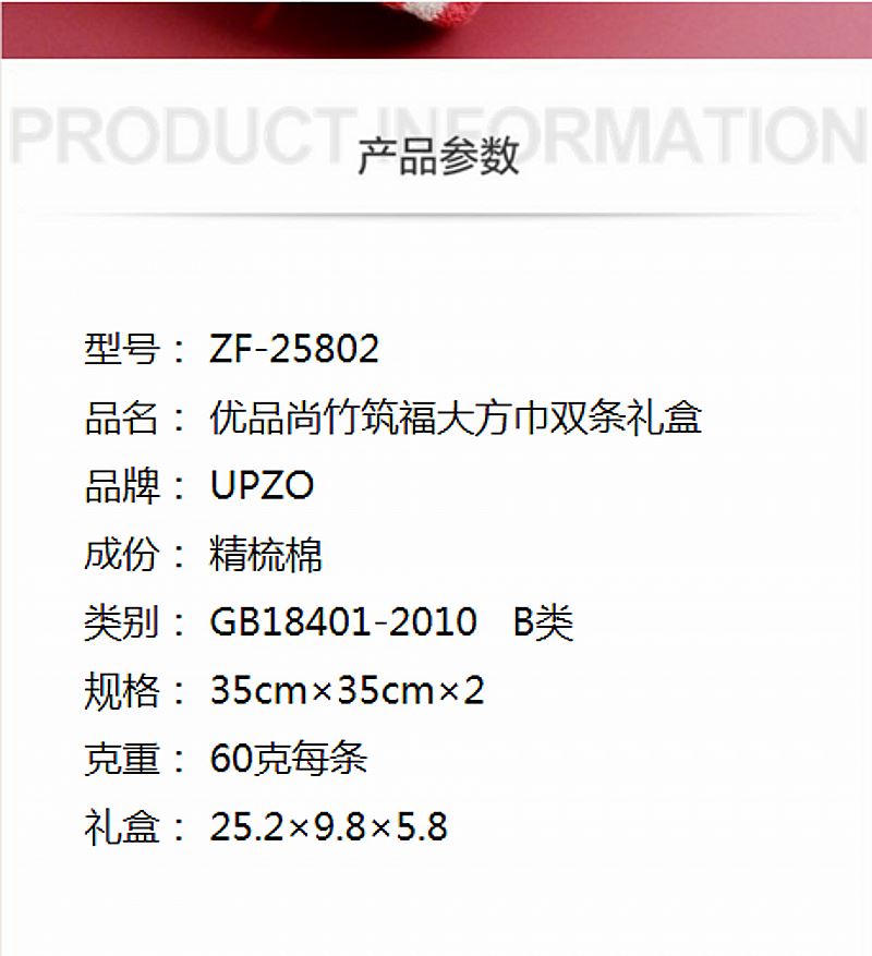 型号: ZF-25802 成份: 精梳棉 类别: GB18401-2010 B类 规格: 35cm×35cm×2 克重: 60克每条 礼盒: 25.2×9.8×5.8 精梳棉材质 祝福语融入 折叠造型 搭配祝福文案 文创好礼