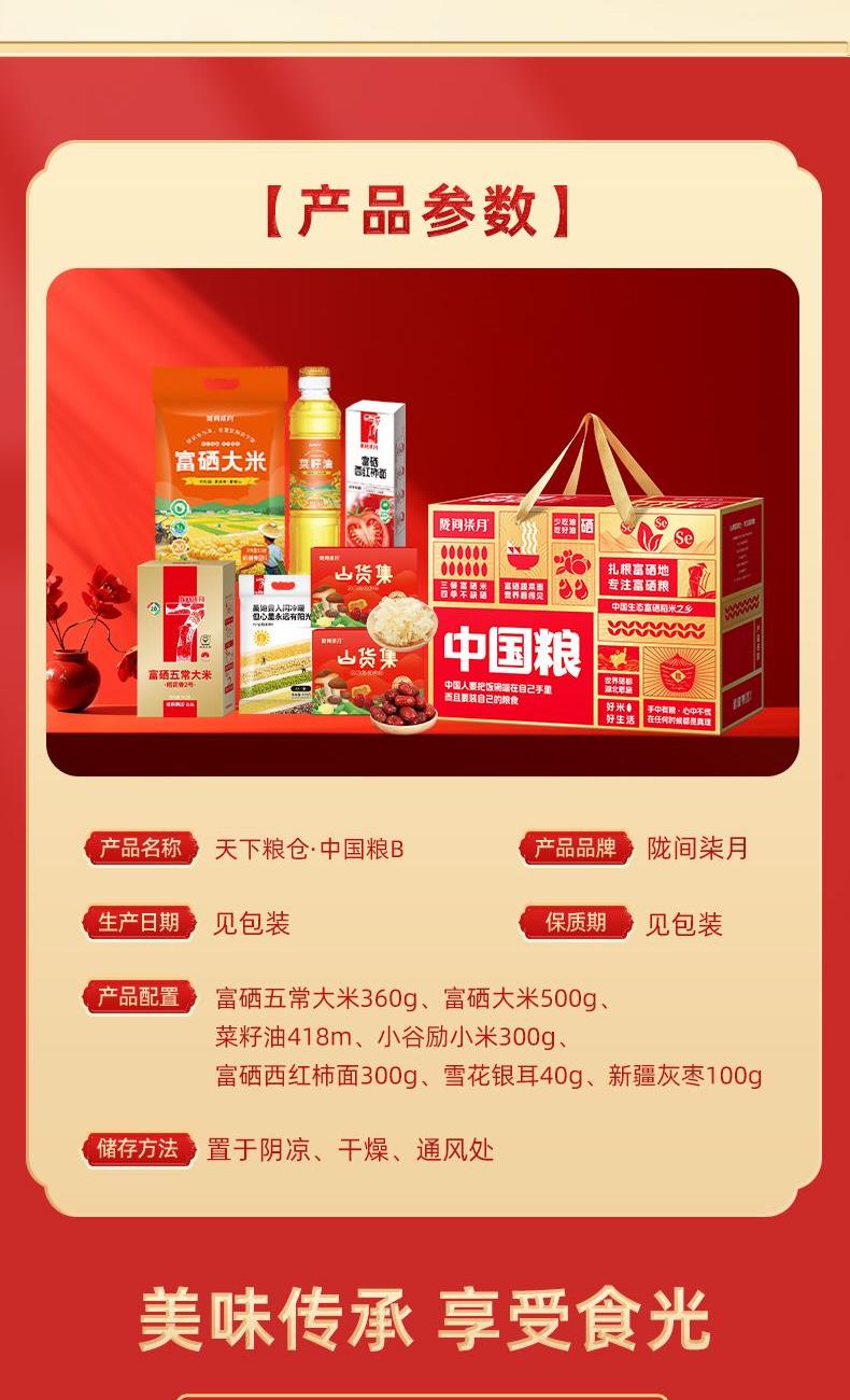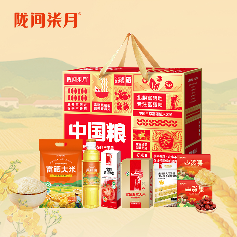 规 格:富硒五常大米360g,富硒大米500g,菜籽油418mL,小谷励小米300g,富硒西红柿挂面300g,雪花银耳40g,新疆灰枣100g