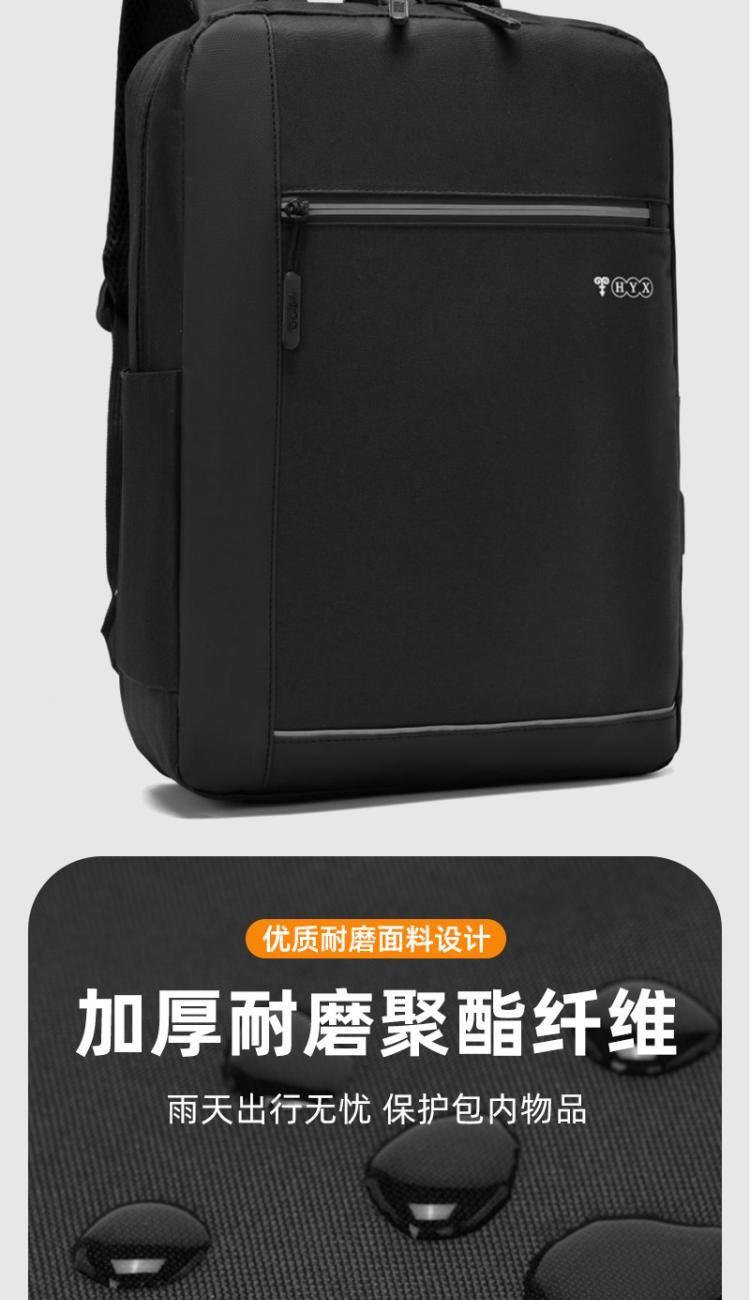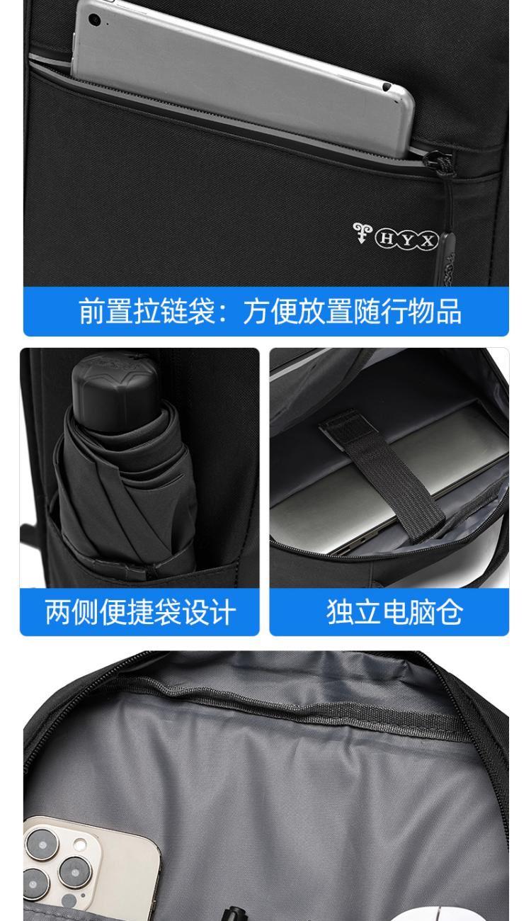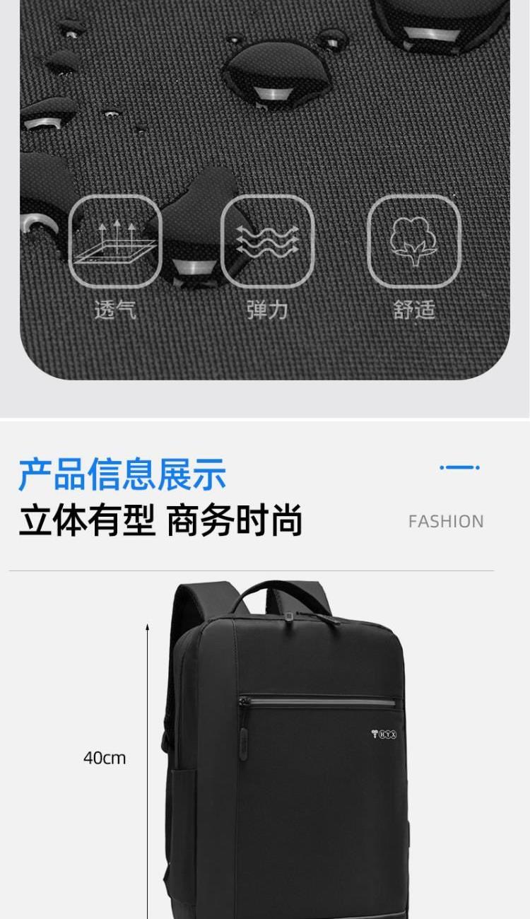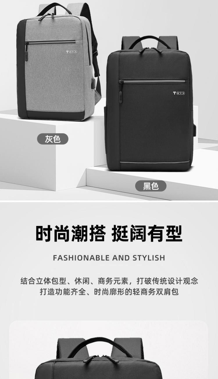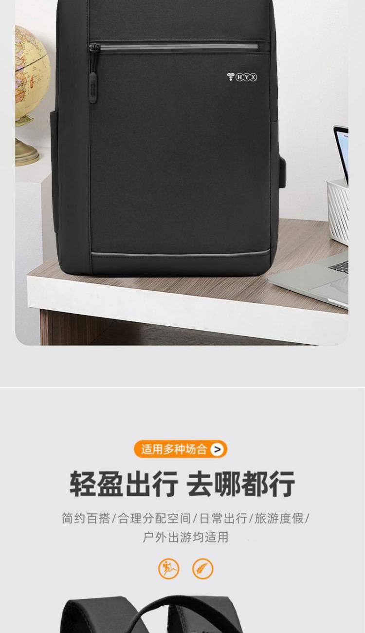 产品型号:HYX0924 产品重量:0.411kg 产品规格:40*29*11.5cm 产品颜色:黑色\灰色 产品卖点:受力点:密集针加固(打枣)结实可靠; 外置USB充电接口,即插即充; 严格的质量标准,车缝一寸7针; 笔记本电脑主袋,平板电脑书籍副袋,笔插袋,卡片袋,零钱袋,都市出行,你没有想到的,我们都想到了; 方形立体式设计,简约更有型。
