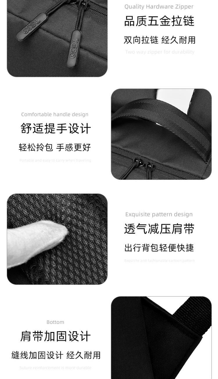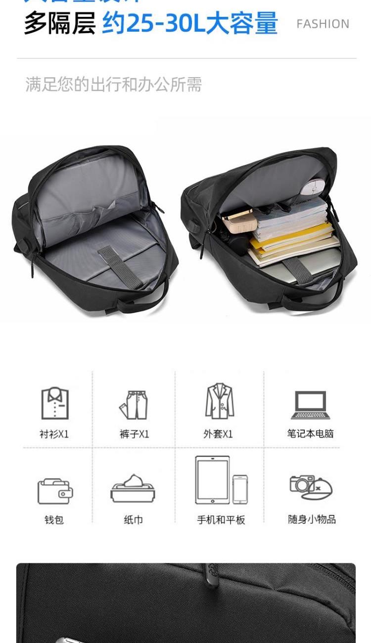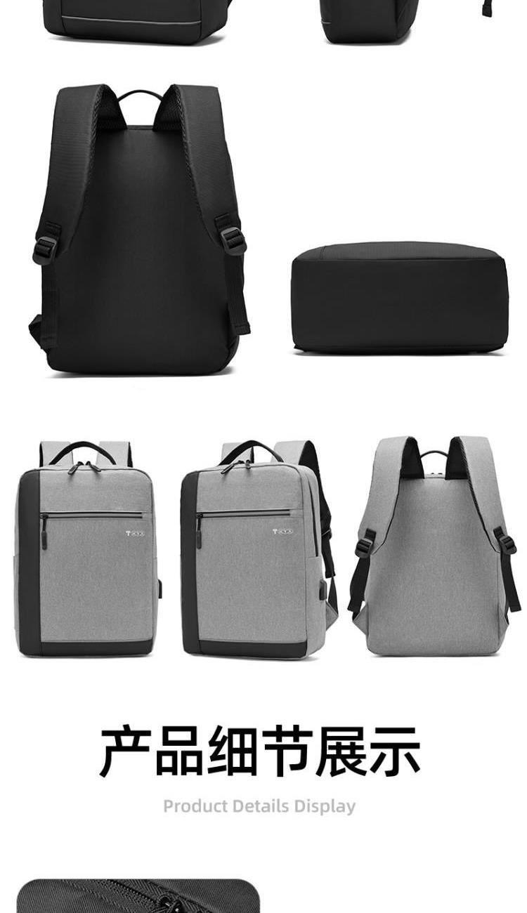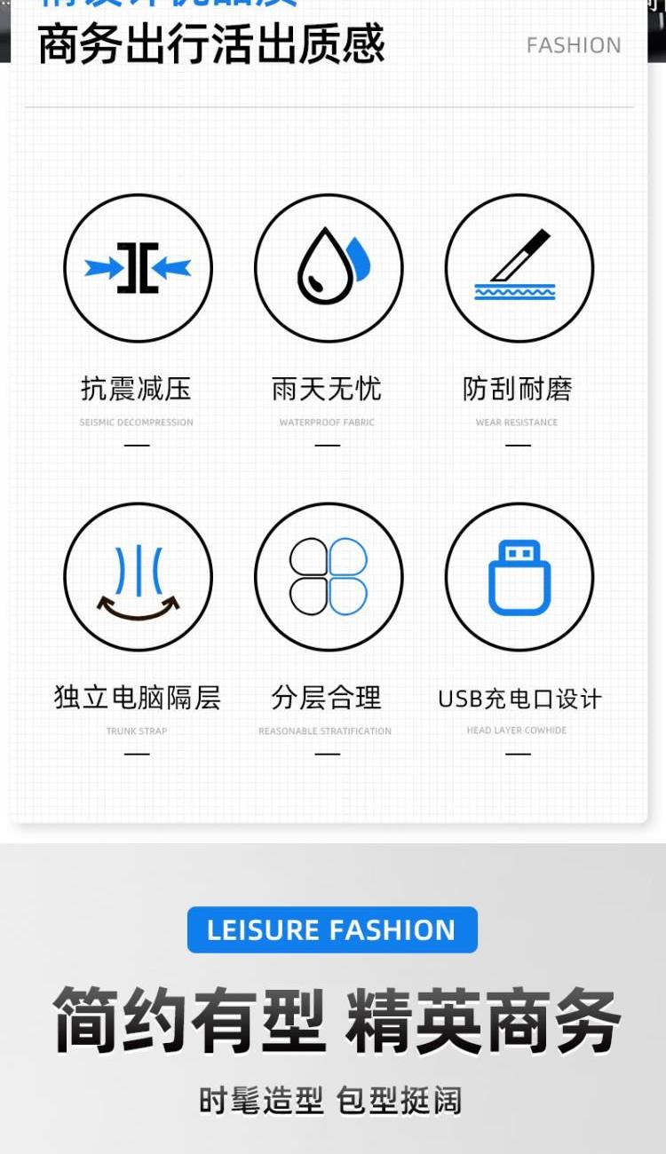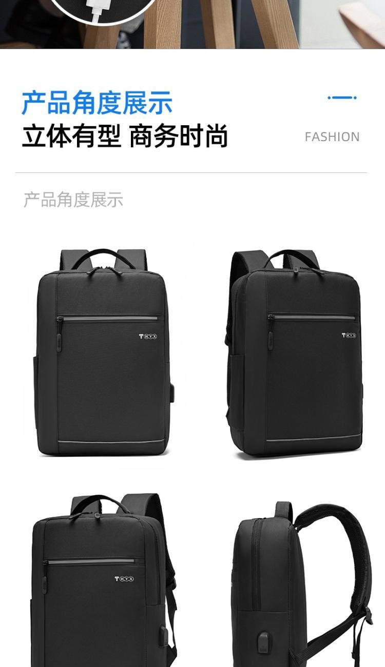 产品型号:HYX0924 产品重量:0.411kg 产品规格:40*29*11.5cm 产品颜色:黑色\灰色 产品卖点:受力点:密集针加固(打枣)结实可靠; 外置USB充电接口,即插即充; 严格的质量标准,车缝一寸7针; 笔记本电脑主袋,平板电脑书籍副袋,笔插袋,卡片袋,零钱袋,都市出行,你没有想到的,我们都想到了; 方形立体式设计,简约更有型。