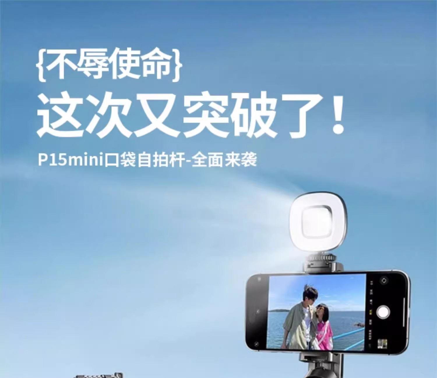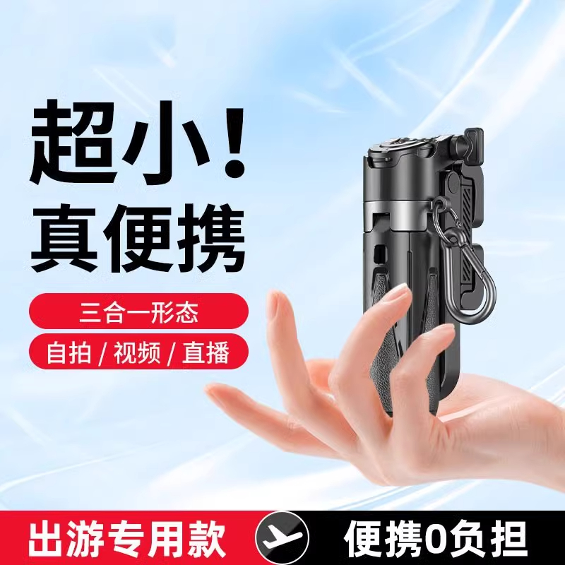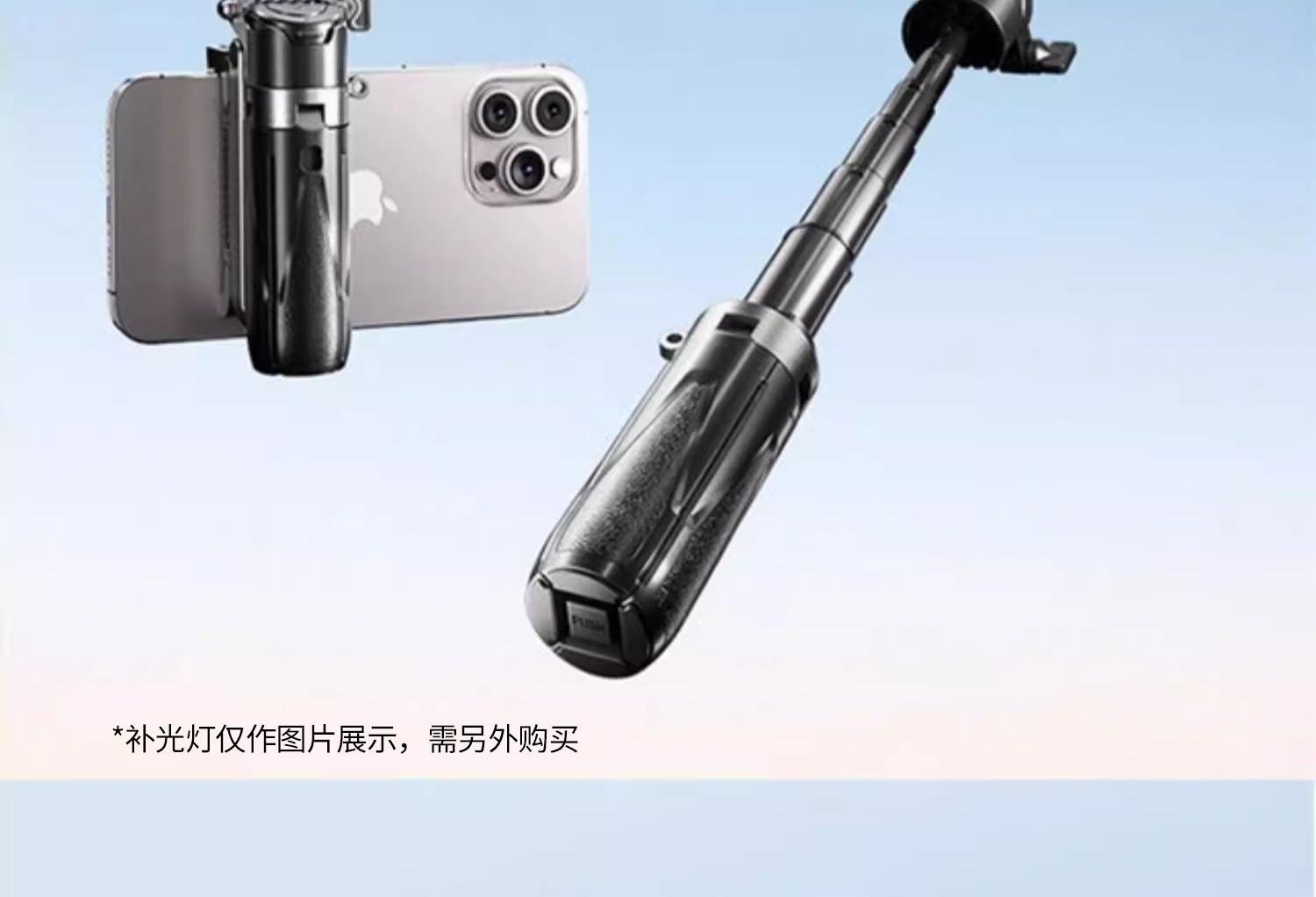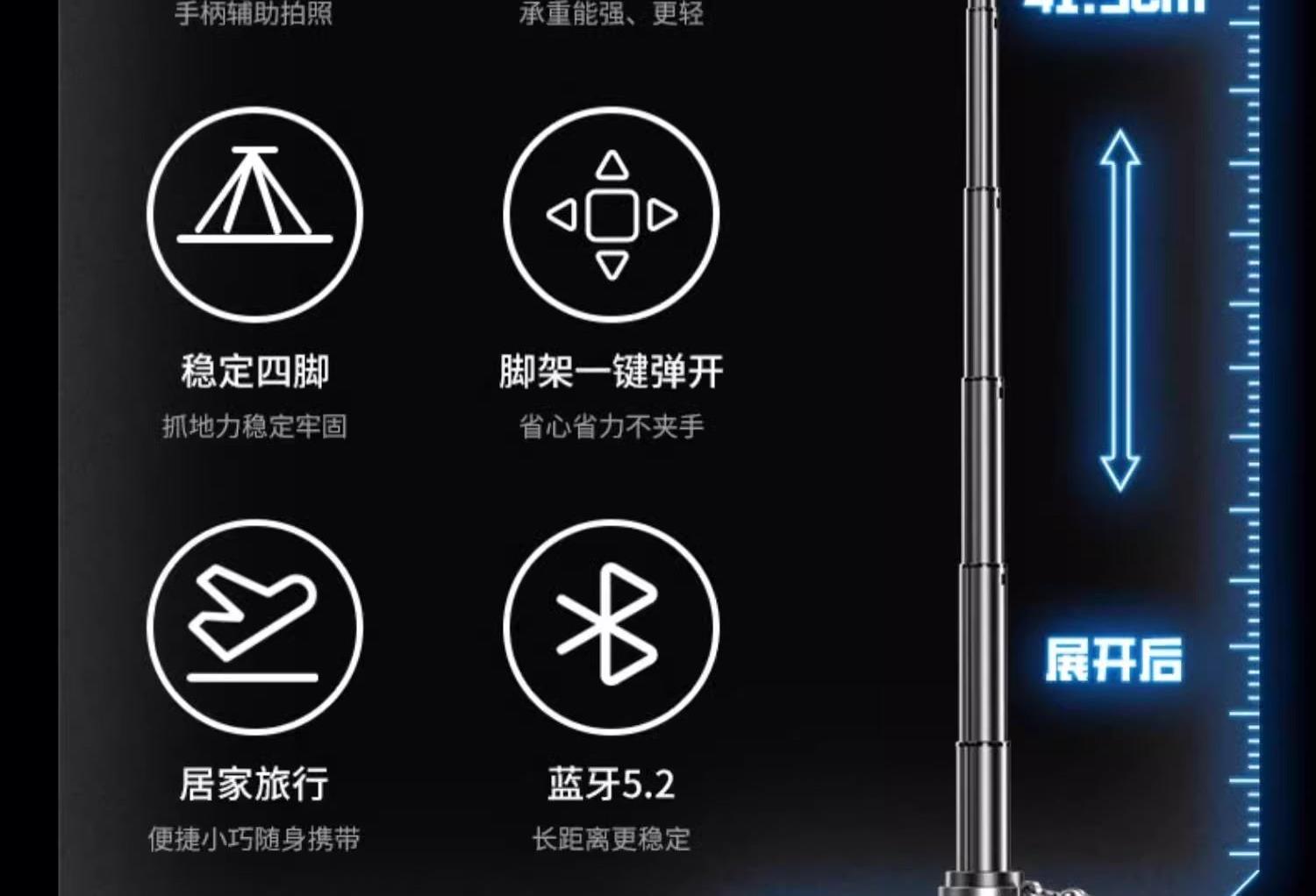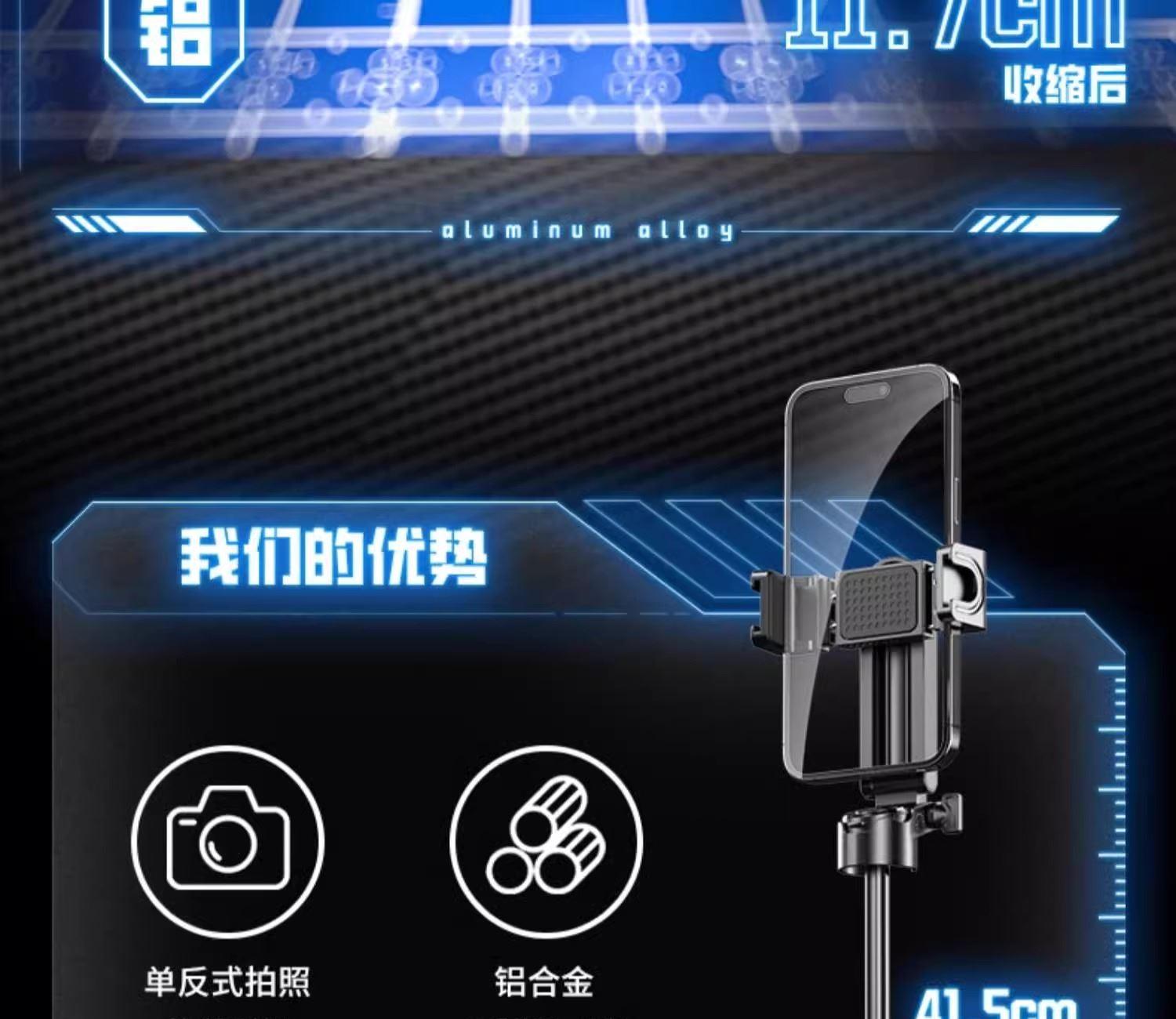 产品颜色:黑色/白色 蓝牙遥控:蓝牙版本:蓝牙5.2版;充电接口:Type-C 电池型号:401020聚合物(可充电):容量:55mAh;电压:4.2V 适用型号:所有智能手机。材质:铝合金+ABS 产品尺寸:57*48*117mm 彩盒尺寸:129*65*52mm 整箱数量:100/箱 产品重量:约140克