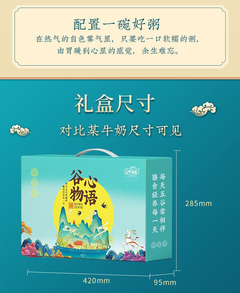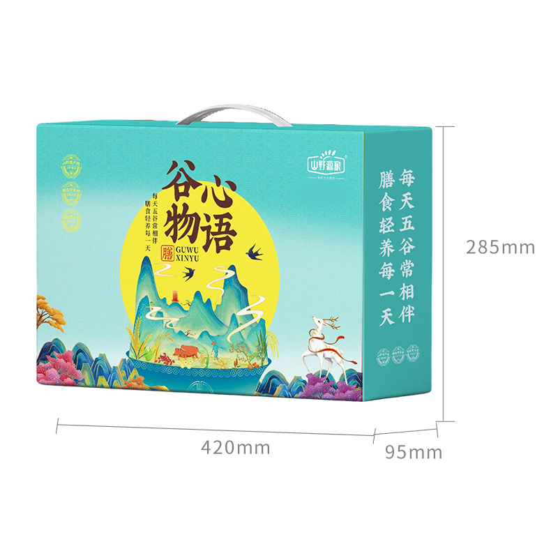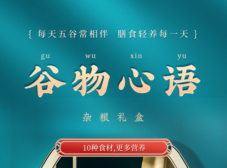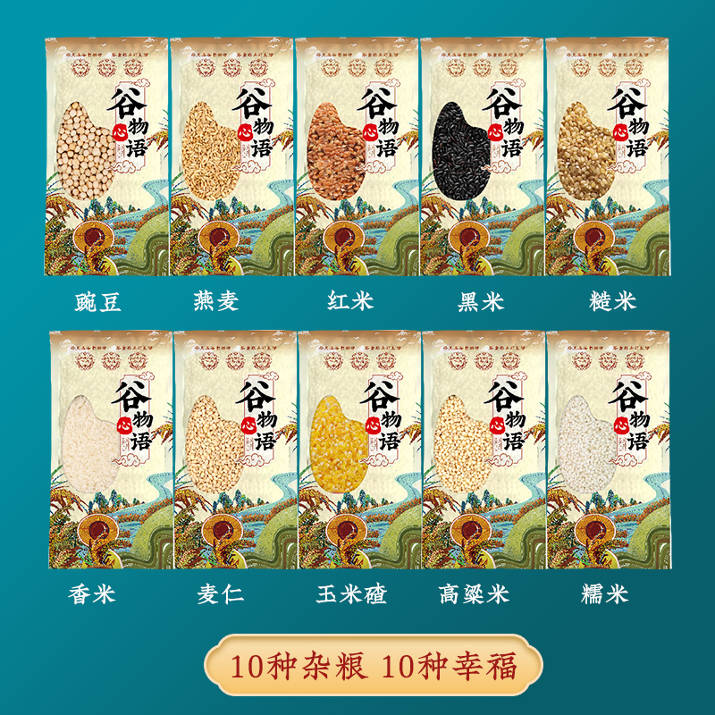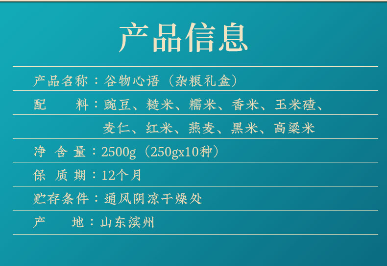 谷物心语 净含量:2500g 条码:6972761600246 产品规格配置:豌豆、糙米、玉米碴、高粱米、麦仁 红米、燕麦、黑米、香米、糯米(250gx10袋) 盒尺寸:42*9.5*28.5cm 尺寸:59.5*43*30 箱重量:18.27kg 箱体积:0.077方