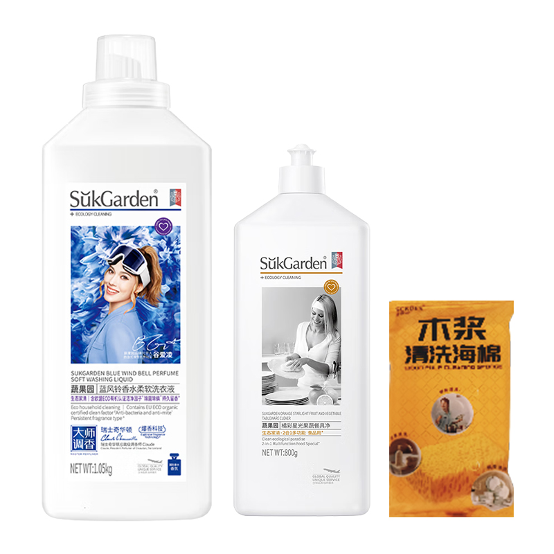 SukGarden蔬果园蓝风铃香水柔软洗衣液1050g SukGarden蔬果园橘采星光果蔬餐具净800g 小仓熊香氛洁厕液(蜜桃香)450g 小仓熊鞋用除臭喷雾180ml 小仓熊马桶挂篮-(单个装)50g 小仓熊冰箱除味蛋-柠檬30g 赠:Sckoes诗寇丝木浆清洗海绵1块 小仓熊甄选礼盒(265*95*270mm)