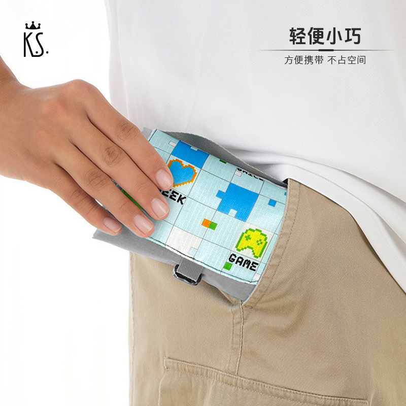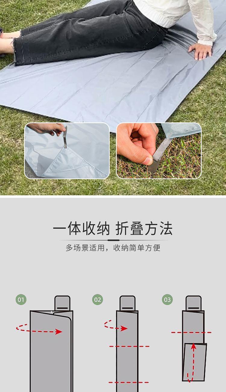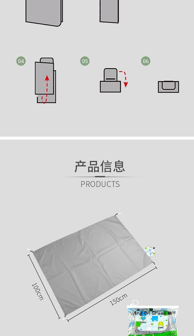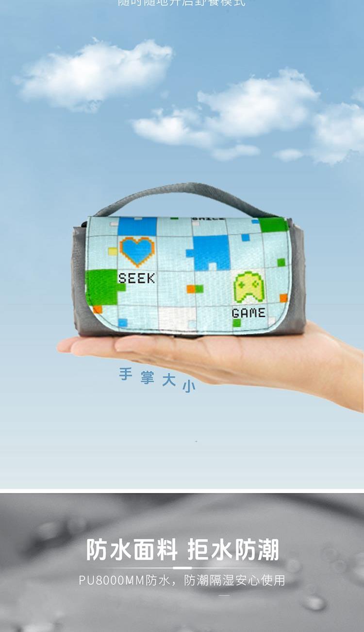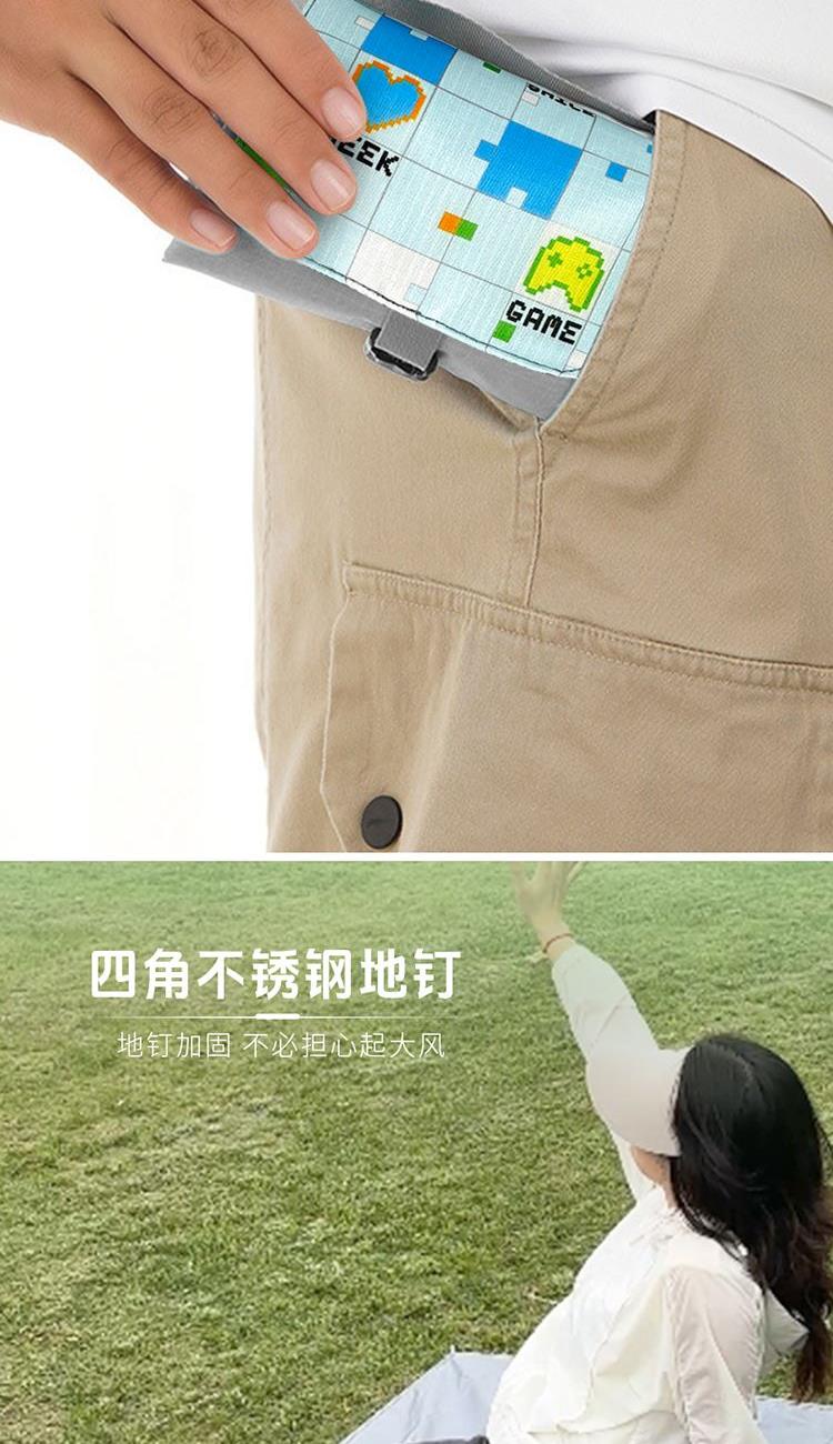 1.轻量,轻松收纳: 210T高密涤塔夫面料,自重轻盈,折叠后仅巴掌大小,轻松携带。 2.210T涤塔夫面料防水防污: 有效抵御地面湿气.泼溅和小雨,污渍易擦除,保持垫面干爽洁净。 3.四角加固地钉设计: 自带4枚地钉,强风天气稳固抗风,告别垫子乱飞烦恼。 4.年轻化设计风格: 像素搭配纯色,更显活力。户外打卡更出片,彰显个性品味。 210T防水涤塔夫