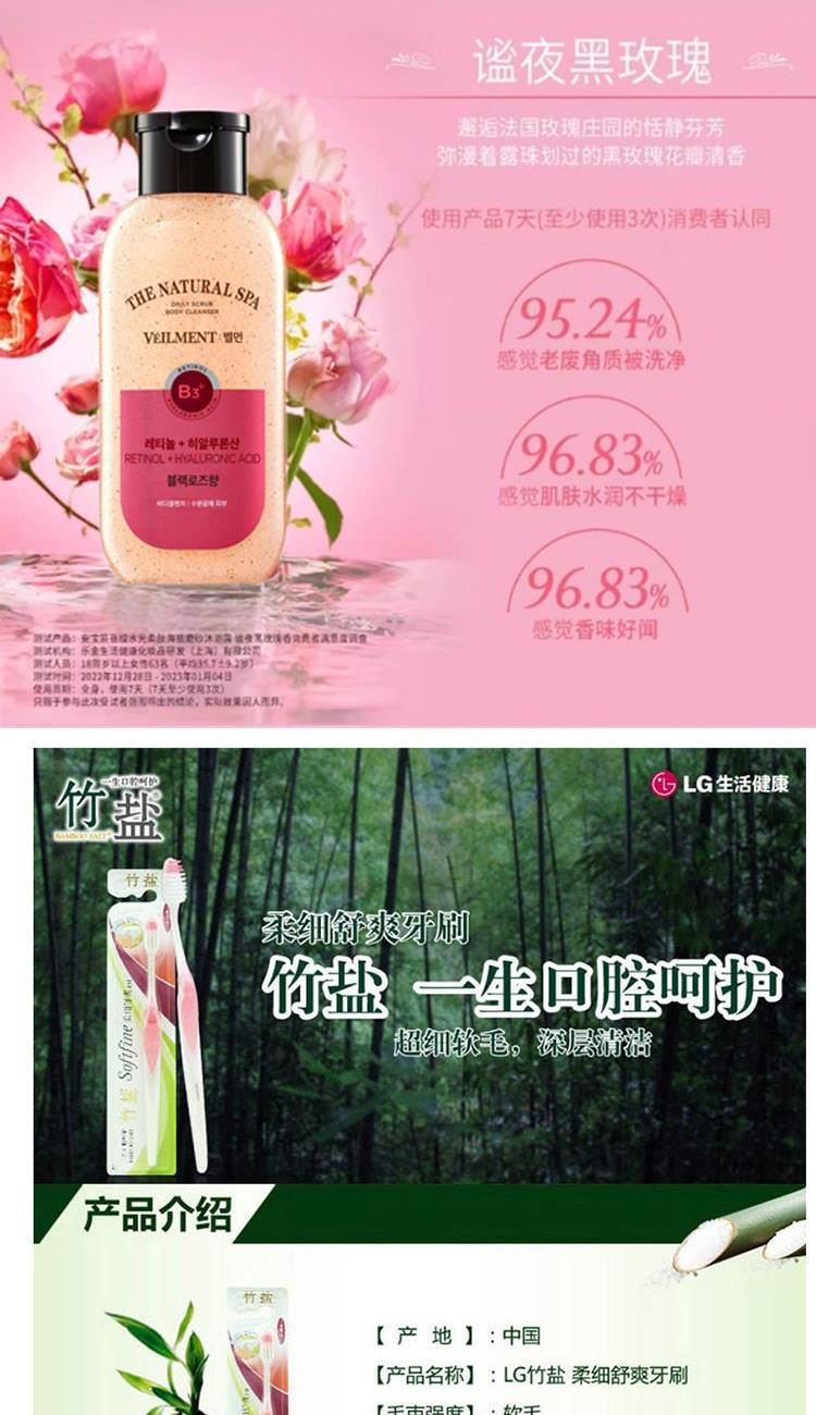 菲诗小铺香氛洗发水200ml*1瓶 (香型随机:初恋甜心/梦中邂逅) 菲诗小铺香氛护发素200ml*1瓶 (香型随机:初恋甜心/梦中邂逅) 安宝笛蓓缦水光柔肤海盐磨砂沐浴露 谧夜黑玫瑰香200ml*1瓶 竹盐柔细舒爽牙刷 成人*1支