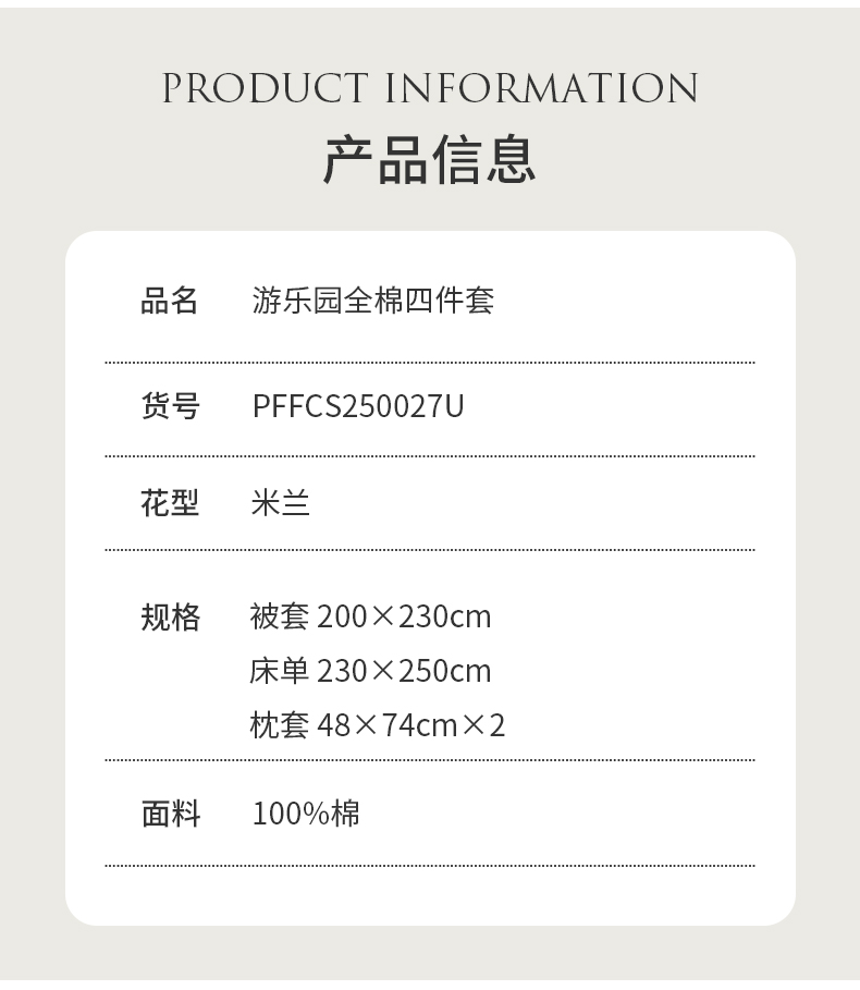 货 号:PFFCS250027U(米兰) 花 型:米兰 面 料:棉 规 格:被套 200x230cm 床单230x250cm 枕套 48x74cmx2