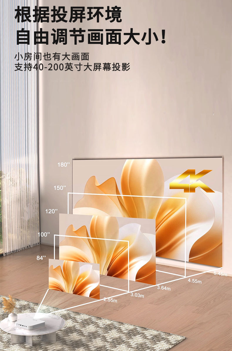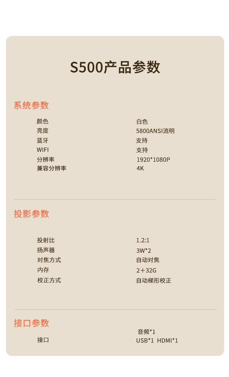 投射比:1.2:1 扬声器:3w*2 对焦方式:自动对焦 内存:2+32G 校正方式:自动梯形校正
