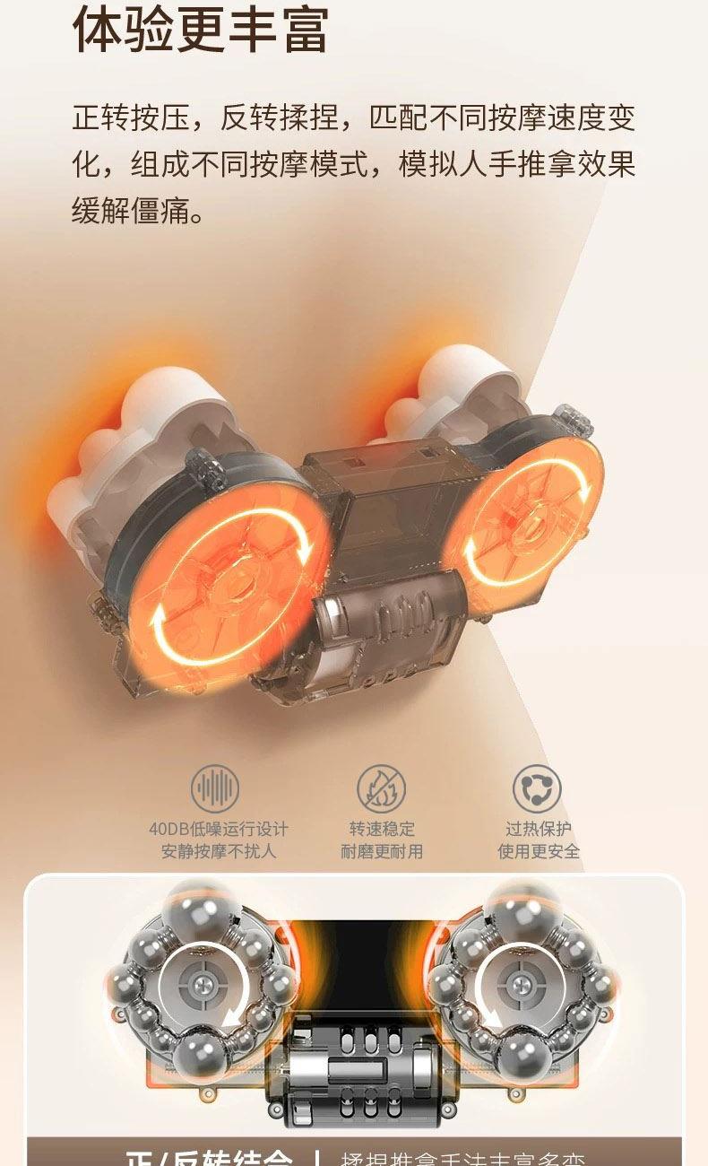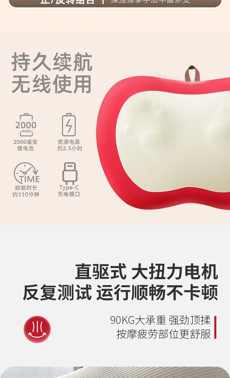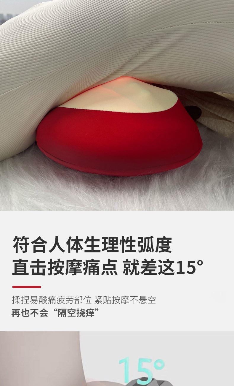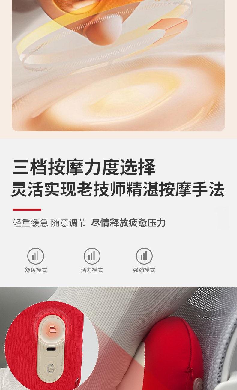 按摩体验类(直击痛点,模拟专业手感):15° 机芯倾斜设计,贴合人体生理弧度,直击按摩痛点,正转按压 + 反转揉捏,搭配三档力度,复刻老技师推拿手法,43° 红光温感热敷,深层舒缓酸痛疲劳,加速血液循环,全身多部位适配:腰 / 颈 / 肩 / 背 / 腿,一台满足全家需求,90KG 大承重,强劲顶揉不塌陷,按摩更到位