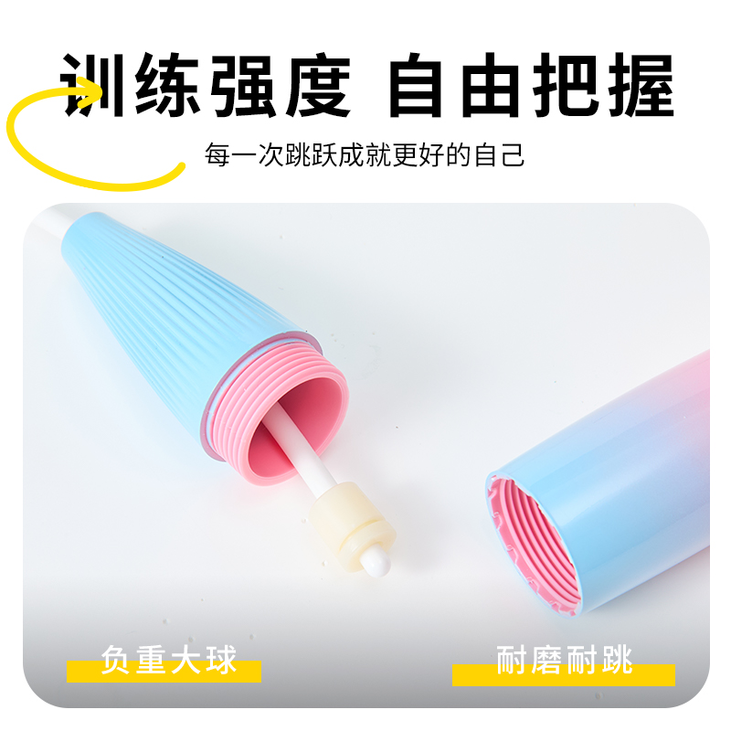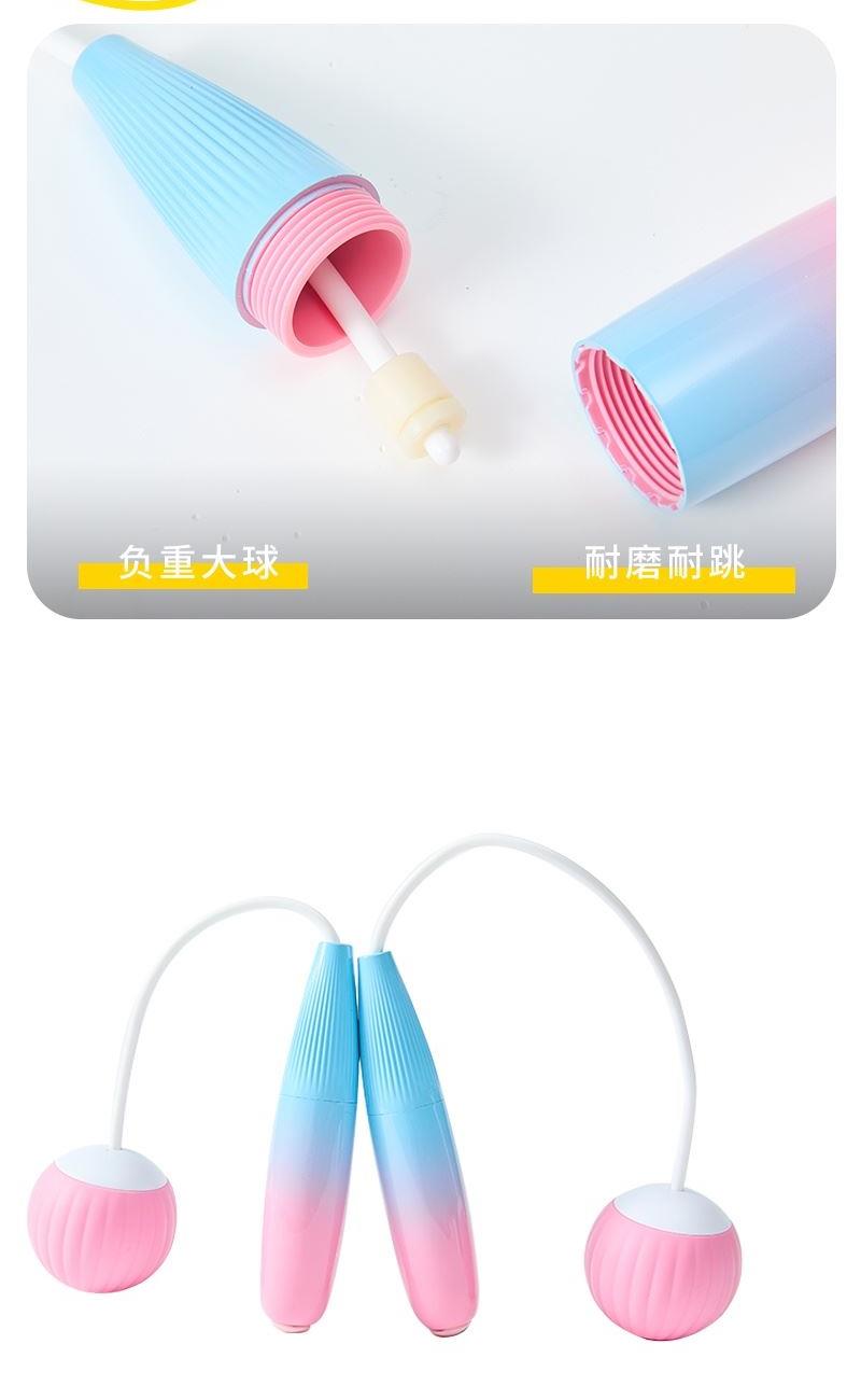 产品介绍: 烤漆手柄,TPE柔性大球,质感十足,粉蓝渐变色设计,适合爱美的时尚人士 超大双球,让您的甩动更加有力,避免不必要的体力损耗,集中锻炼有效部位 美观大方,放在包里就是这么协调,是新一代的网红瘦身利器 产品规格: 手柄125*18mm 绳长约2.6米 重量:180克 材质:ABS/TPE/PP