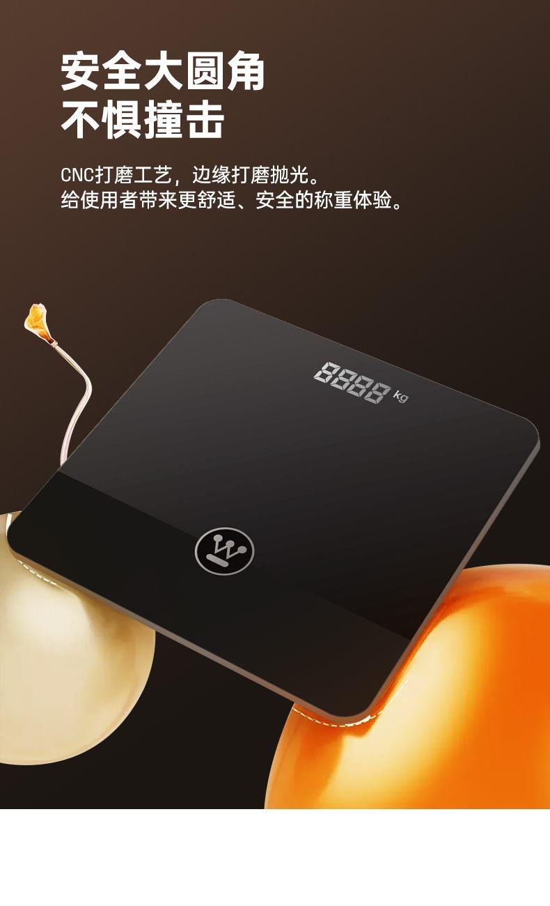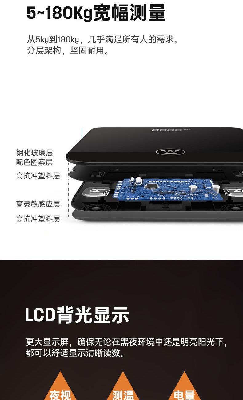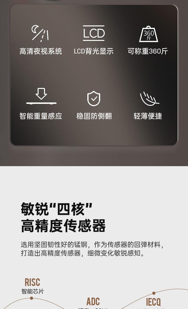 5、LCD背光显示屏,重量/温度/电量三项数据显示,弱光环境也清晰可见。