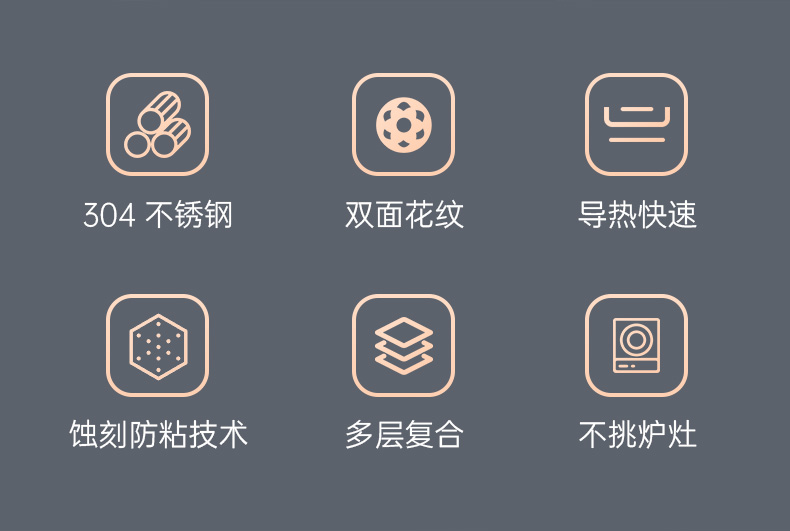 ◎蚀刻防粘技术烹饪不易粘锅:运用蚀刻工艺,在锅壁内蚀刻出精密凹凸纹理凸出部分构成一张蜂窝网状结构,防粘层仅覆盖纹理凹陷处,不易脱落更耐用。