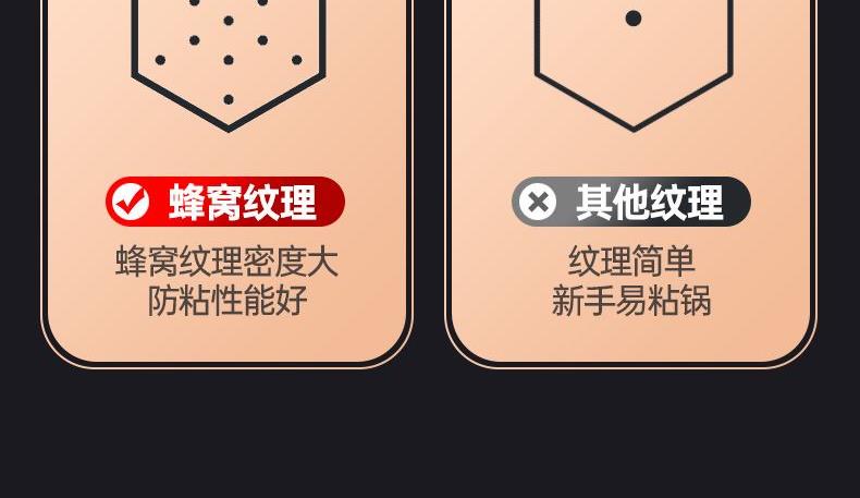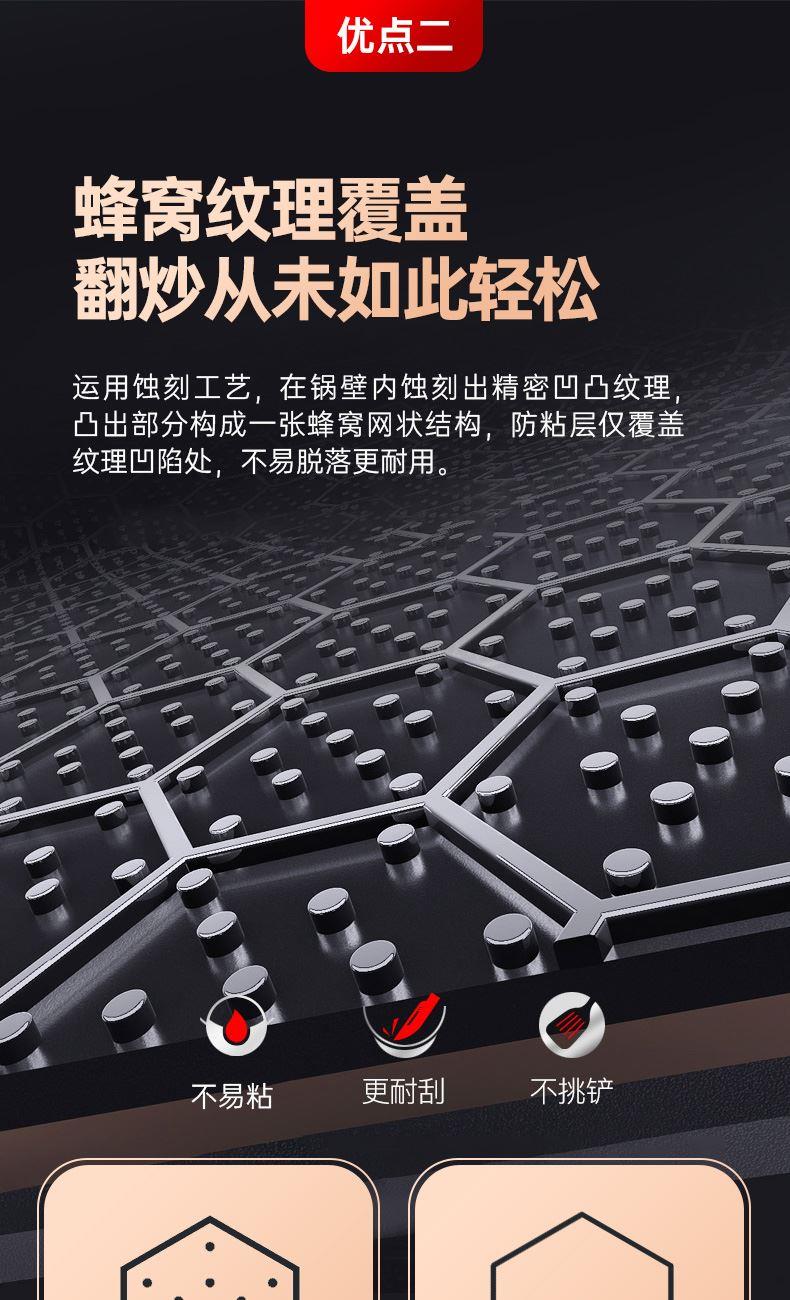 ◎蜂窝纹理覆盖锅面耐刮耐铲耐磨:蜂窝纹理有效保护防粘层不被刮花,钢铲随心用硬壳食材也不怕伤锅,烹饪不受厨具限制。