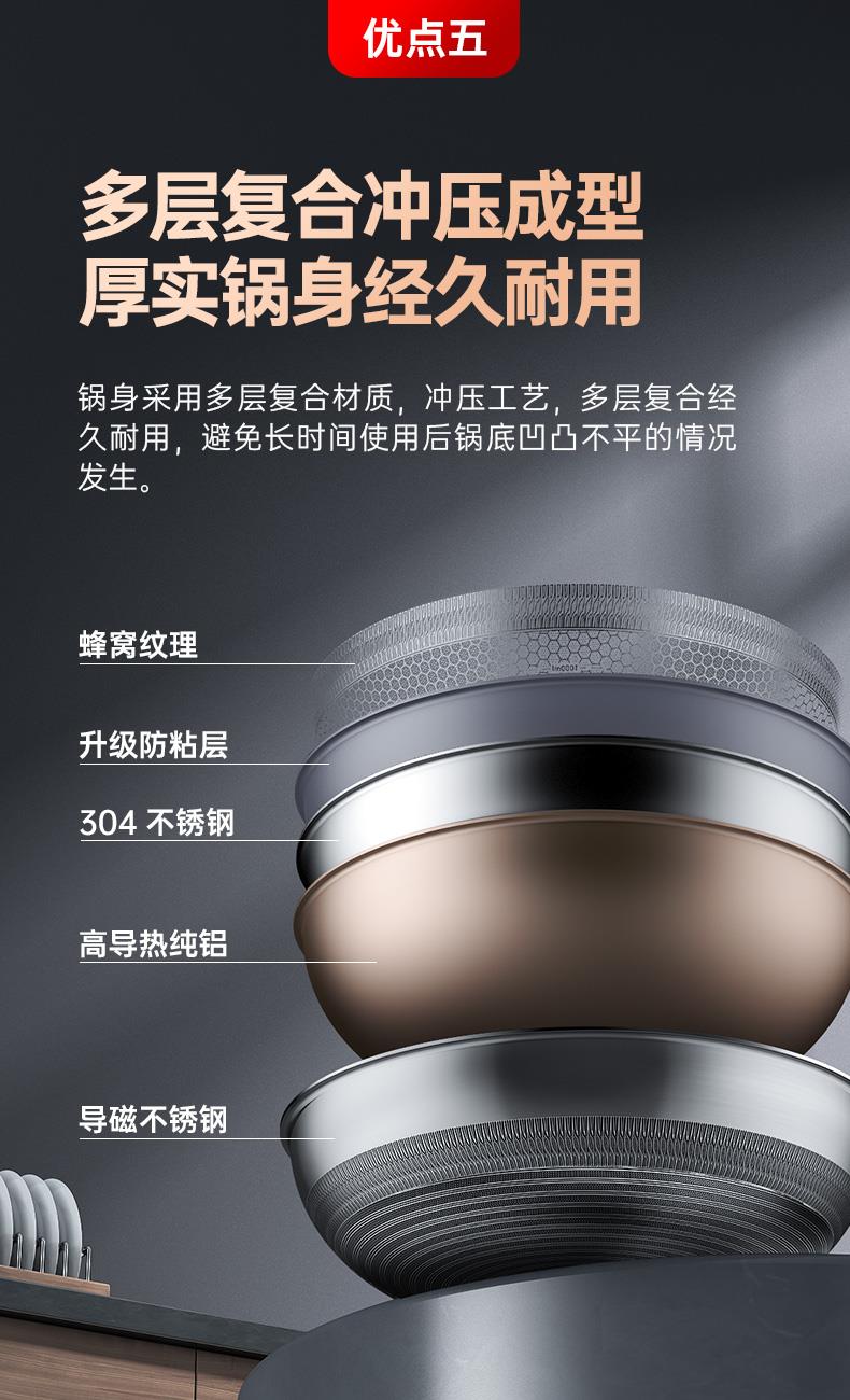 ◎优选304不锈钢健康安全有保障:锅体采用304食品级不锈钢材质,烹饪过程中不析出有害物质,家人放心使用。