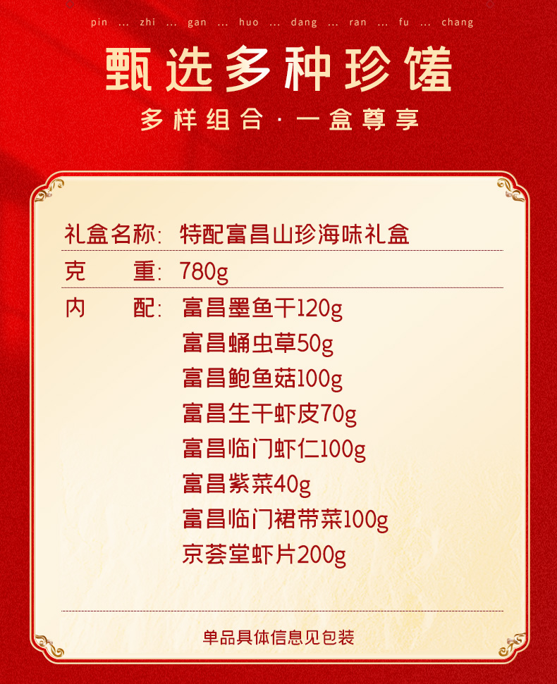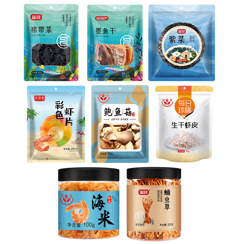 【富昌】墨鱼干120g 【富昌】生干虾皮70g(袋装) 【富昌】临门虾仁100g 【富昌】蛹虫草50g 【富昌】鲍鱼菇100g 【富昌】紫菜40g 【富昌】临门裙带菜100g 【富昌】京荟堂虾片200g 【富昌】精美礼盒*1