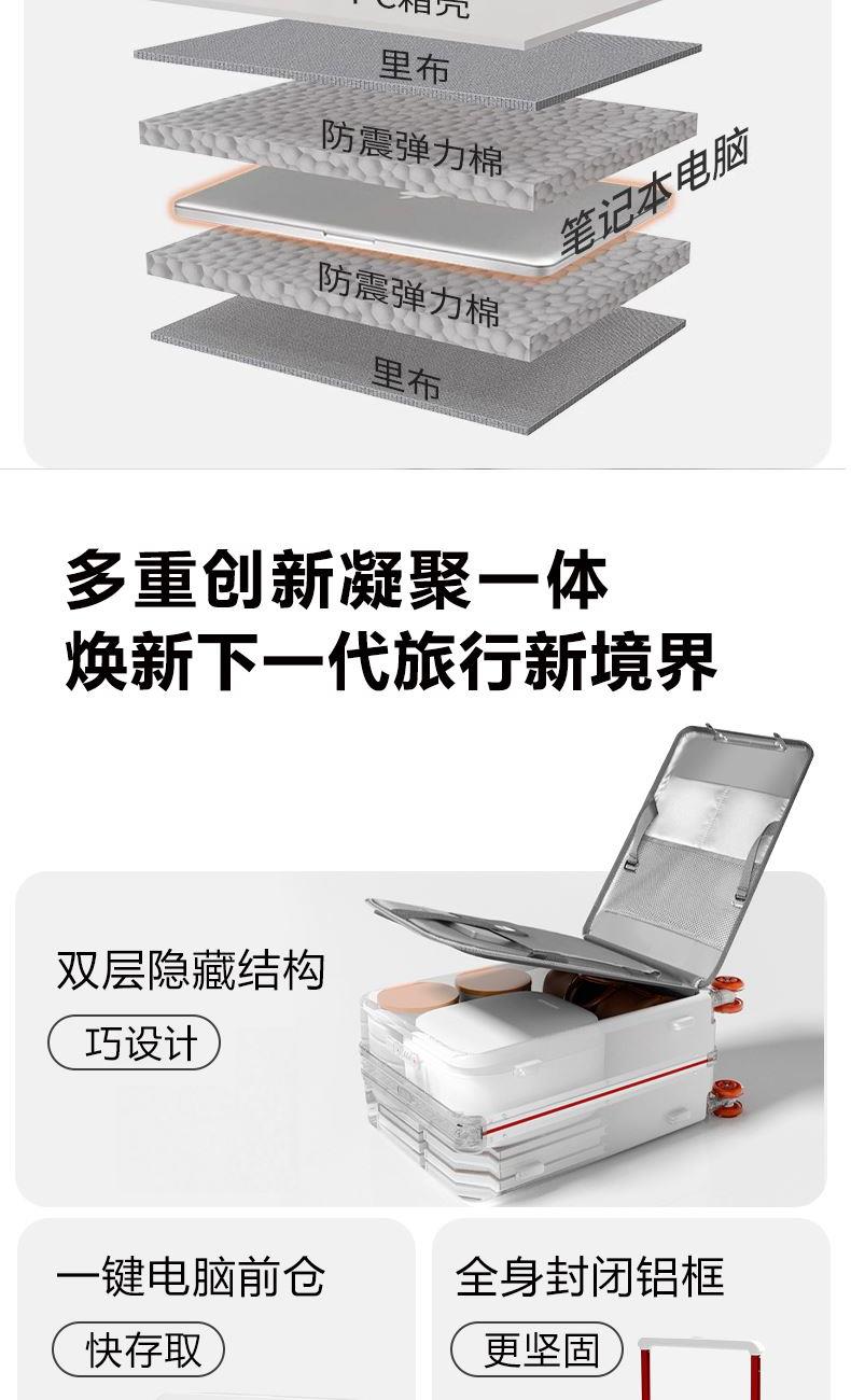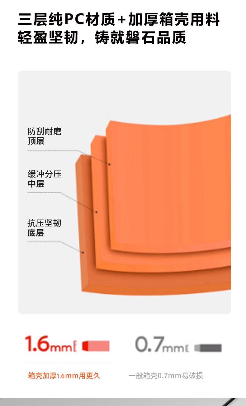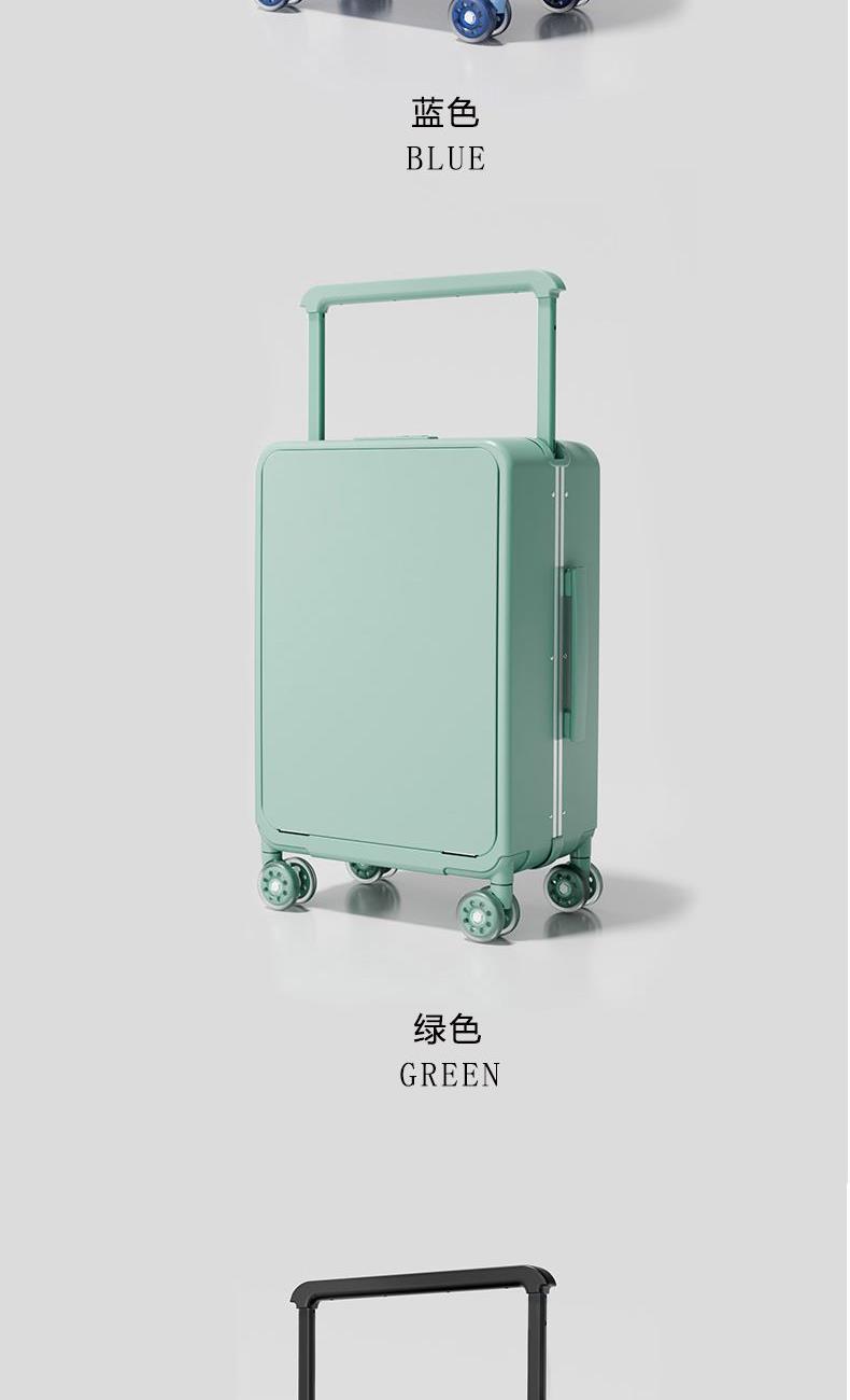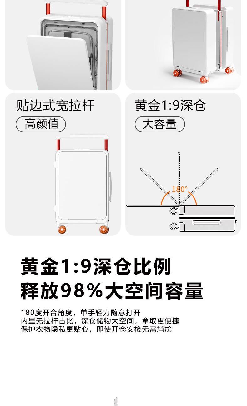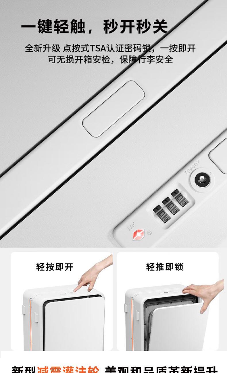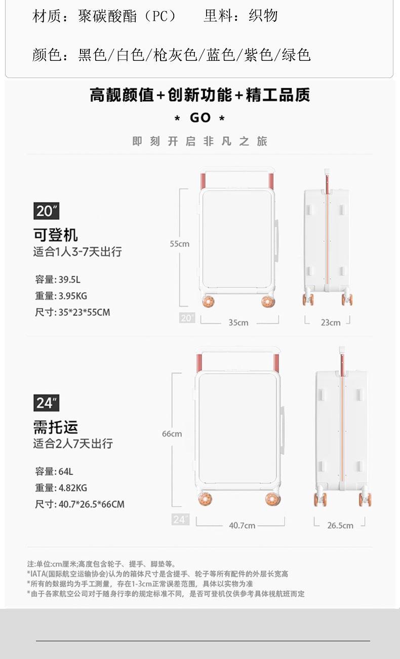 材质:聚碳酸酯(PC) 里料:涤纶 拉杆材质:全铝 尺寸:24英寸 颜色:黑色/白色//枪灰色/蓝色/紫色/绿色 货号:TM-1962 1、凝练极简精工设计,重塑视觉和审美的纯粹之境; 2、两侧贯穿式贴边拉杆,物理提升至98%扩容空间; 3、三节可伸缩铝合金宽拉杆,大幅提升行走稳固平衡; 4、大开合隐藏快捷前仓及多插袋,笔记本、证件随行随拿随放; 5、创新1:9黄金比例双层构造,隐藏式主仓储物更贴心私密; 6、果冻减震式灌注轮,静音顺滑。