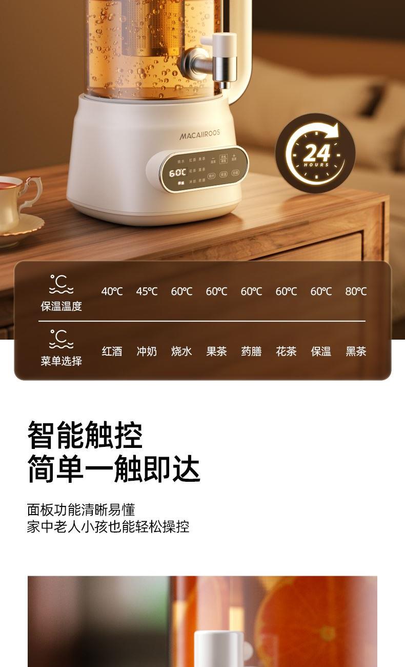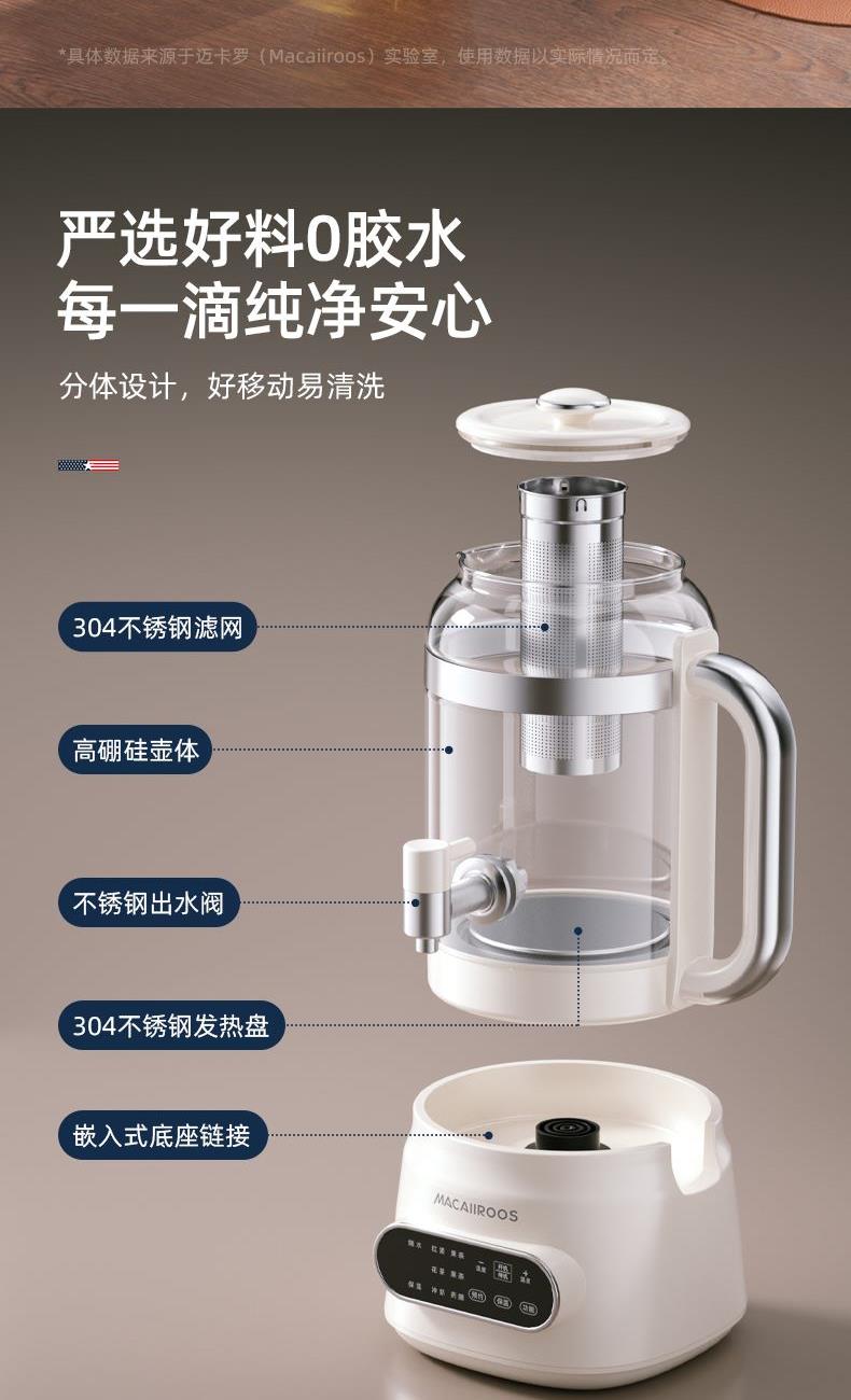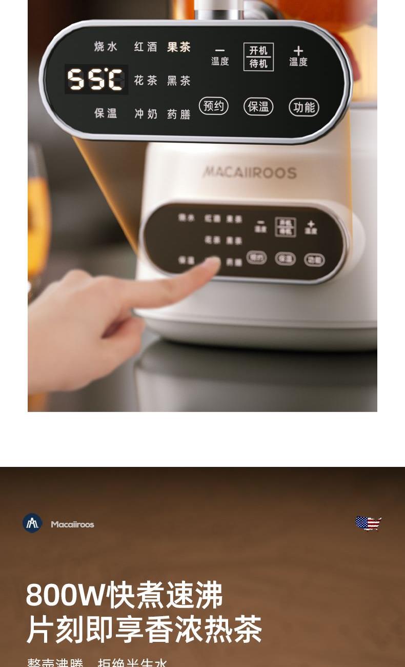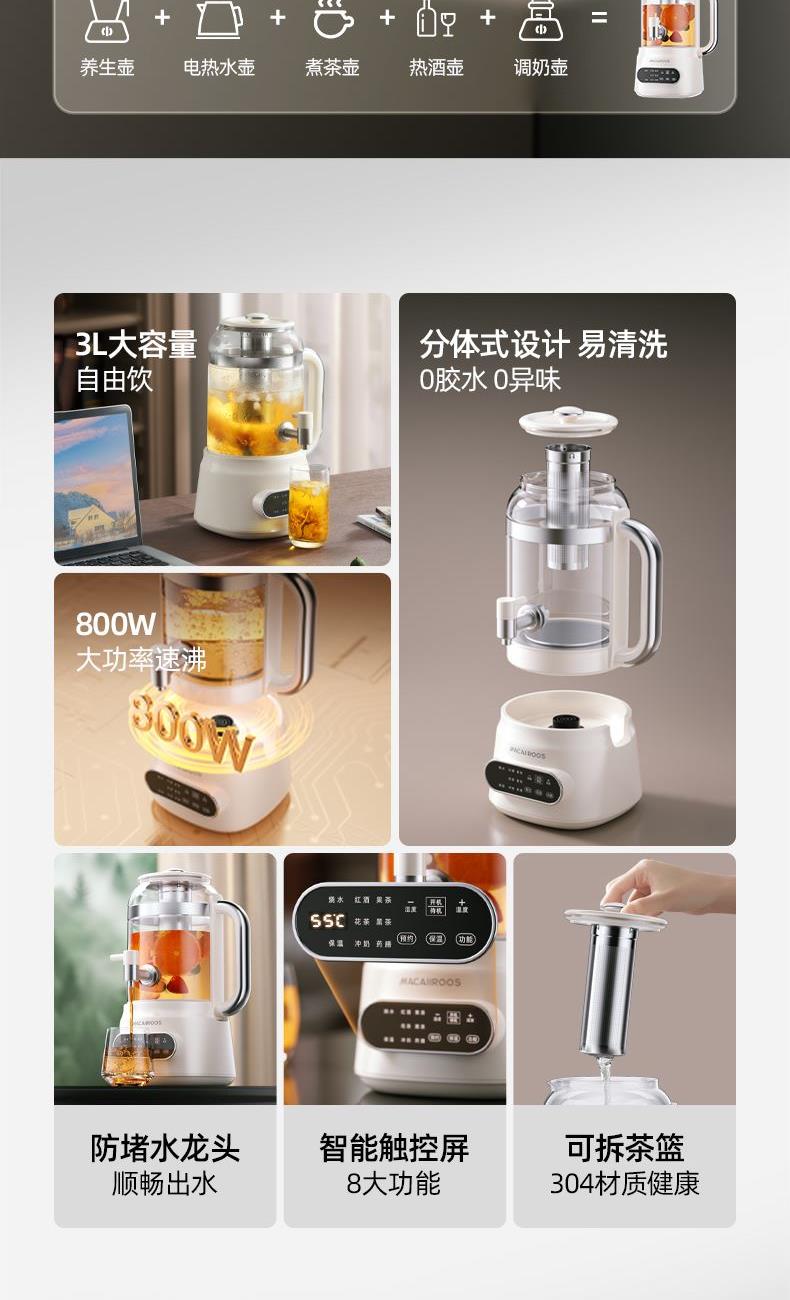 额定功率:800W 额定容量:3.0L 额定电压:220V~ 额定频率:50Hz 产品净重:1.56kg 产品毛重:2.0kg 整箱重量:13.5kg 分体式设计大容量分体壶身,嵌入式底座连接,方便加水清洗; 超大容量3.0L大容量全家桶,适合多人分享,聚会自由续杯; 触控操作8大菜单触控选择,24H智能预约,方便冲奶、烹煮养生花茶; 材质优势304不锈钢发热盘,高硼硅壶体,不锈钢出水龙头; 安全无优龙头阀门出水控制,提壶停止加热,防干烧自动断电;