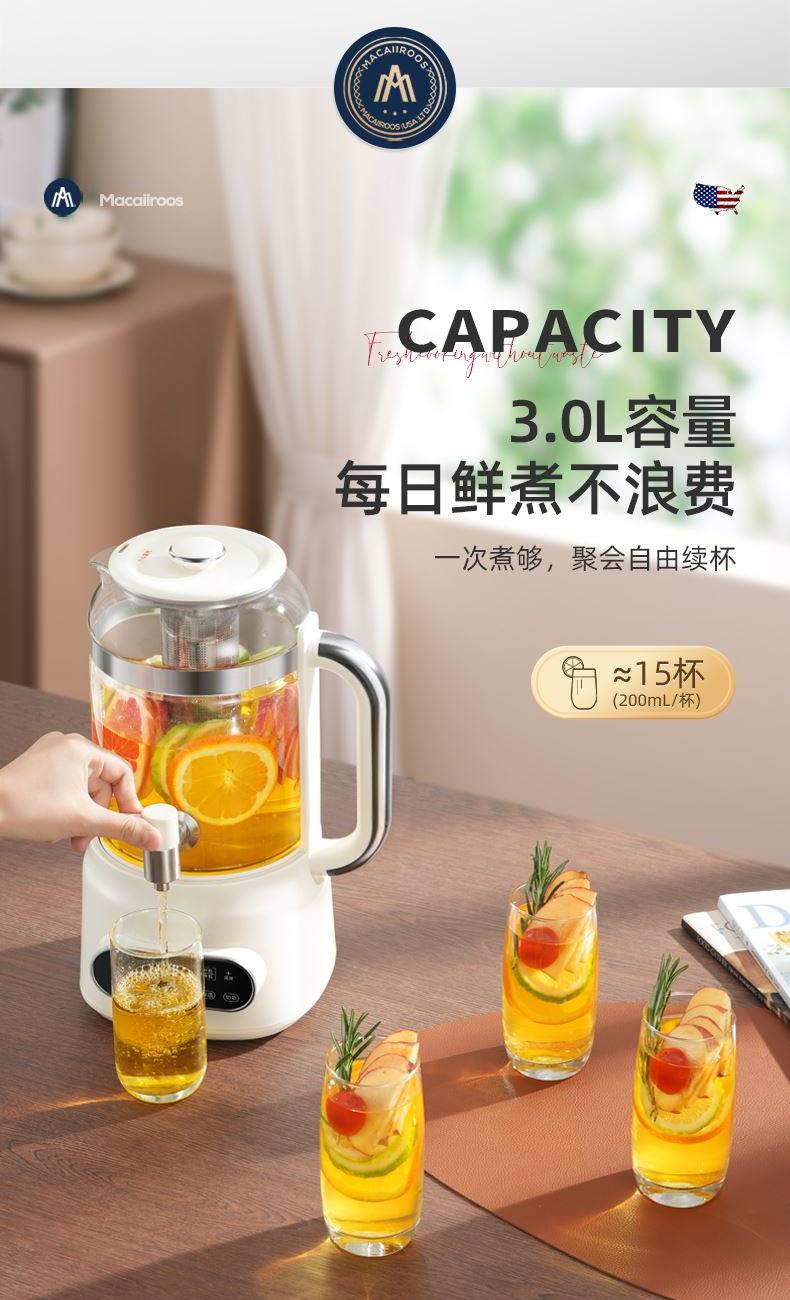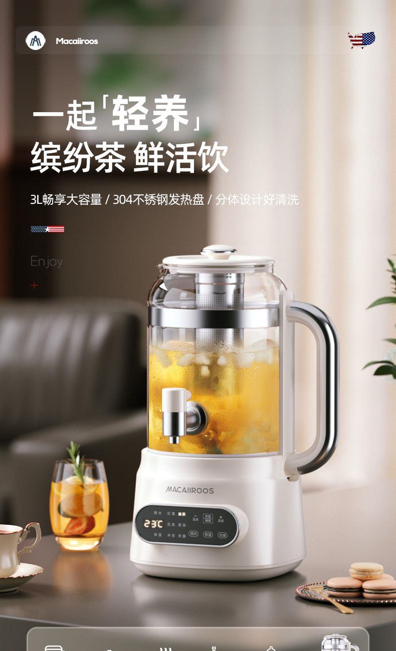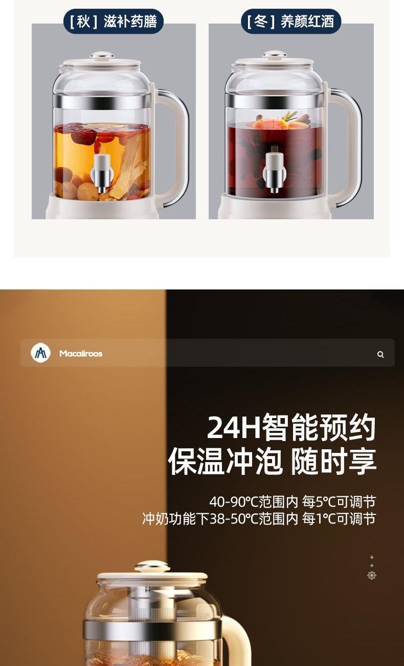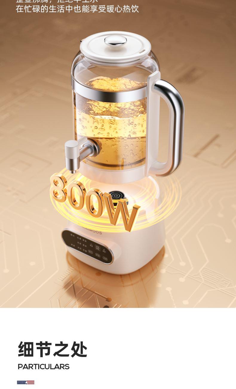 额定功率:800W 额定容量:3.0L 额定电压:220V~ 额定频率:50Hz 产品净重:1.56kg 产品毛重:2.0kg 整箱重量:13.5kg 分体式设计大容量分体壶身,嵌入式底座连接,方便加水清洗; 超大容量3.0L大容量全家桶,适合多人分享,聚会自由续杯; 触控操作8大菜单触控选择,24H智能预约,方便冲奶、烹煮养生花茶; 材质优势304不锈钢发热盘,高硼硅壶体,不锈钢出水龙头; 安全无优龙头阀门出水控制,提壶停止加热,防干烧自动断电;