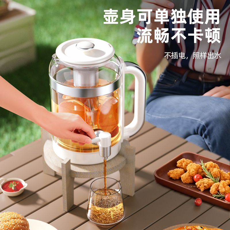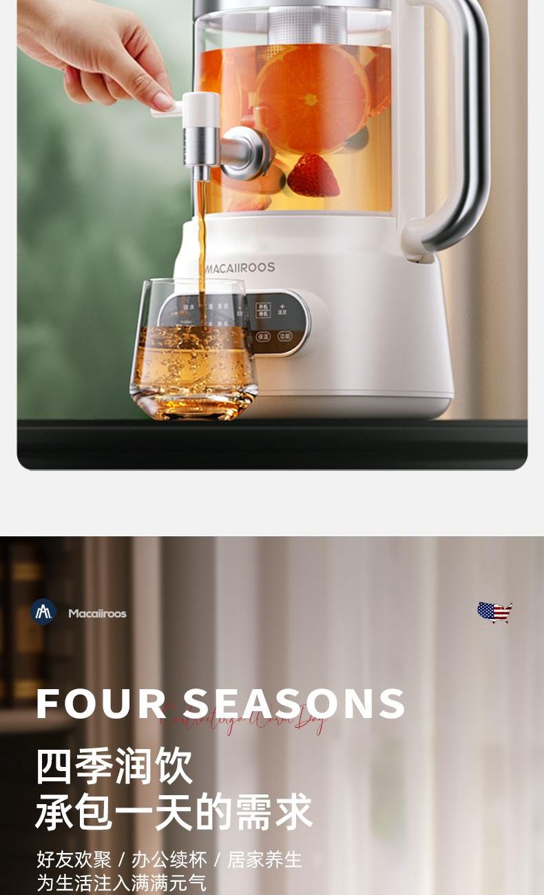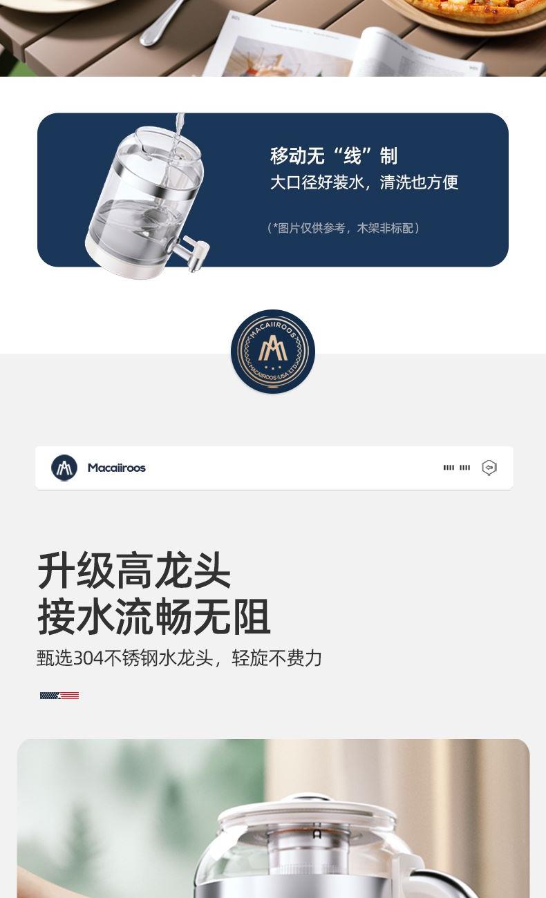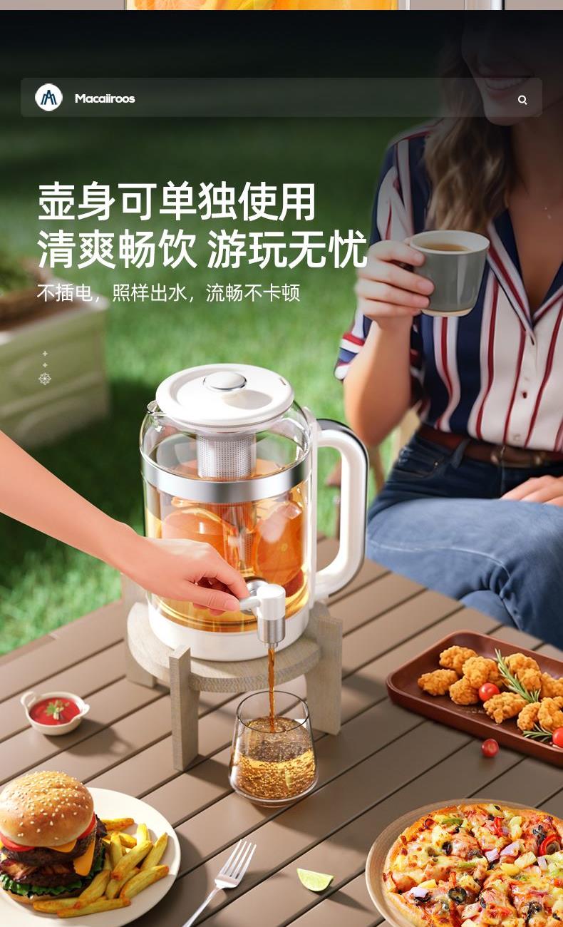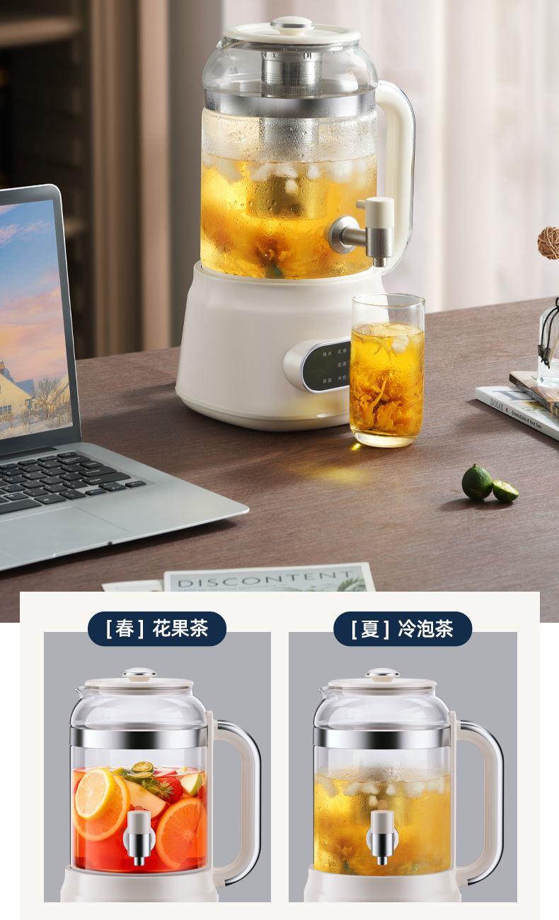 额定功率:800W 额定容量:3.0L 额定电压:220V~ 额定频率:50Hz 产品净重:1.56kg 产品毛重:2.0kg 整箱重量:13.5kg 分体式设计大容量分体壶身,嵌入式底座连接,方便加水清洗; 超大容量3.0L大容量全家桶,适合多人分享,聚会自由续杯; 触控操作8大菜单触控选择,24H智能预约,方便冲奶、烹煮养生花茶; 材质优势304不锈钢发热盘,高硼硅壶体,不锈钢出水龙头; 安全无优龙头阀门出水控制,提壶停止加热,防干烧自动断电;