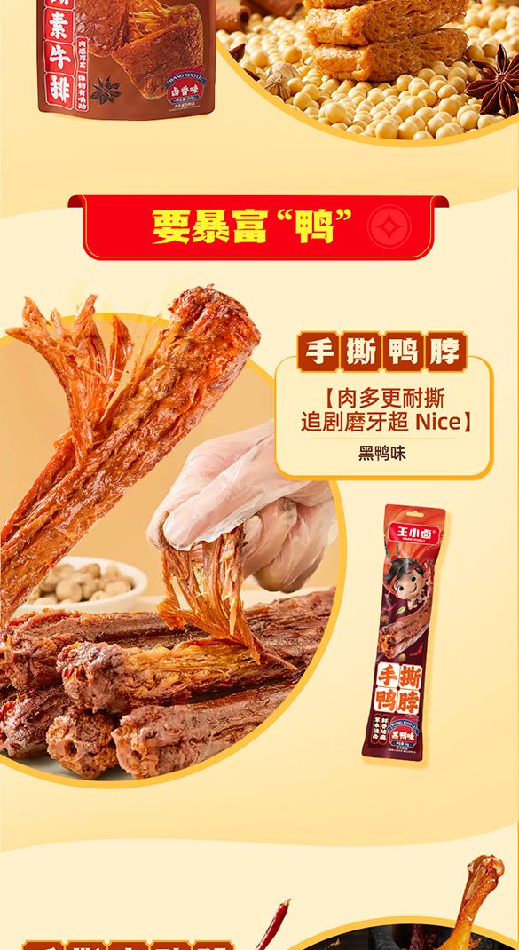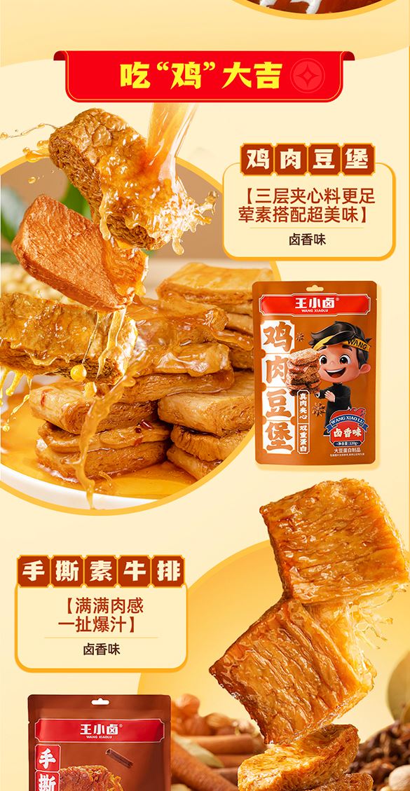 王小卤虎皮凤爪-卤香-68g 王小卤鸡肉豆堡-卤香-120g 王小卤鸭翅根-甜辣-75g 王小卤鸭脖-黑鸭-65g 王小卤素牛排-卤香-200g 王小卤手撕鸭腿-香辣-100g