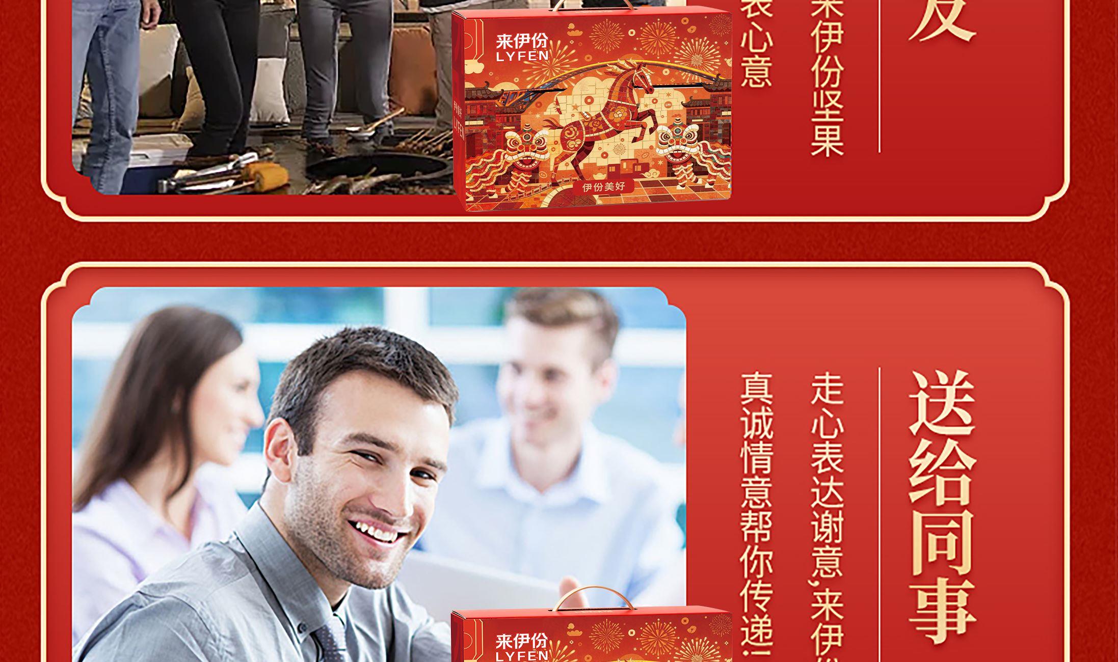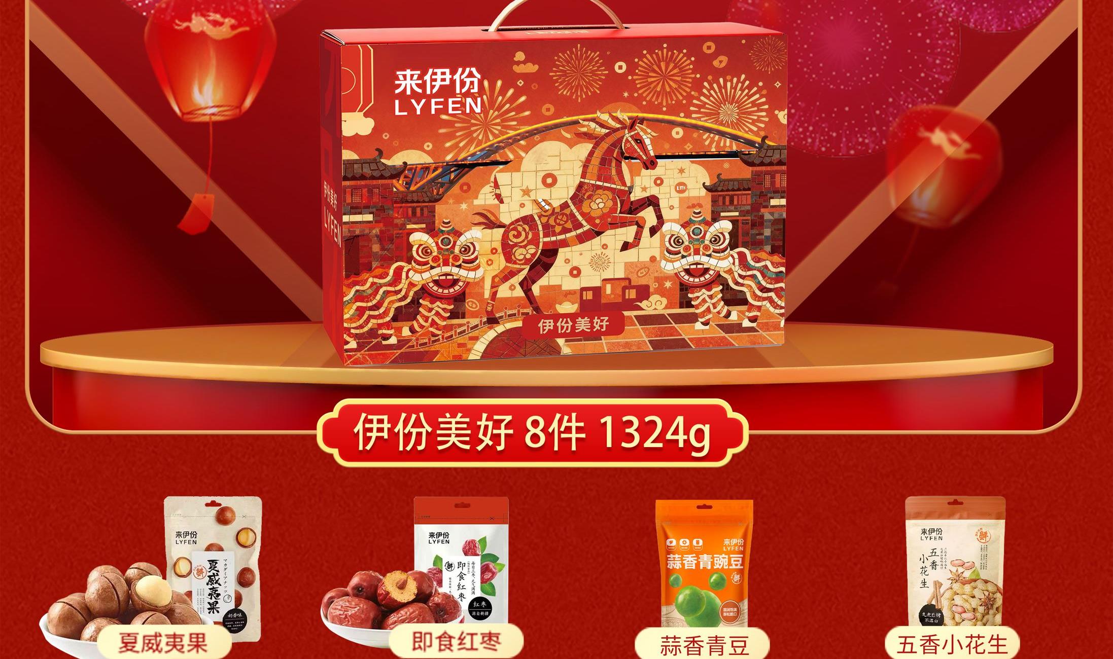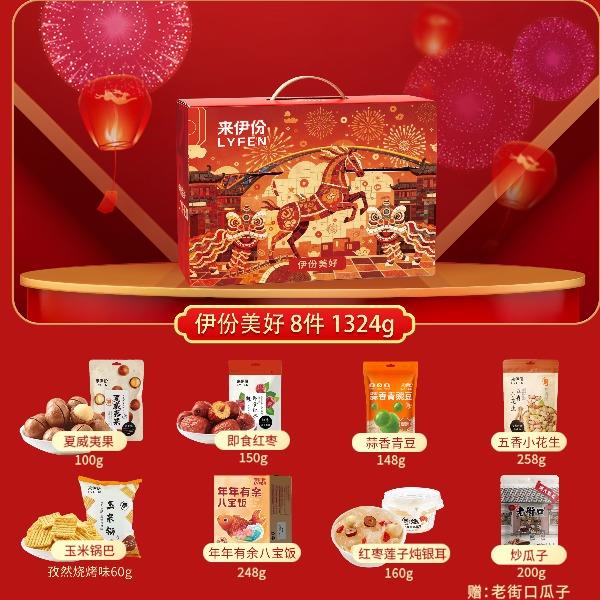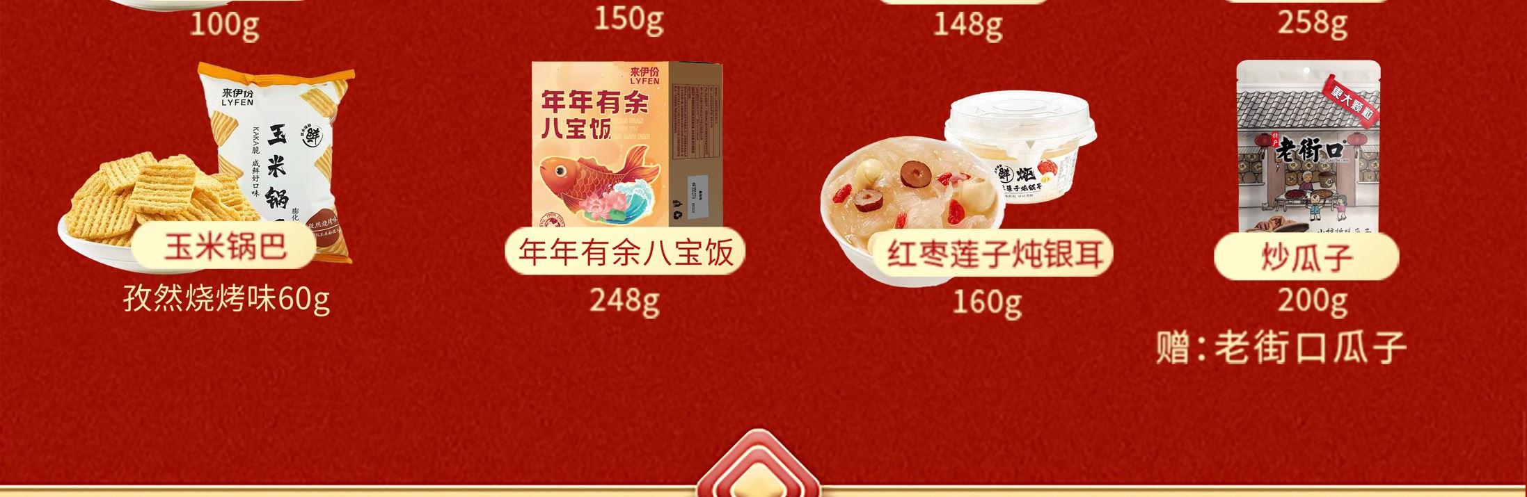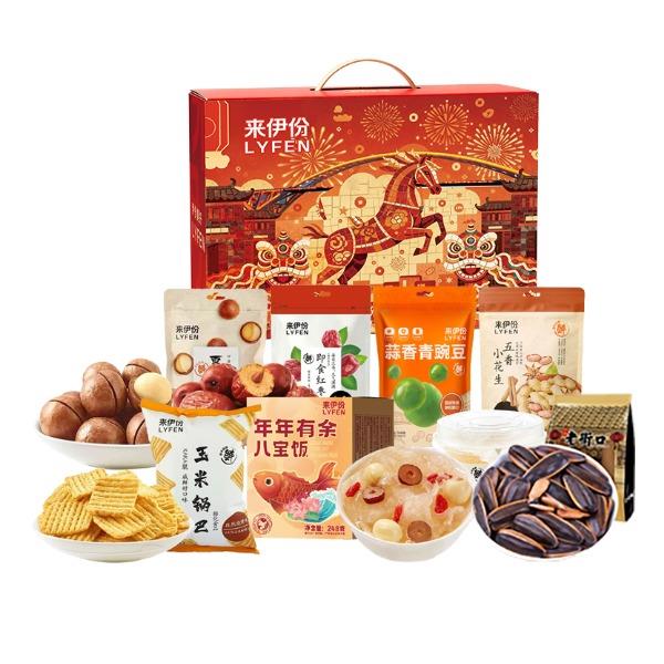 来伊份作为上市企业 产品线非常丰富,强调“新鲜”零食作为保障 产品设计贴心,方便携带 礼盒尺寸:370*120*270mm 内容物:夏威夷果100g 五香小花生258g 蒜香青豆148g 即食红枣150g 玉米锅巴(孜然烧烤味) 60g 红枣莲子炖银耳160g 年年有余八宝饭248g 赠:老街口瓜子200g