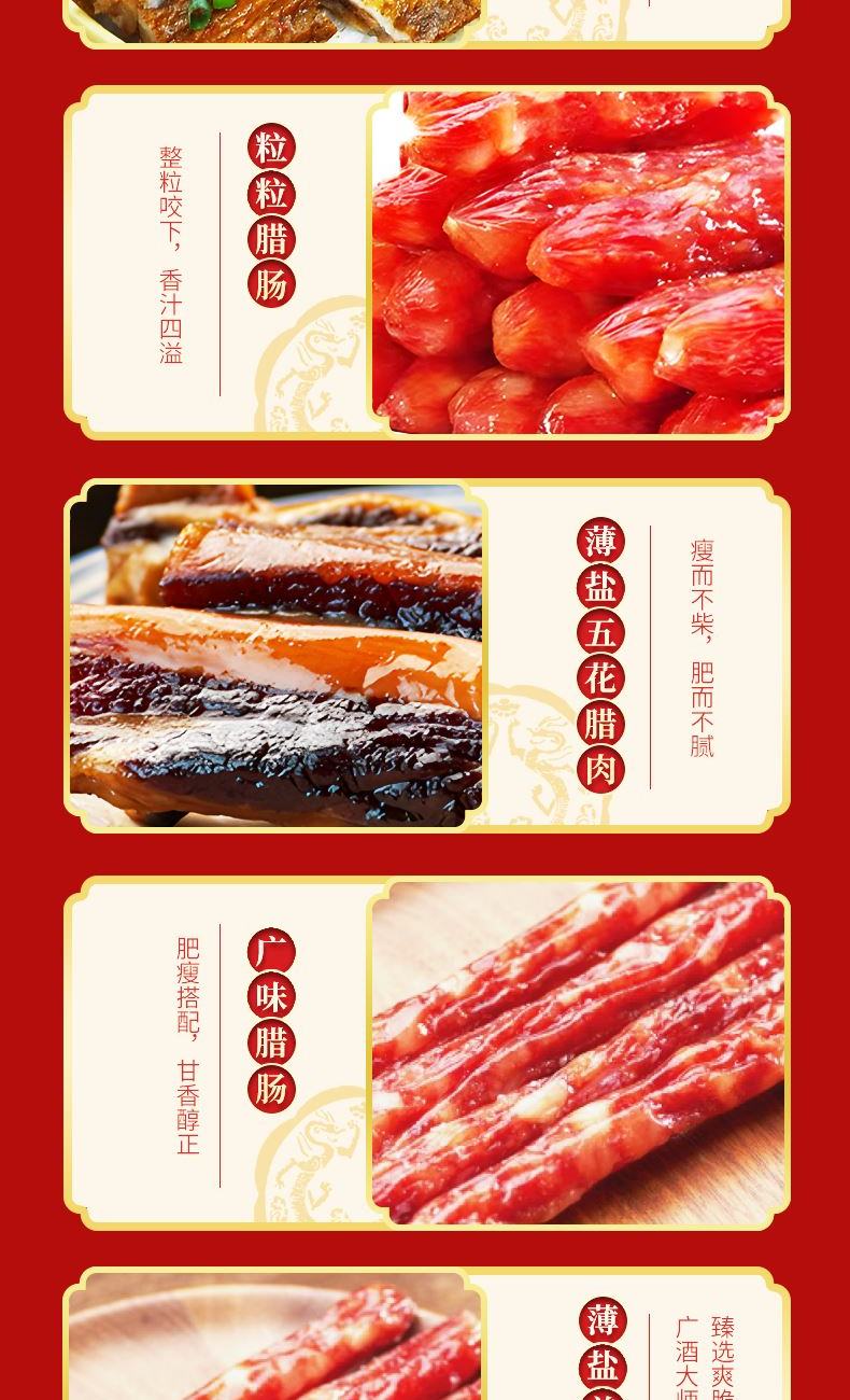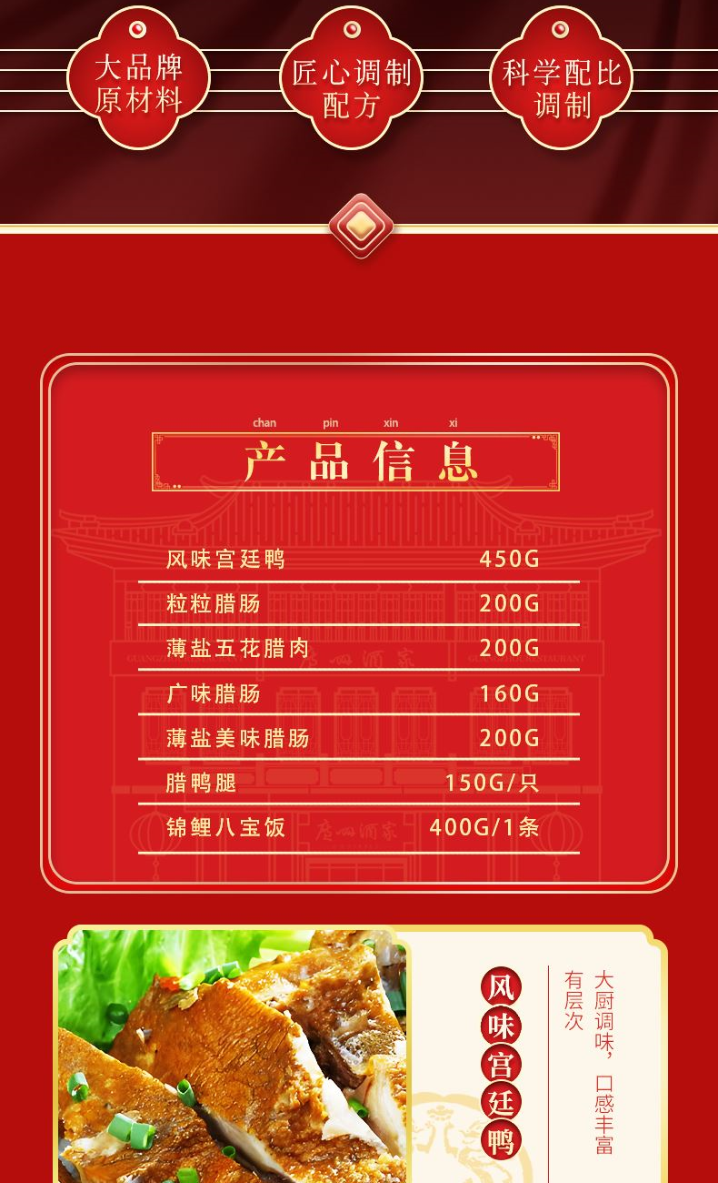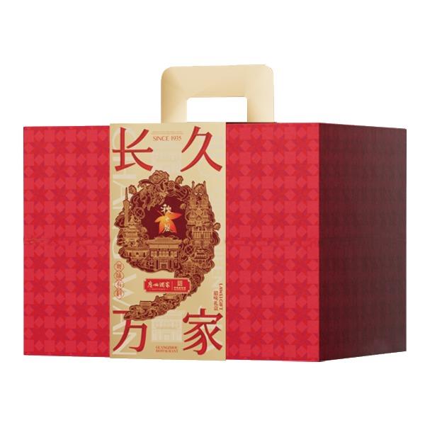 “食在广州” 承百年广府匠心,选上乘天然原料,遵古法生晒工艺 铸就一味甘香醇厚、寓意吉祥的岭南家宴至味 礼盒尺寸:28*20*20cm 内容物:粒粒腊肠200g 广味腊肠160g 薄盐五花腊肉200g 薄盐美味腊肠200克 风味宫廷鸭450g 腊鸭腿150g/只 赠:嘉庆斋锦鲤八宝鱼
