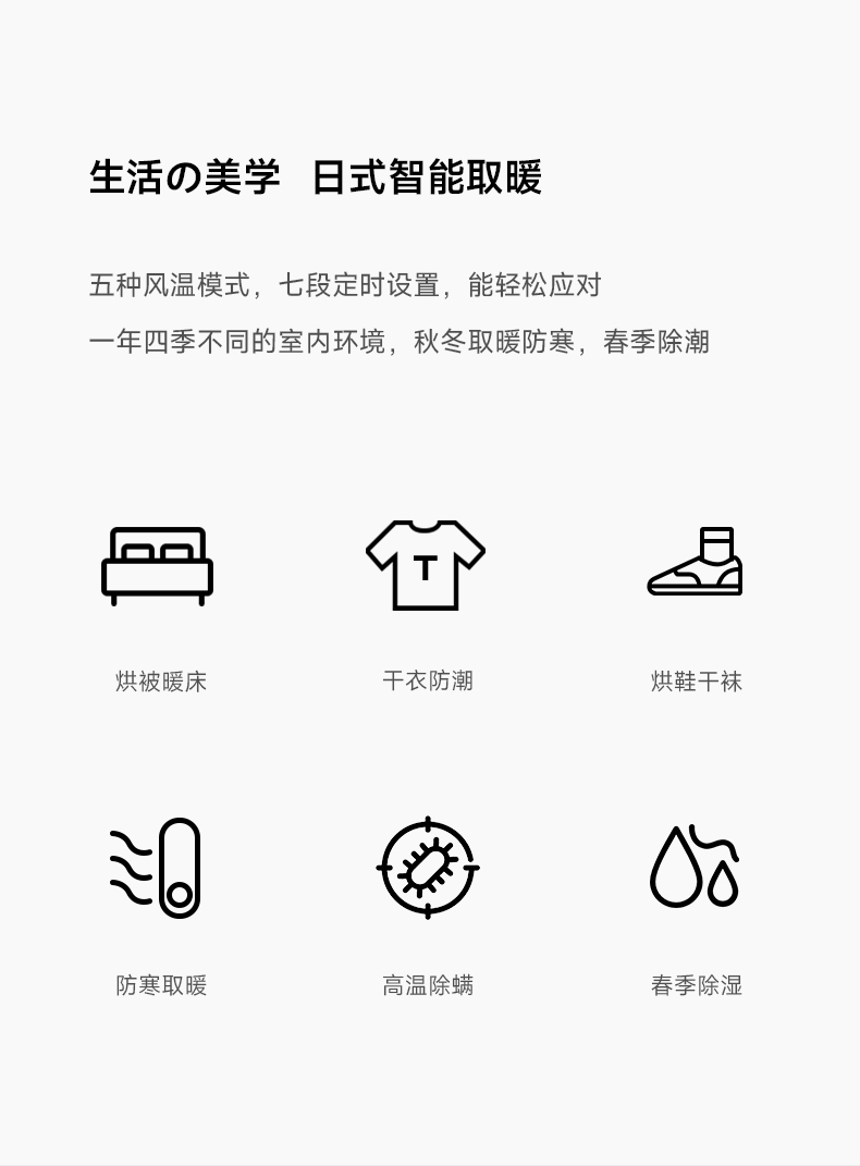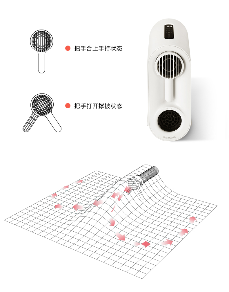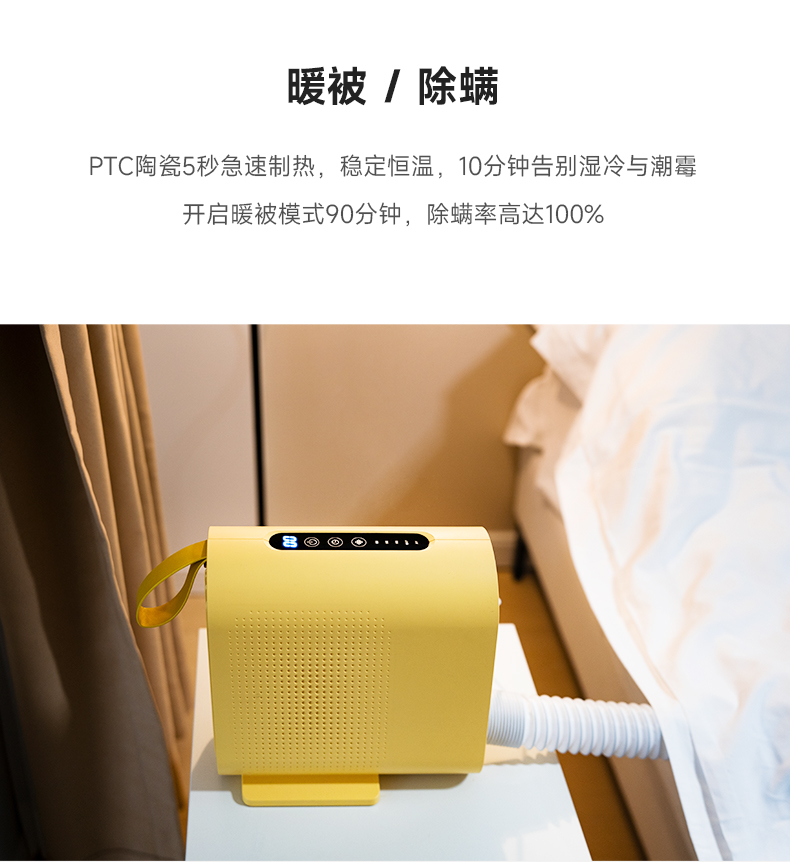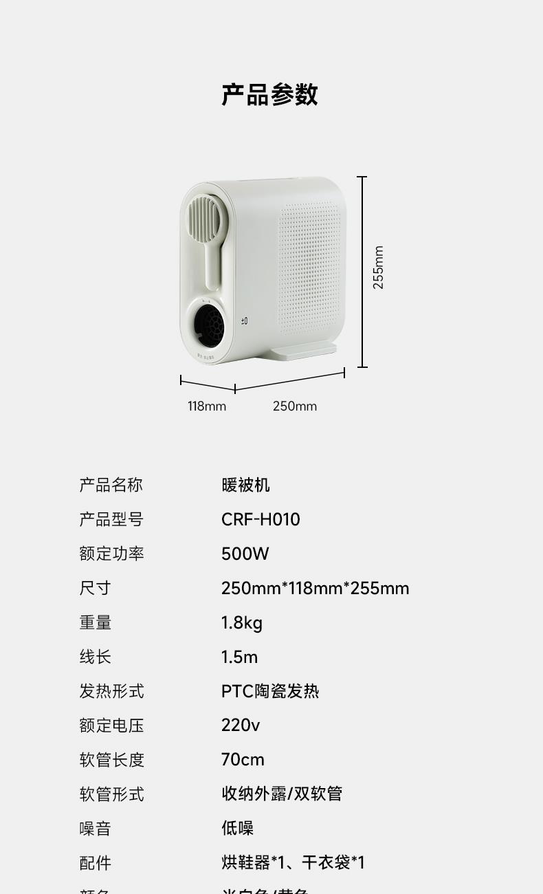 重量:1.8kg 线长:1.5m 发热形式:PTC陶瓷发热 额定电压:220V 软管长度:70cm 软管形式:收纳外露/双软管 噪音:低噪 配件:烘鞋器*1 干衣袋*1 一拉一放,快速暖被 PTC陶瓷发热,500W高效导热,稳定恒温 轻松烘干除湿 恒温热风,除螨除湿防霉 救急干衣,告别雨季衣服难干有异味 烘鞋除味保持脚部干爽,摆脱湿气异味 冬日取暖,追剧工作好伴侣