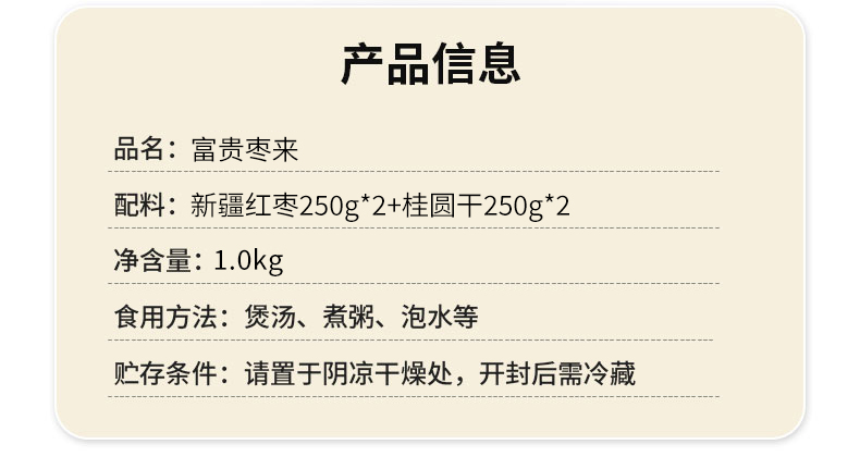产品配置: 新疆红枣250g*2 泰国桂圆250g*2 净含量:1.0Kg 礼盒尺寸:44*11*27cm