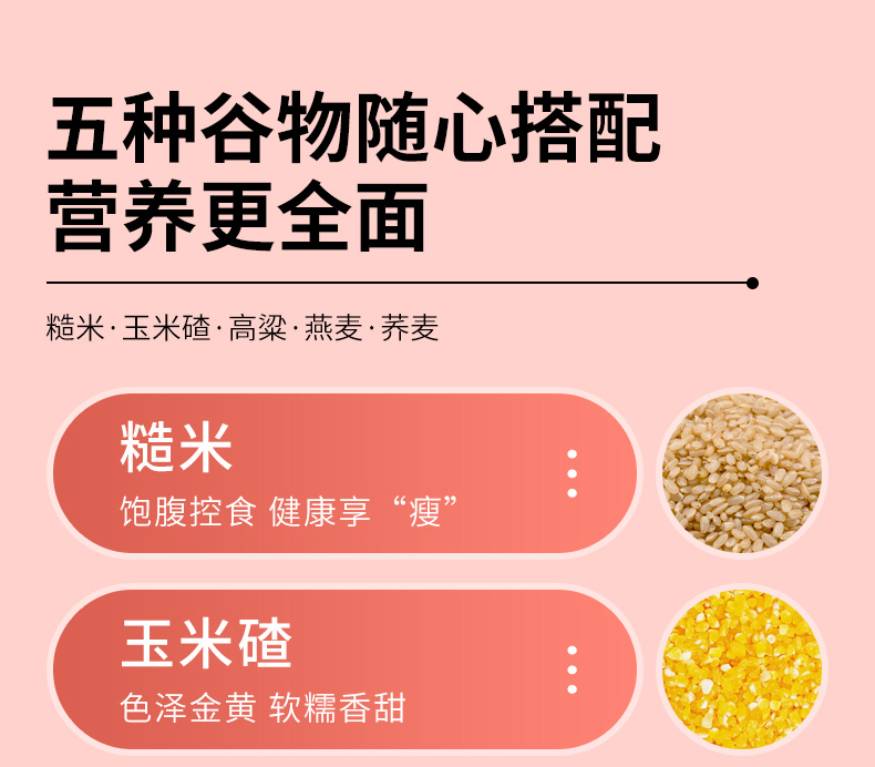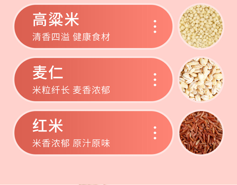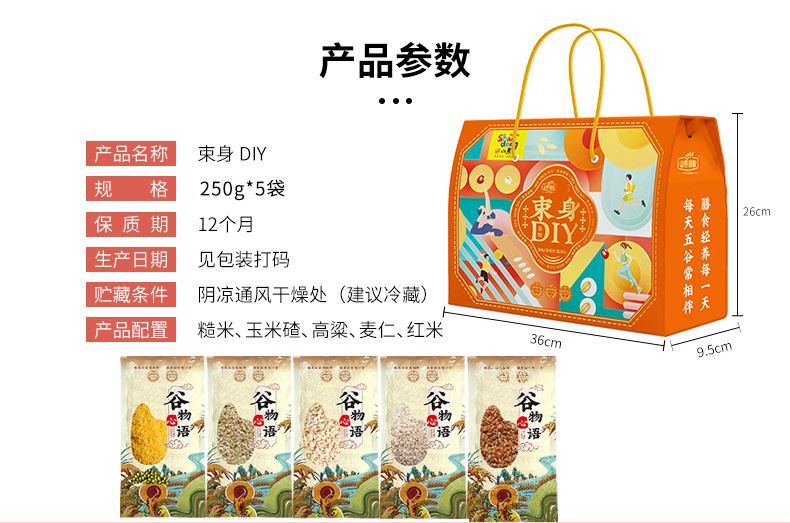 产品规格:糙米、玉米碴、高粱米、麦仁、红米(250g*5袋) 盒尺寸:36*9.5*26cm 箱尺寸:60*37.5*54 体 积:0.122方 箱重量:19.4kg