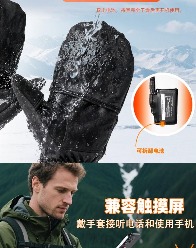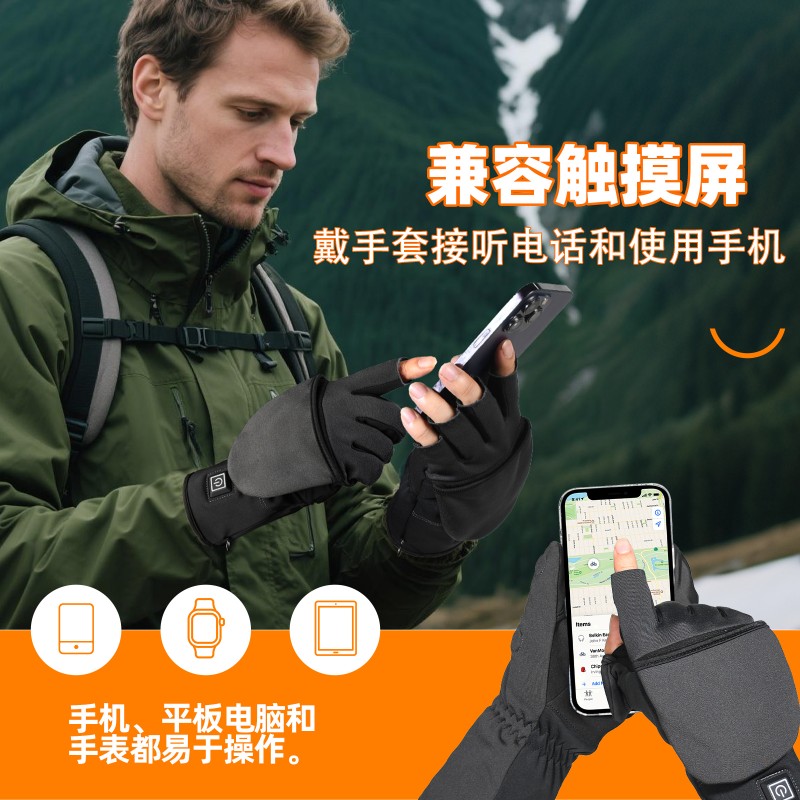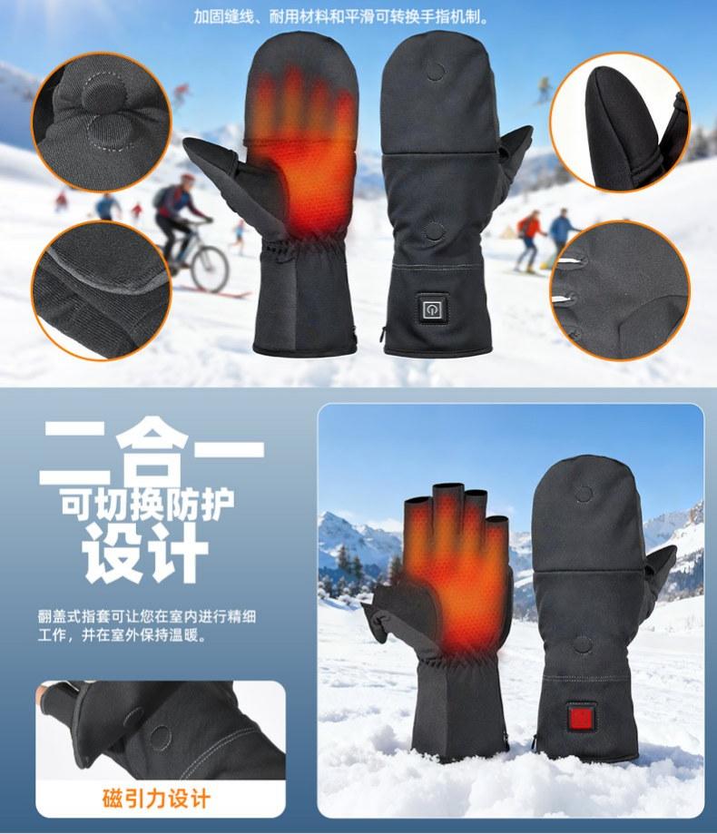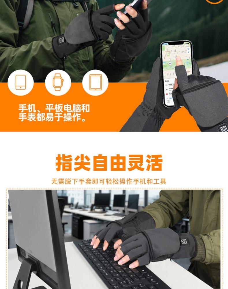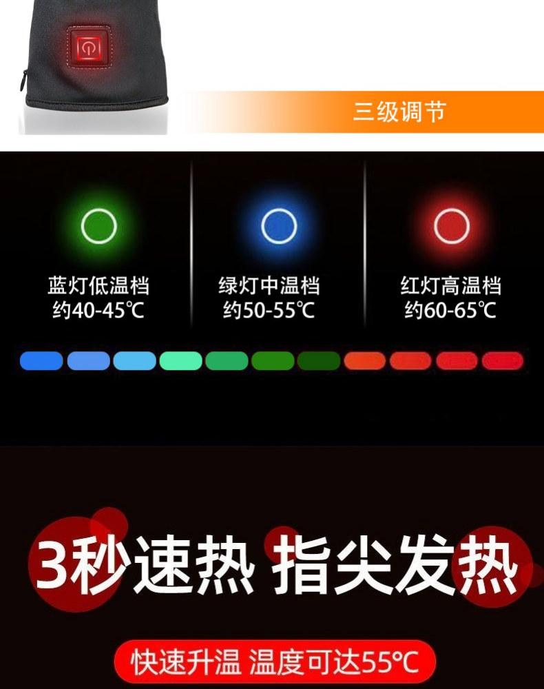 1;开机速热:3档温控,绿色45度,蓝色50度,红色55度;一键调节,智能温控;三种加热设置可供选择平衡温暖度和电池寿命。气温骤降,作为一款专为秋冬研发的手套,分开手指和全包指套设计结合,并提供防寒保护。指尖自由灵活无需脱下手套即可轻松操作手机和工具;