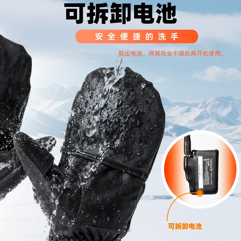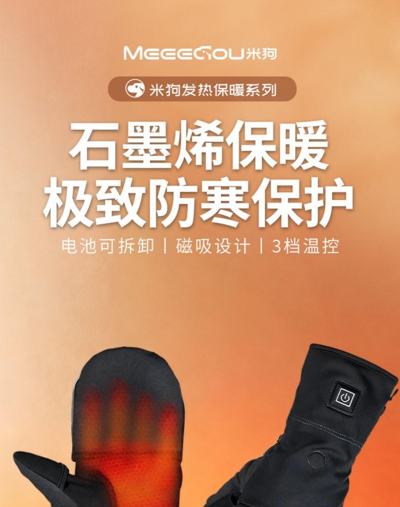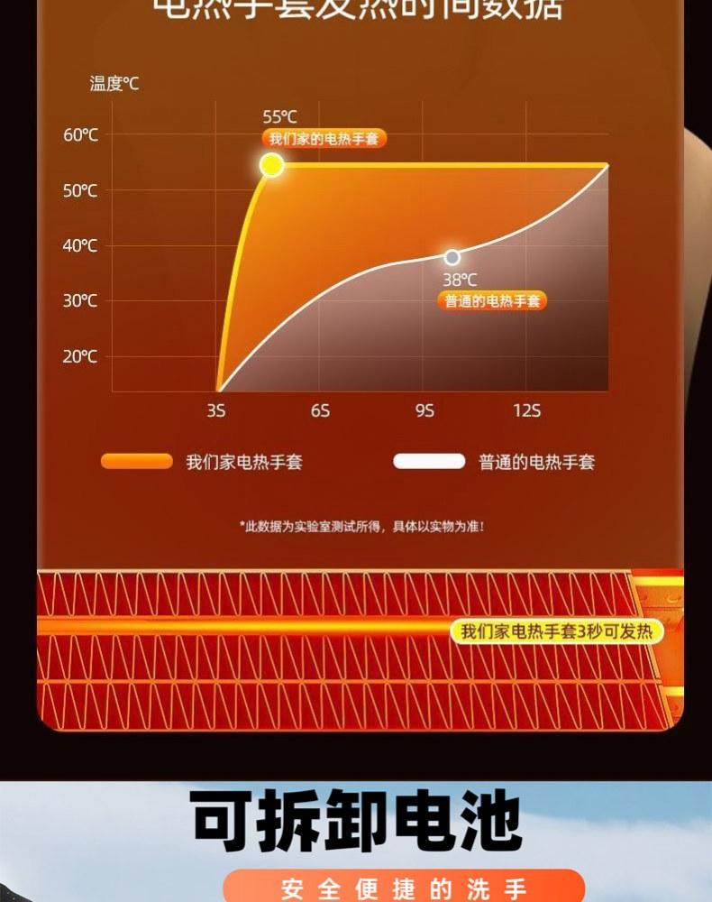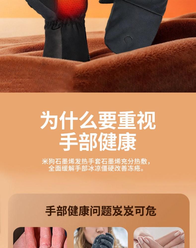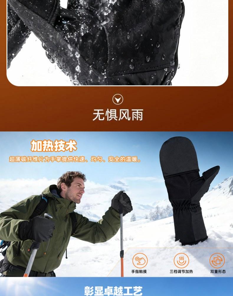1;开机速热:3档温控,绿色45度,蓝色50度,红色55度;一键调节,智能温控;三种加热设置可供选择平衡温暖度和电池寿命。气温骤降,作为一款专为秋冬研发的手套,分开手指和全包指套设计结合,并提供防寒保护。指尖自由灵活无需脱下手套即可轻松操作手机和工具;