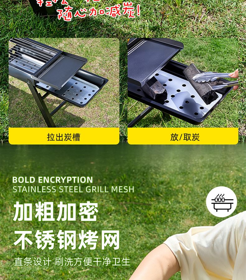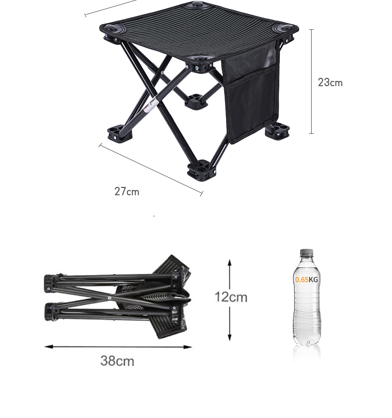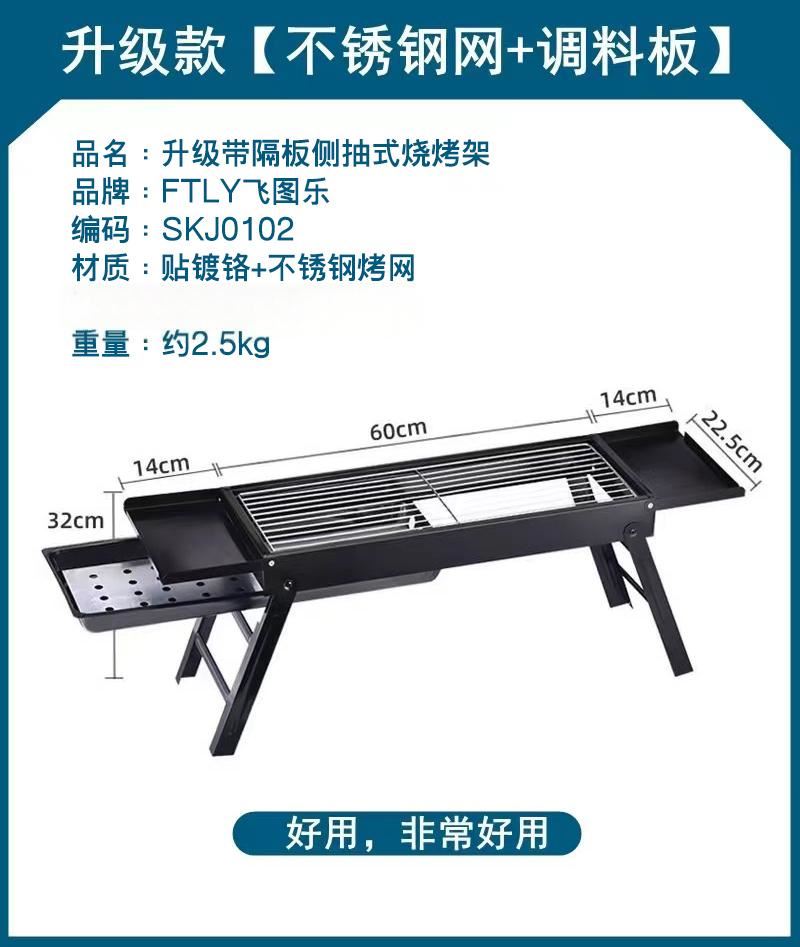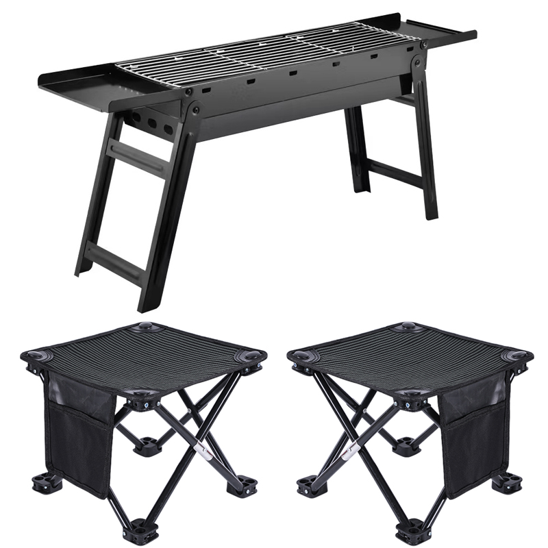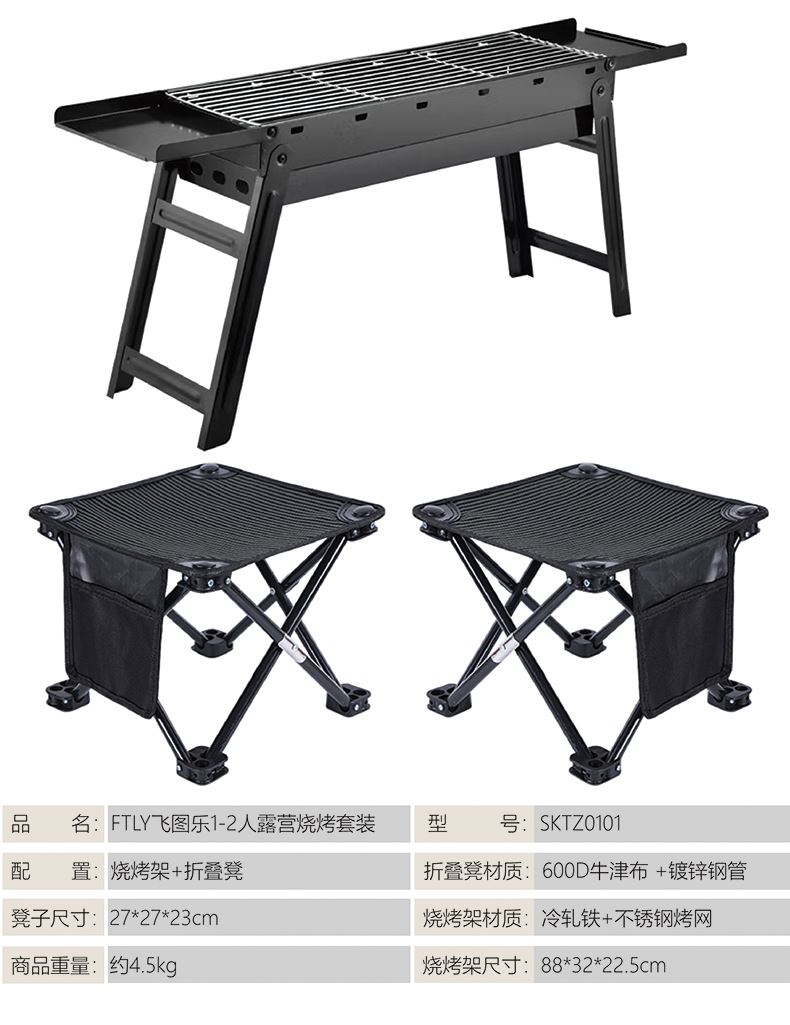 折叠凳材质:600D牛津布 +镀锌钢管 烧烤架材质:冷轧铁+不锈钢烤网 凳子尺寸:27*27*23cm 烧烤架尺寸:88*32*22.5cm 商品重量:约4.5kg