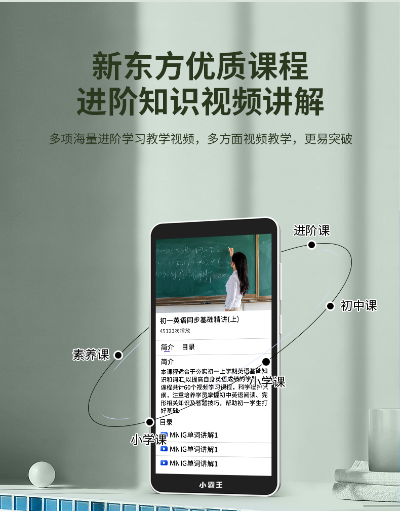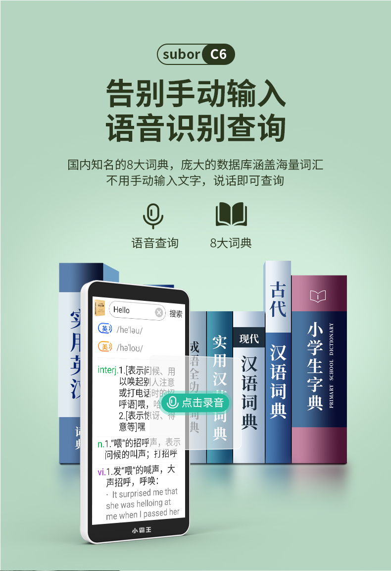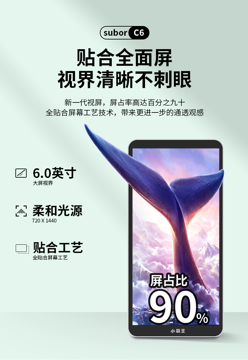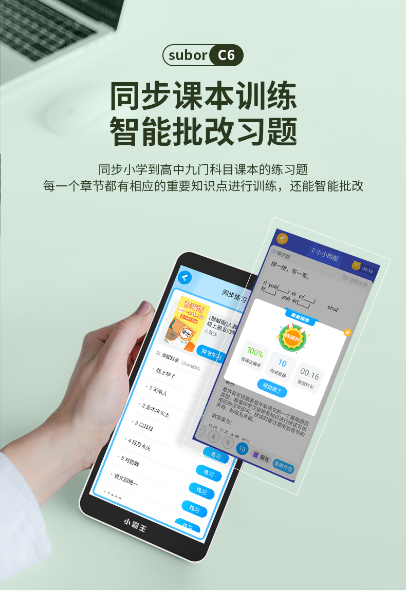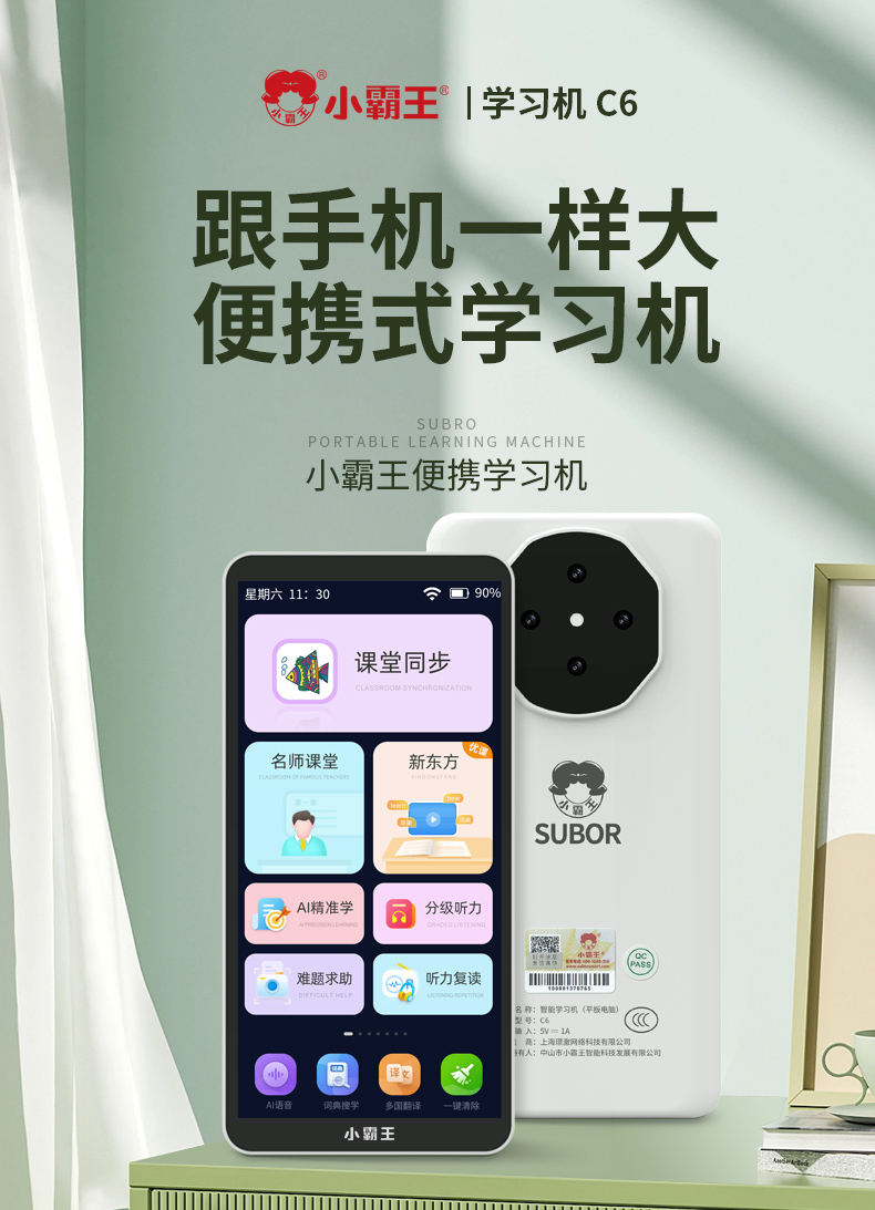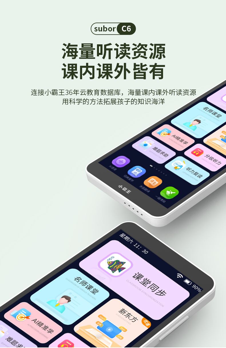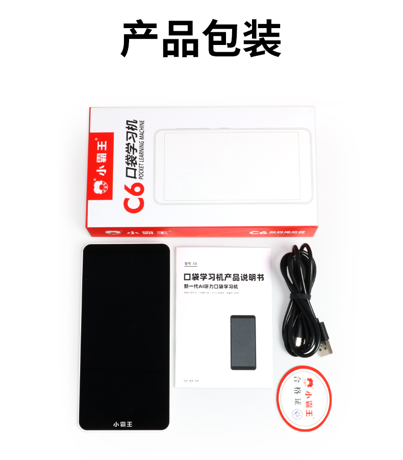 清单:学习机C6+充电线+说明书+包装盒 屏幕尺寸:6.0英寸 分辨率:720*1440 电池:2500mAh 内存和储存:16+128GB 支持拓展128G 摄像头:后置500W 网络:2.4GWiFi 产品尺寸:159*77.8mm 源于纳米盒APP,正版教材,原版真人发音,可免费在线吸在,正版教材免费试用;进阶课堂,进阶幼稚精讲知识视频,幼儿教育、小学提升、初中精讲、高中冲刺;同步AI学,查缺补漏巩固知识;手机一样大小,方便随身携带;贴合全面屏,视界清晰不刺眼;名师精讲课堂,免费重复学习;遇难题拍照上传,秒推送解析思路;同步课本训练,智能批改练习题;20种语言互译,一键语音翻译;告别手动输入,语音识别查询;海量听读资源,课内课外皆有