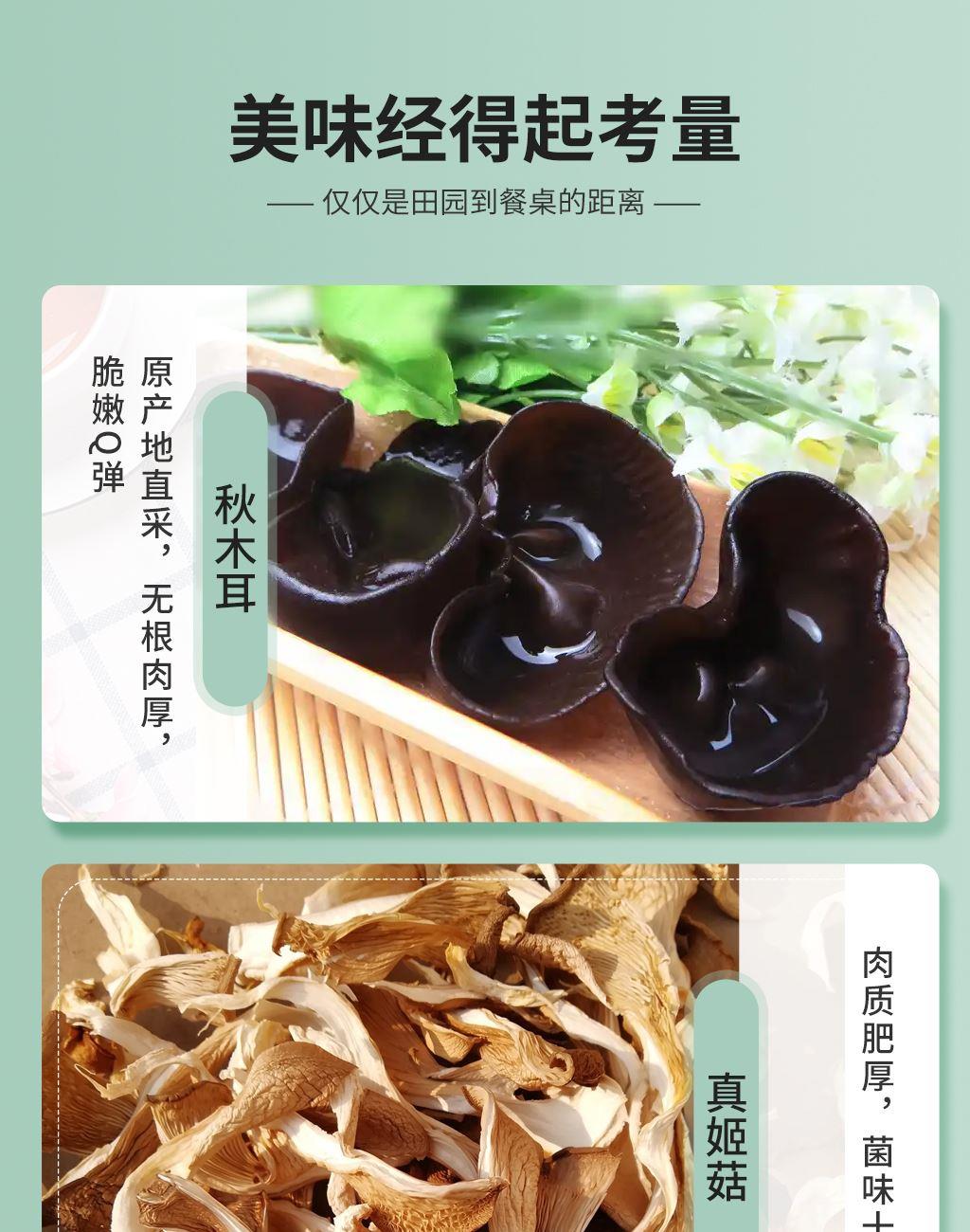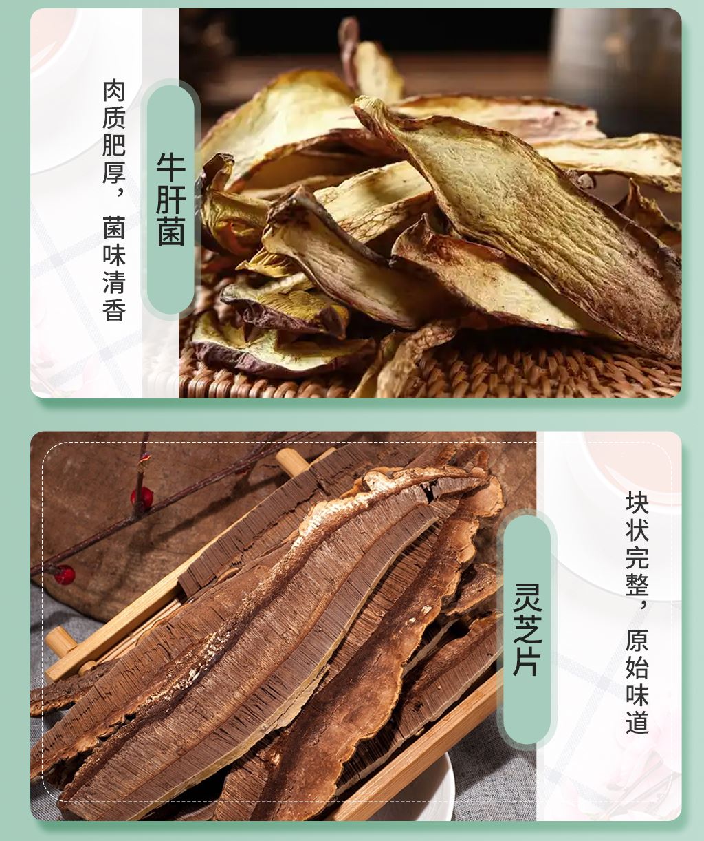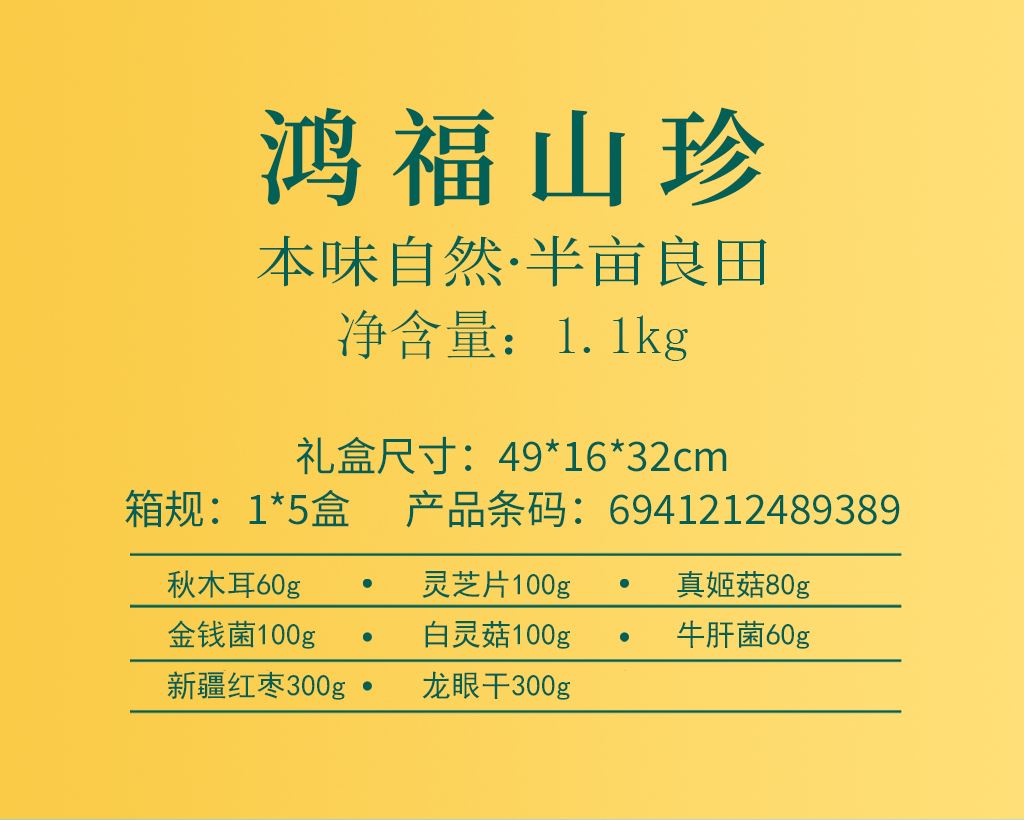 产品配置: 野生秋木耳60g 精选灵芝片100g 精选真姬菇80g 野生金钱菌100g 精选白灵菇100g 野生牛肝菌60g 泰国龙眼干300g 新疆红枣300g 净含量:1.1kg 礼盒尺寸:49*16*32cm 跨越山川湖海,严选各地食材,珍有菌菇、滋补干货齐聚 一盒,将自然风味与健康好礼共纳其中。