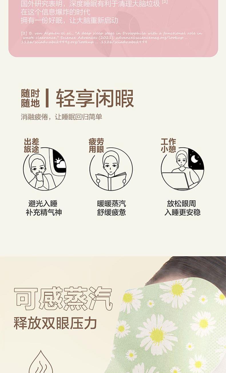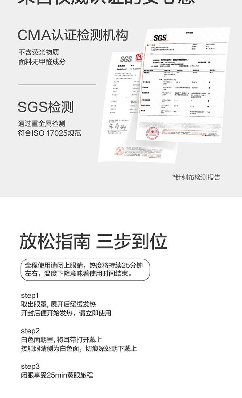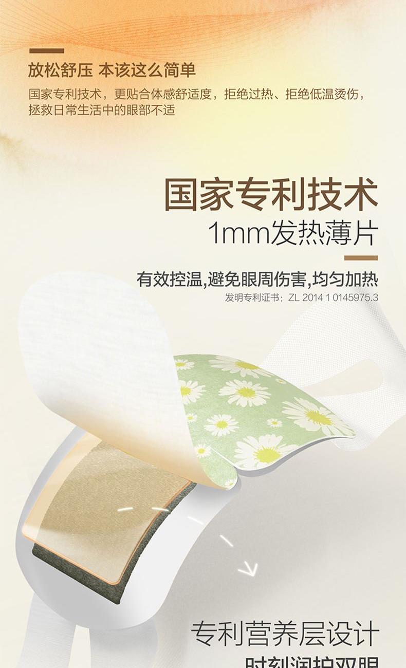规格:1片/袋 10袋/盒 香型:洋甘菊 保质质:3年 1.可感绵密蒸汽,释放眼部压力。 2.持续20分钟以上有效控温,稳定升温不灼热,营养层添加SOD超氧化物歧化酶、透明质酸等营养物质,温润眼周肌肤。 3.添加天然萃取精油,多种香型可选,重构你的睡眠想象。 4.小云朵棉质面料、弱弹力耳挂、贴合工艺设计,呵护眼周脆弱肌肤,静享舒适体验。
