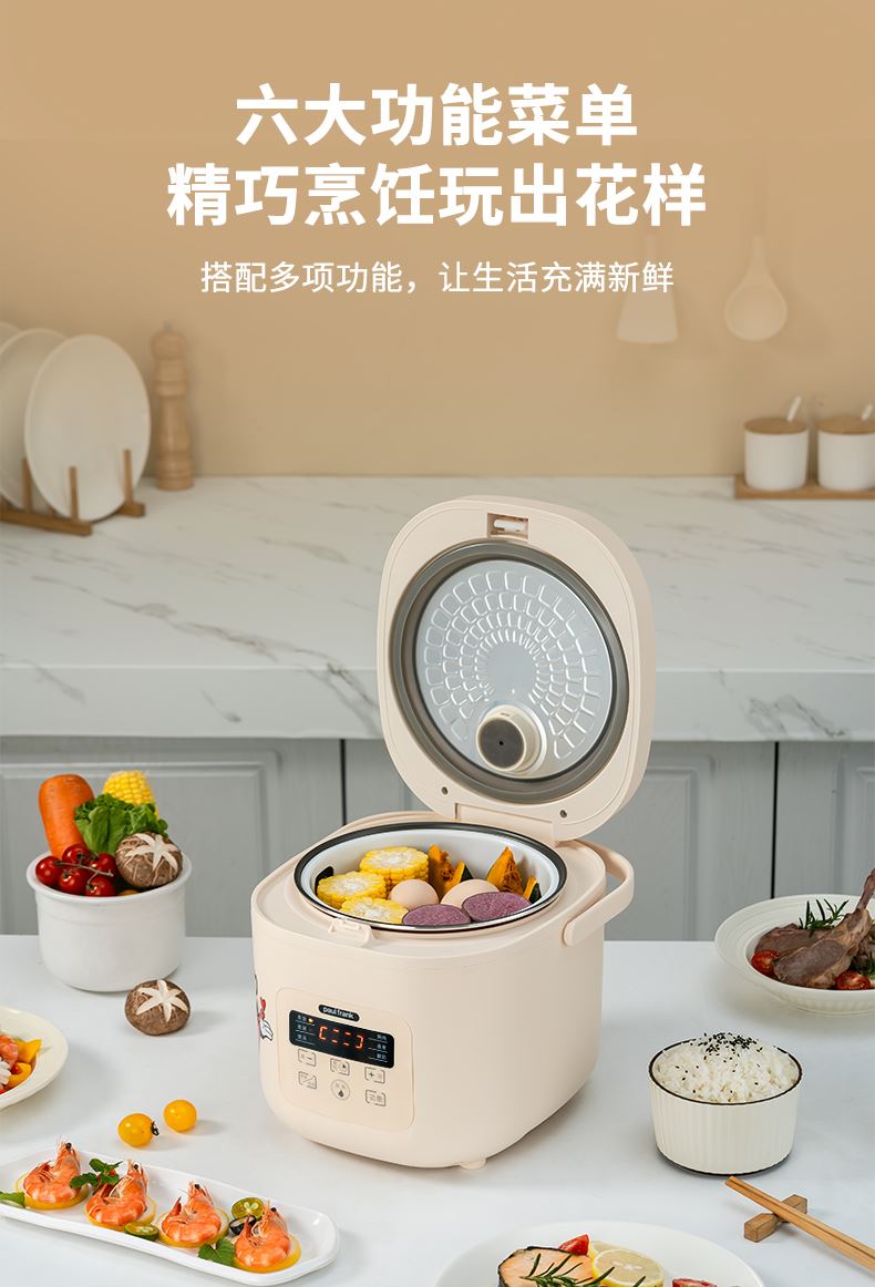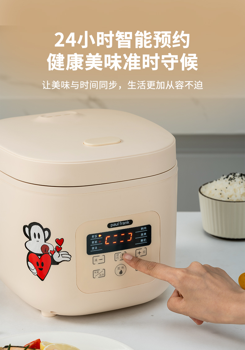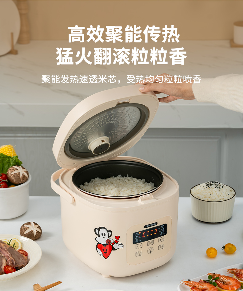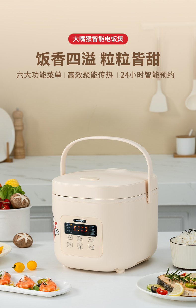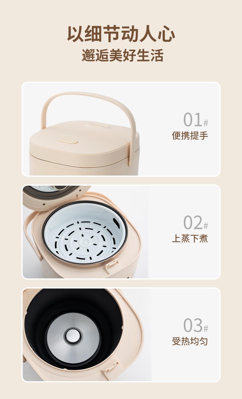 额定电压:220V~ 额定频率:50Hz 额定功率:501W 额定容量:4L 产品材质:PP外壳+喷涂铝胆 净重/毛重:2.3kg/2.8kg 产品尺寸:293×255×237mm 智能预设六大功能菜单,精巧烹饪玩出花样 ● 高效聚能传热,热力直达米芯,猛火翻滚粒粒香 ● 自动保温功能,美味待享 ● 24小时智能预约,让美味与时间同步,生活更加从容不迫