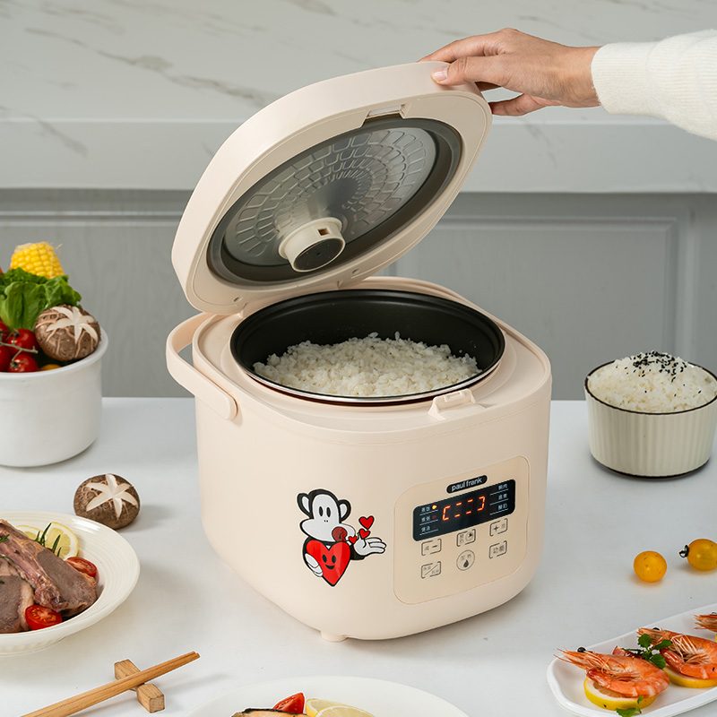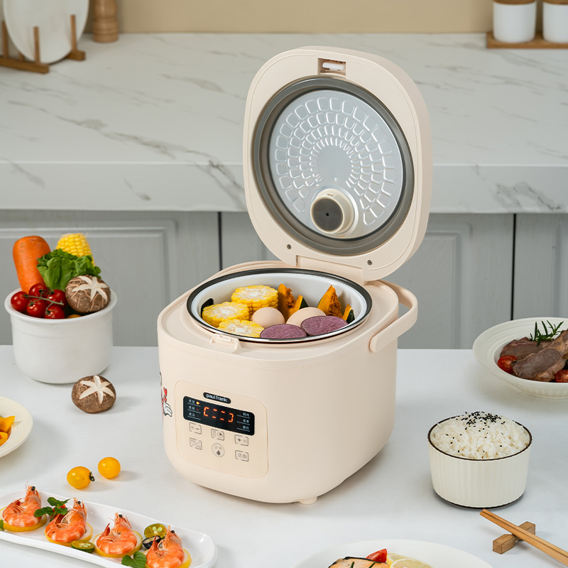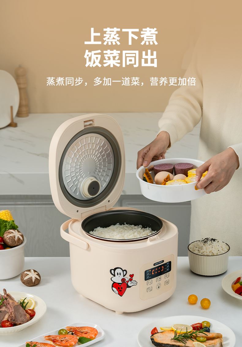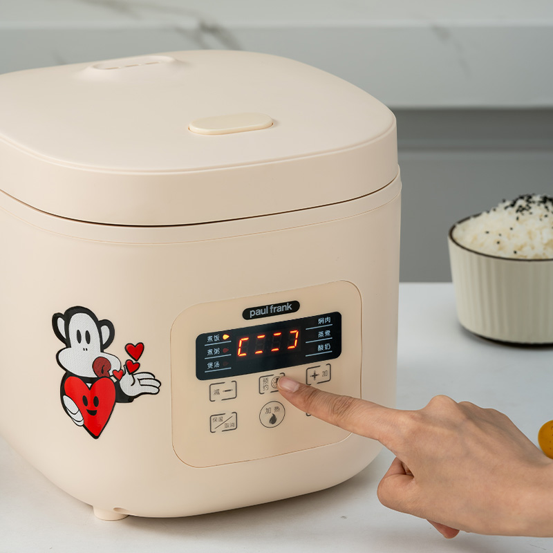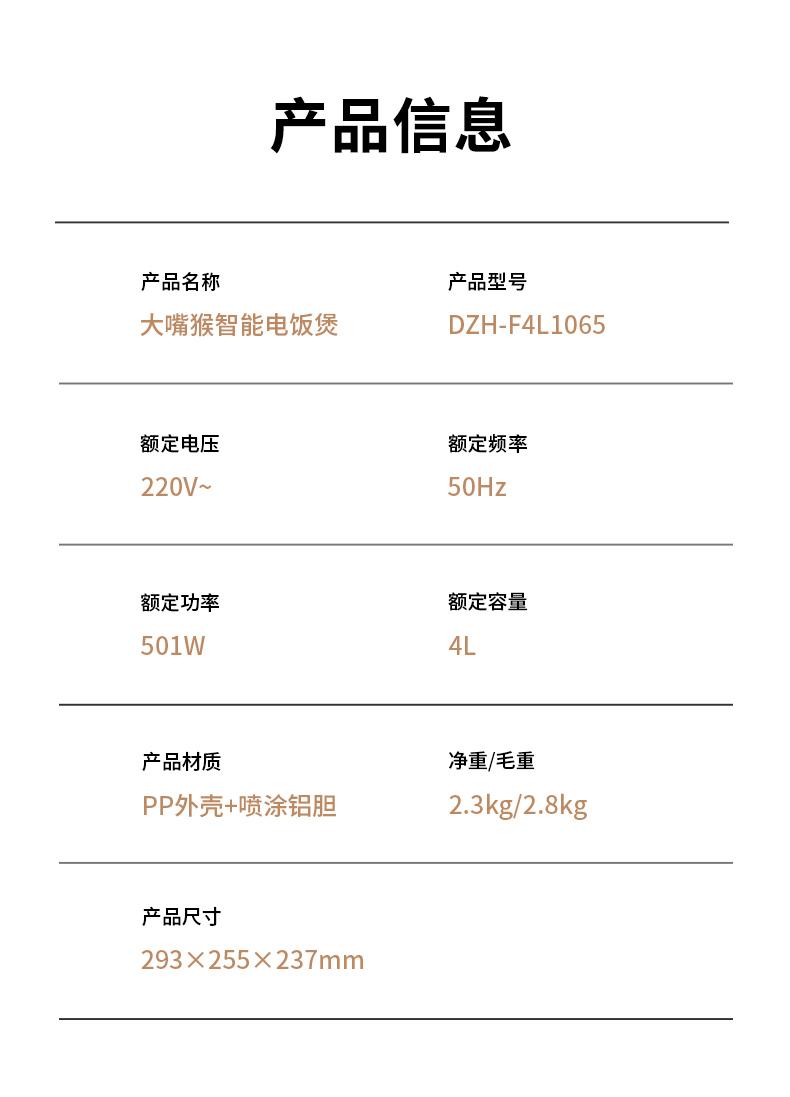 额定电压:220V~ 额定频率:50Hz 额定功率:501W 额定容量:4L 产品材质:PP外壳+喷涂铝胆 净重/毛重:2.3kg/2.8kg 产品尺寸:293×255×237mm 智能预设六大功能菜单,精巧烹饪玩出花样 ● 高效聚能传热,热力直达米芯,猛火翻滚粒粒香 ● 自动保温功能,美味待享 ● 24小时智能预约,让美味与时间同步,生活更加从容不迫