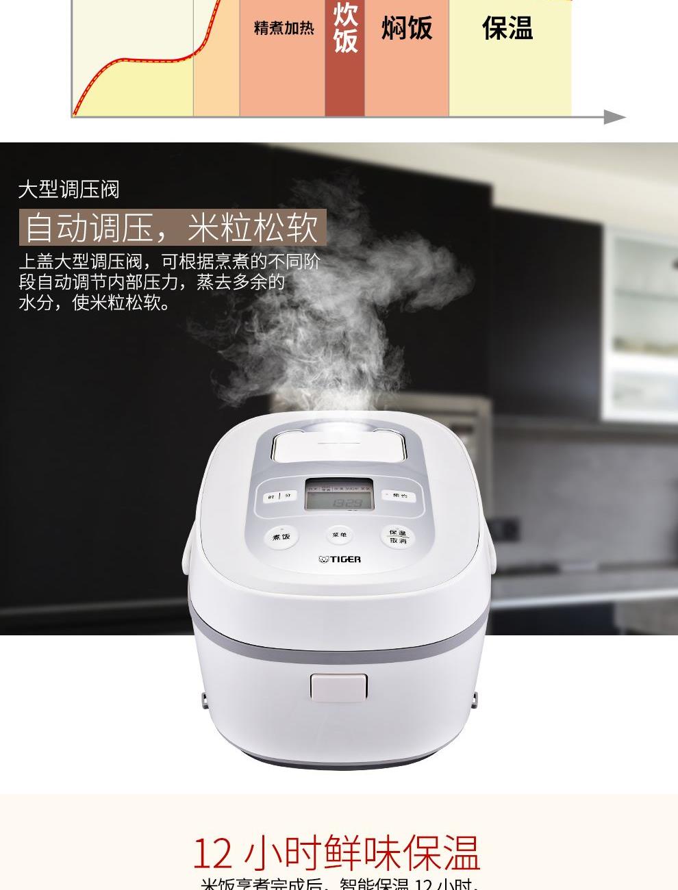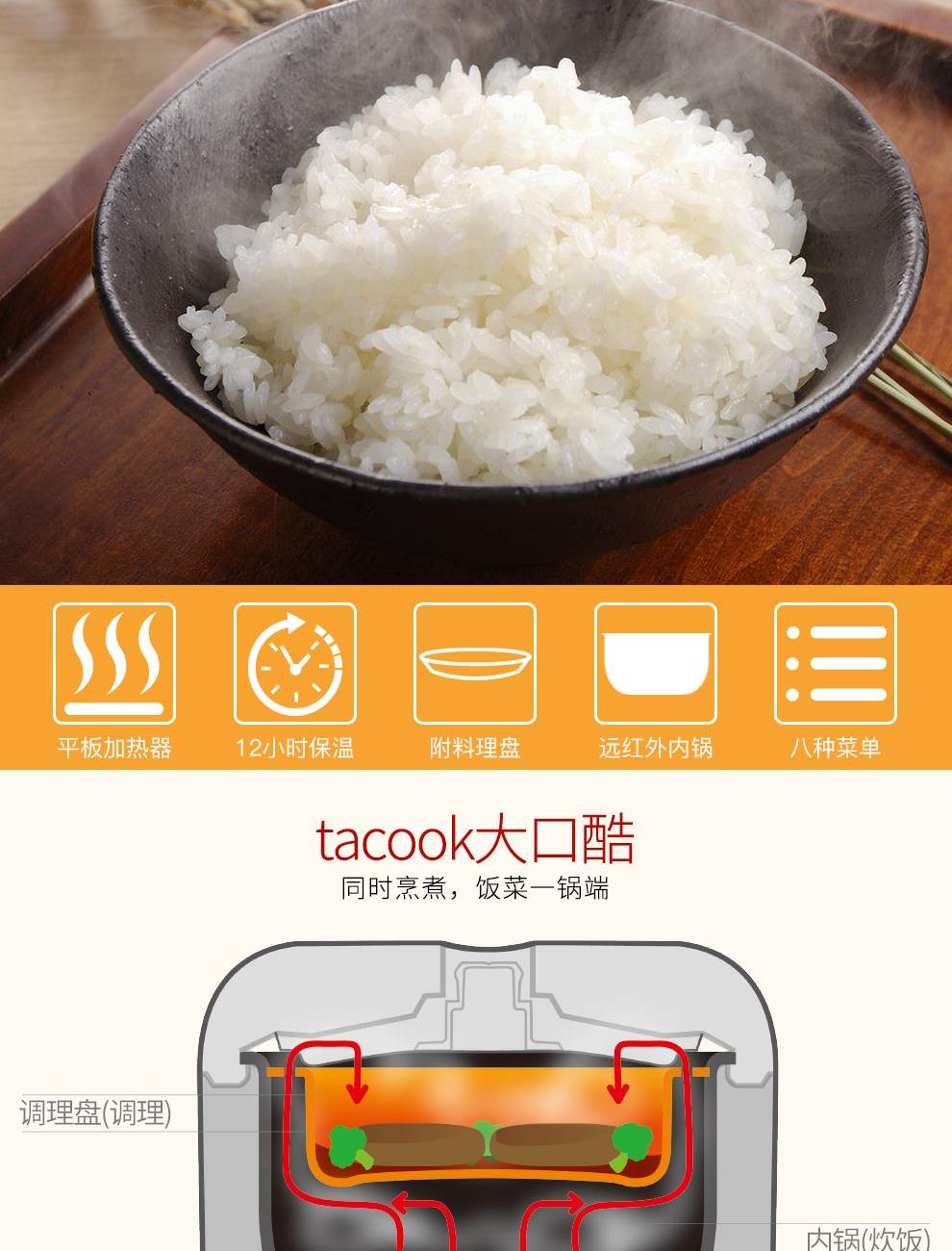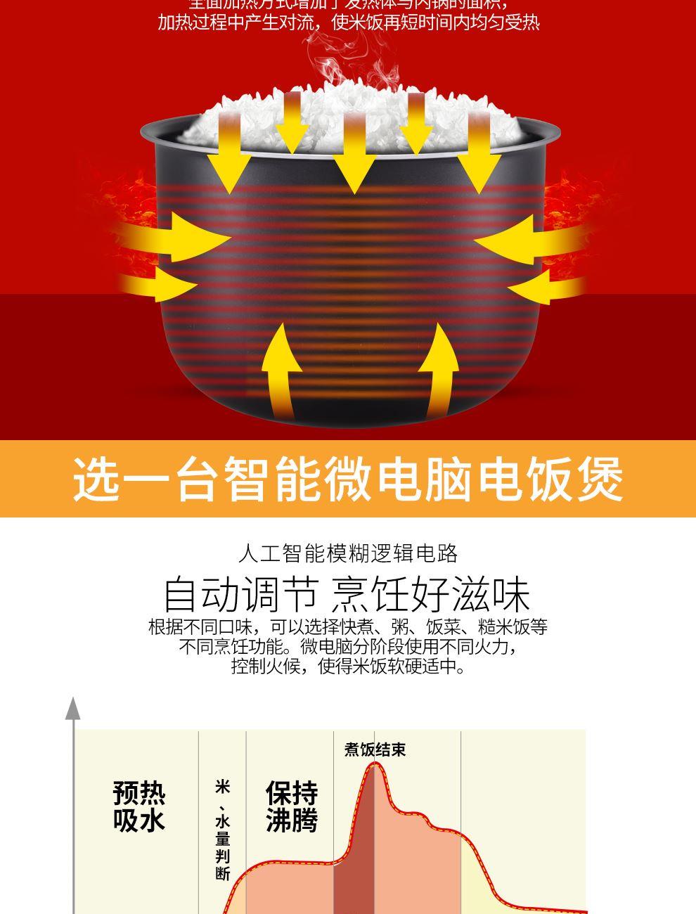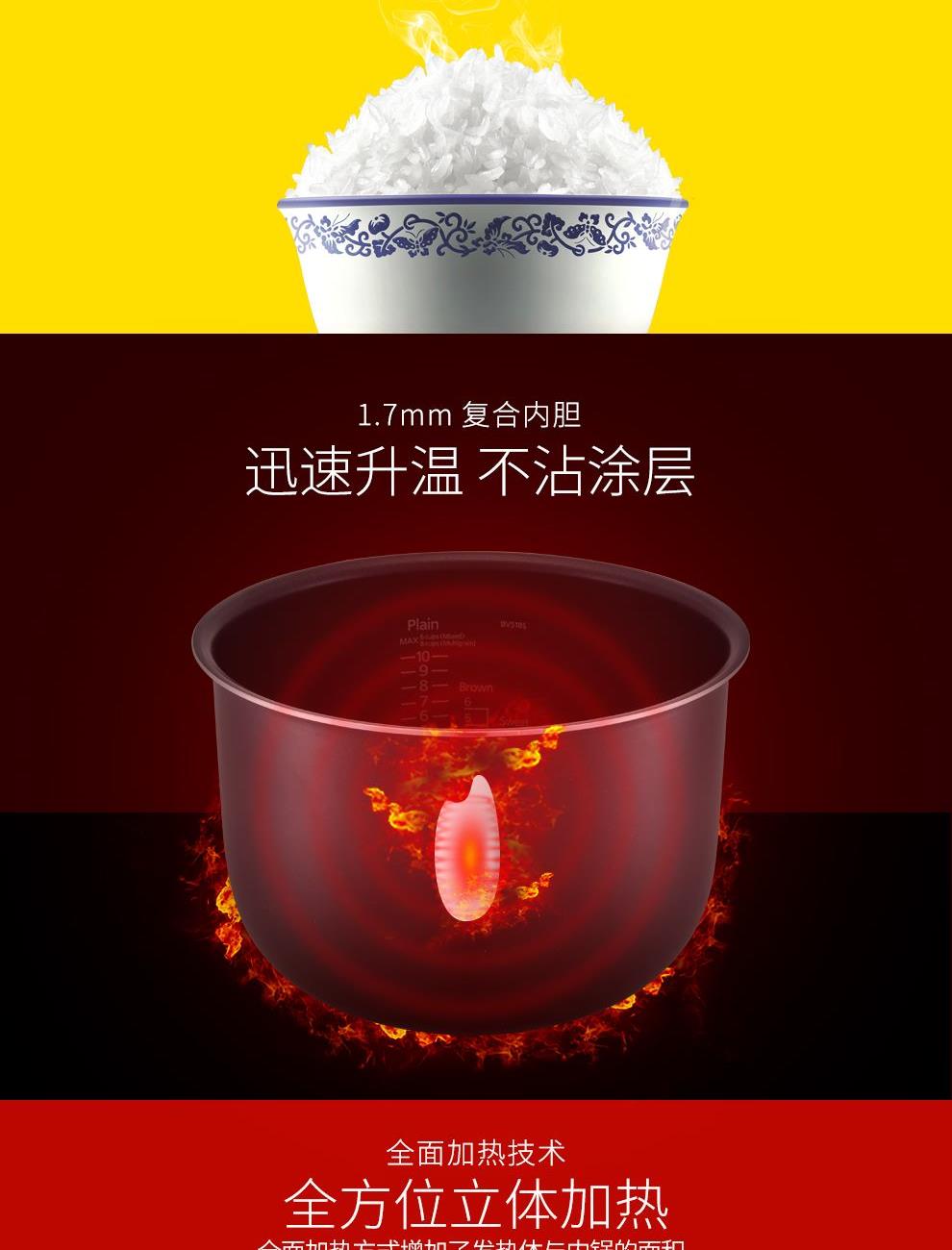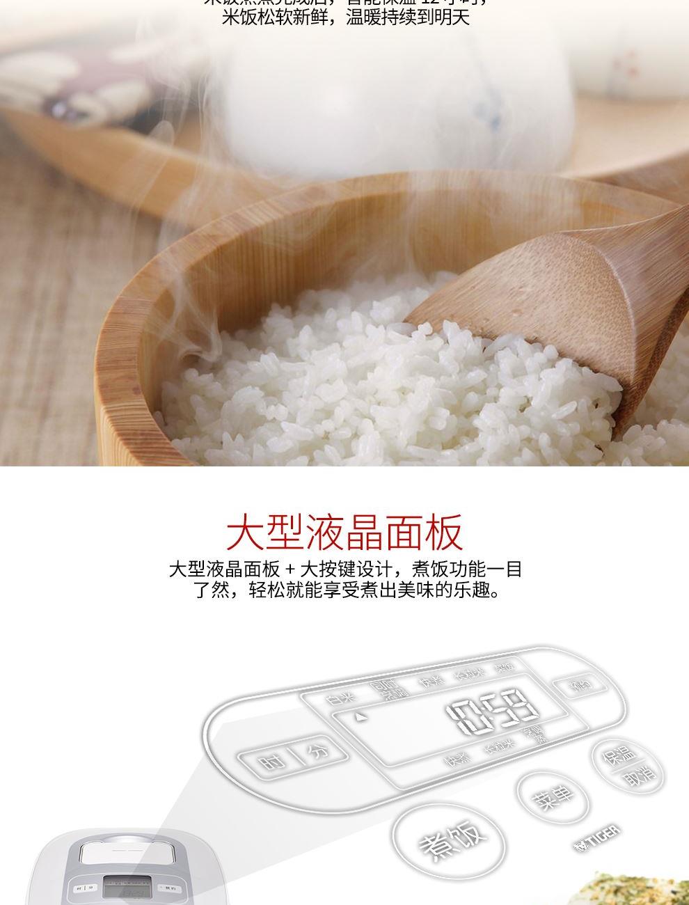 额定电压:220V 电源线长:1m 产品净重:3.9kg 额定功率:564W 蒸屉材质:PP(聚丙烯) 能效等级:三级能效 内胆材质:铝合金 产品尺寸:长286mm;宽347mm;高242mm 容量:3L 方位立体加熱全面加热方式增加了发热体与内锅的面积 加热过程中产生对流,使米饭在短时间内均匀受热 大型液晶面板+大按键设计 煮饭功能一目了然 轻松就能享受煮出美味的乐趣