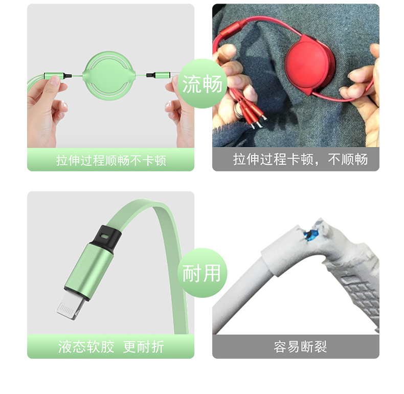克 重: 42g 线 长:1.1米 材 质:TPE/ABS/铝合金 输 出:5V/2.4A 接口:micro/TYPE-C/苹果 颜 色:红/绿 铜 丝:60*2 120支 一秒收纳,五档伸缩.更粗铜芯,充电提速一线三用,兼容所有马卡龙色系,多色可选正反面可随意定制LOGO素,适用于市面上所有常见手机