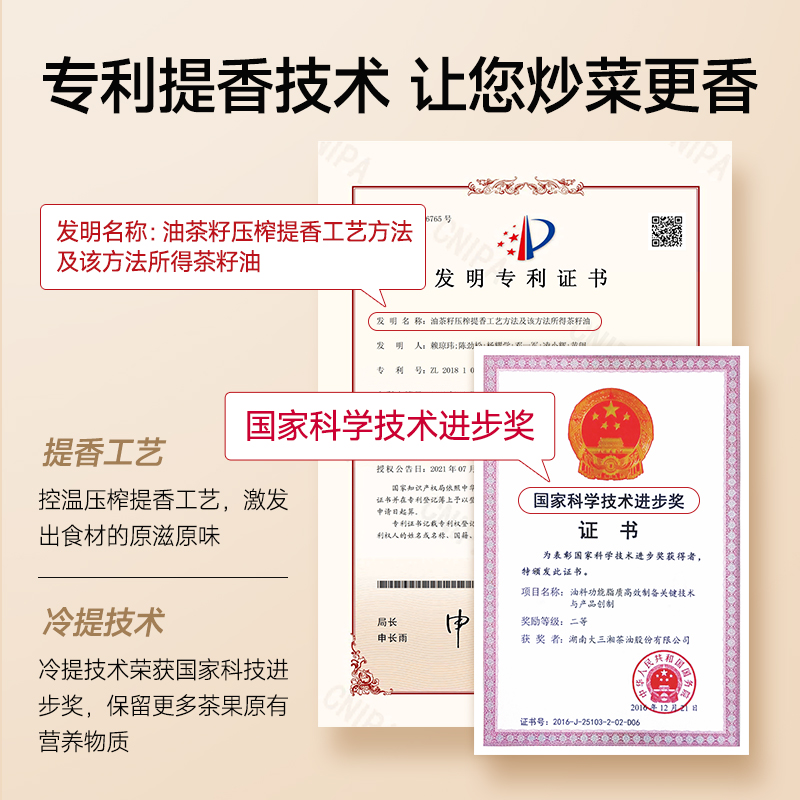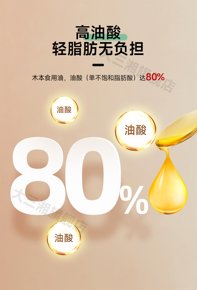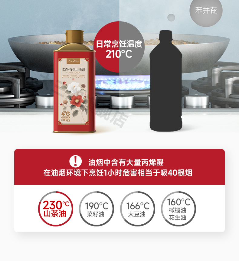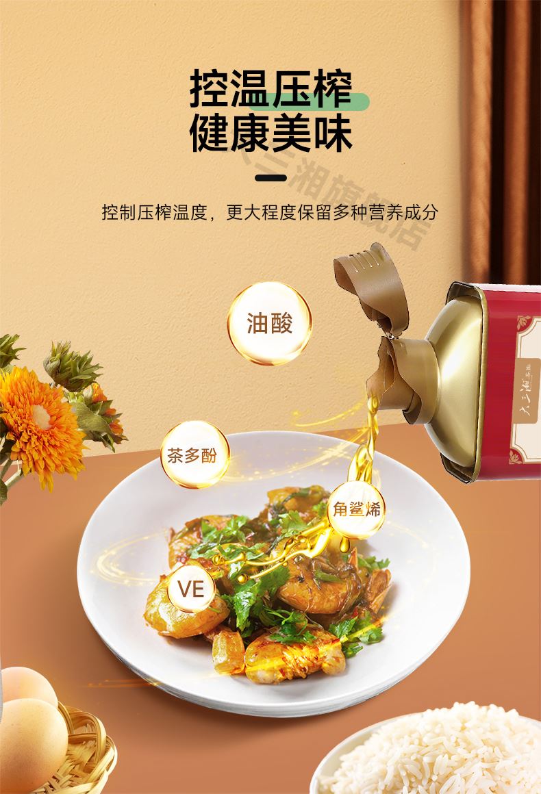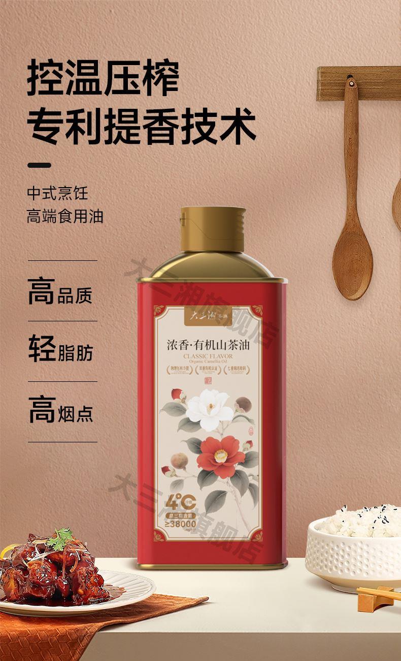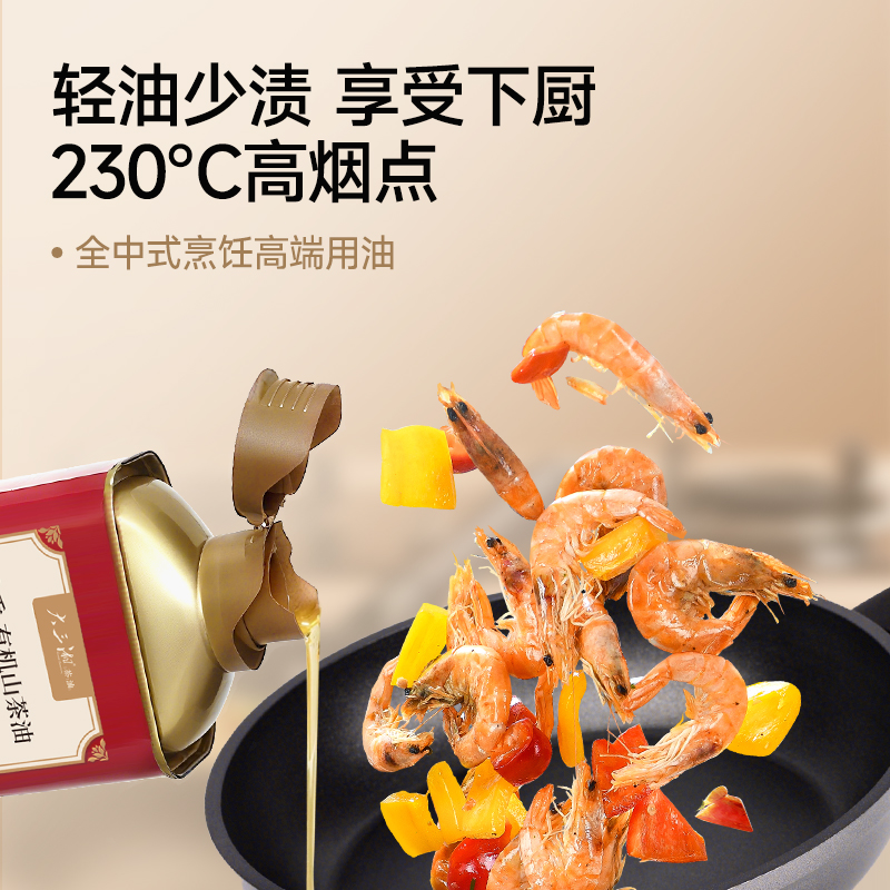 1、浓香纯正,风味浓郁,不止是土榨坊的味道 自创风味浓郁的浓香山茶油技术,将茶油中特有的芳香气味封存在茶油里。 2、230 ℃高烟点 热锅下油味更浓 230°的高烟点,符合中国人的烹饪习惯,高温烹饪更能激发浓香茶油香味,且炒菜少有油烟,减少油烟危害。 3、荤菜好搭档 入味不腻 茶油分子小,渗透力强,能够激发食材原有风味,而且清爽不油腻,尤其适合做荤菜。 新中国风铁罐包装,更搭配