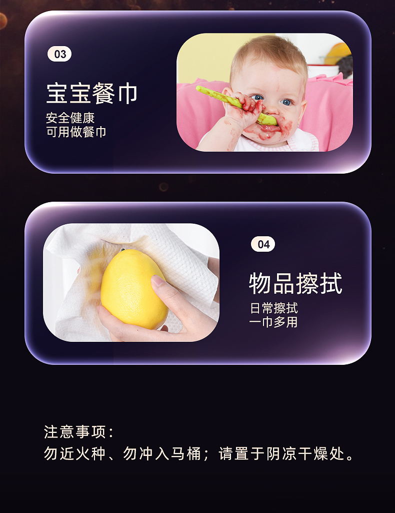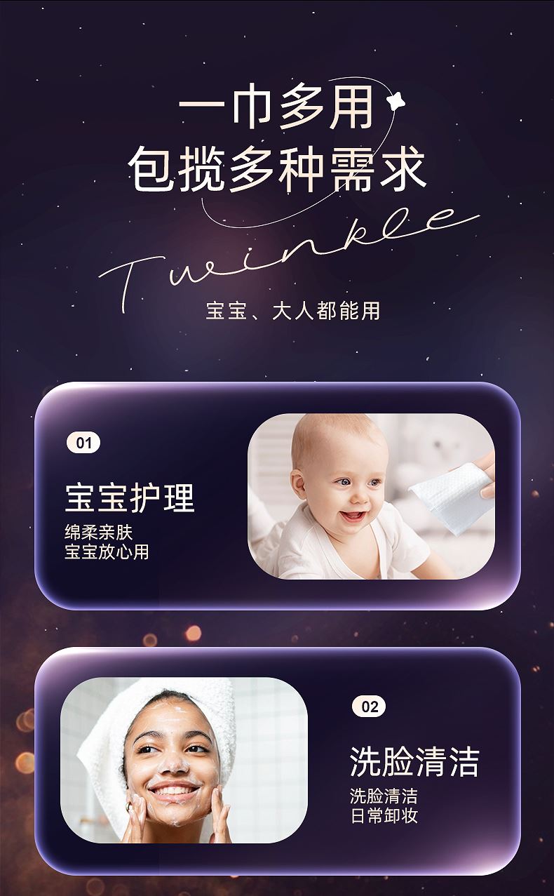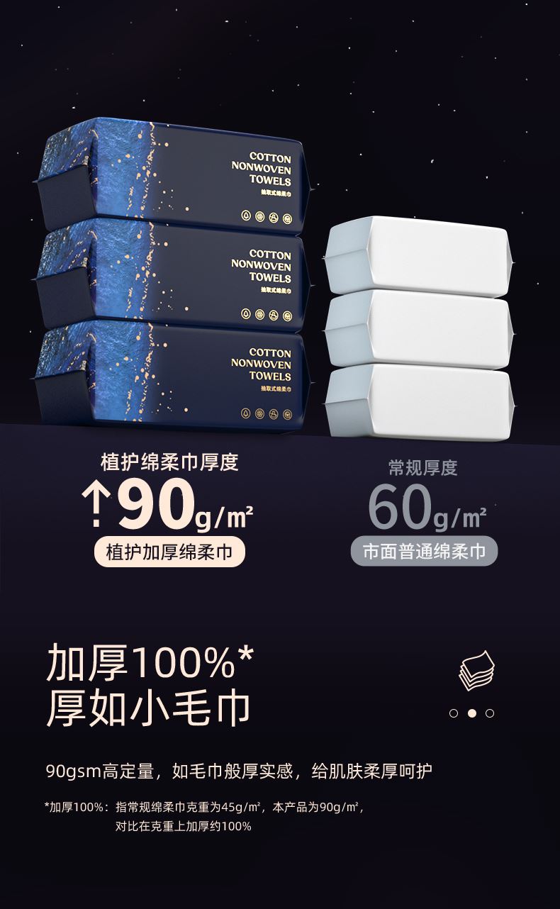 销售规格:150*200mm/20片/包*2包 主要成分:黏胶植物纤维 克重:90g/㎡ 1、20片/包轻巧随身又便捷,可替代毛巾、湿巾、纸巾; 2、加宽加厚,如毛巾般厚实; 3、植物纤维,天然更亲肤; 4、国际认证,使用更安心; 5、高压水射流柔织工艺,耐拉扯,不易掉絮; 6、双面纹理,双重呵护;