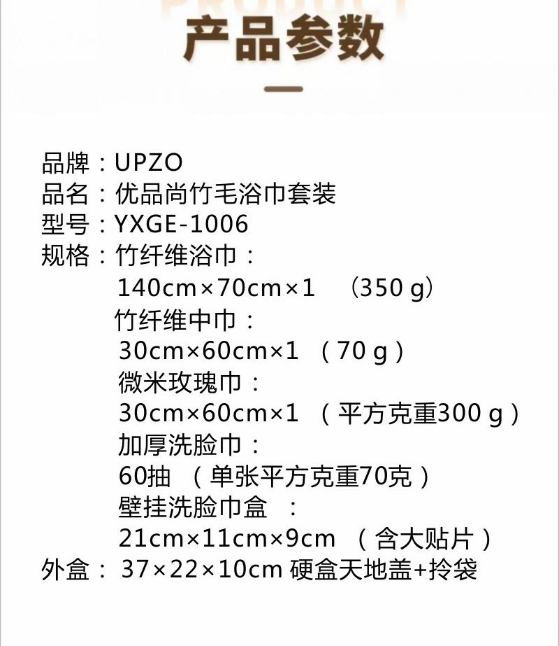 型号: YXGE-1006 产品内容 : 竹纤维浴巾:140cm×70cm×1 (350 g) 竹纤维中巾:30cm×60cm×1 (70 g) 微米玫瑰巾:30cm×60cm×1 (平方克重300 g) 加厚洗脸巾: 60抽 (单张平方克重70克) 壁挂洗脸巾盒 : 21cm×11cm×9cm (含大贴片) 礼盒: 37×22×10cm 硬盒天地盖+拎袋 大礼包 实用组合套装 组合形式靓丽