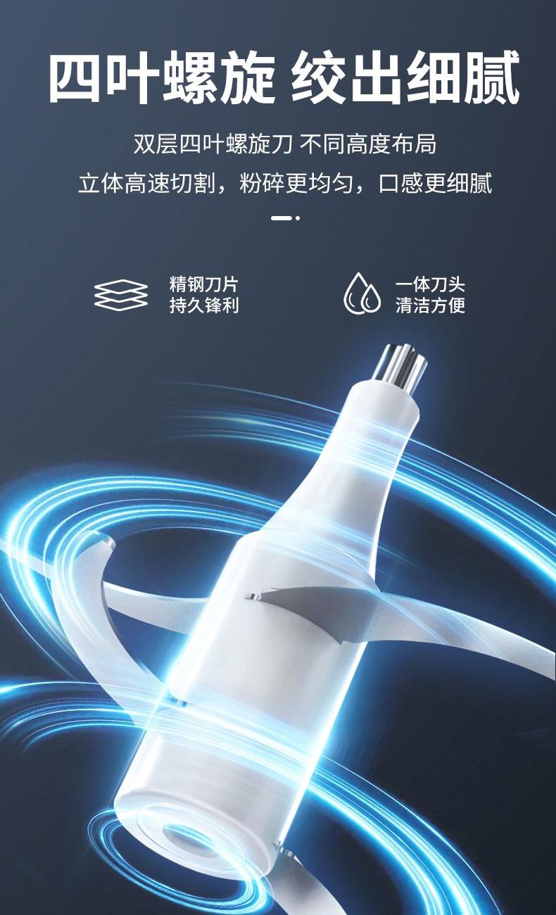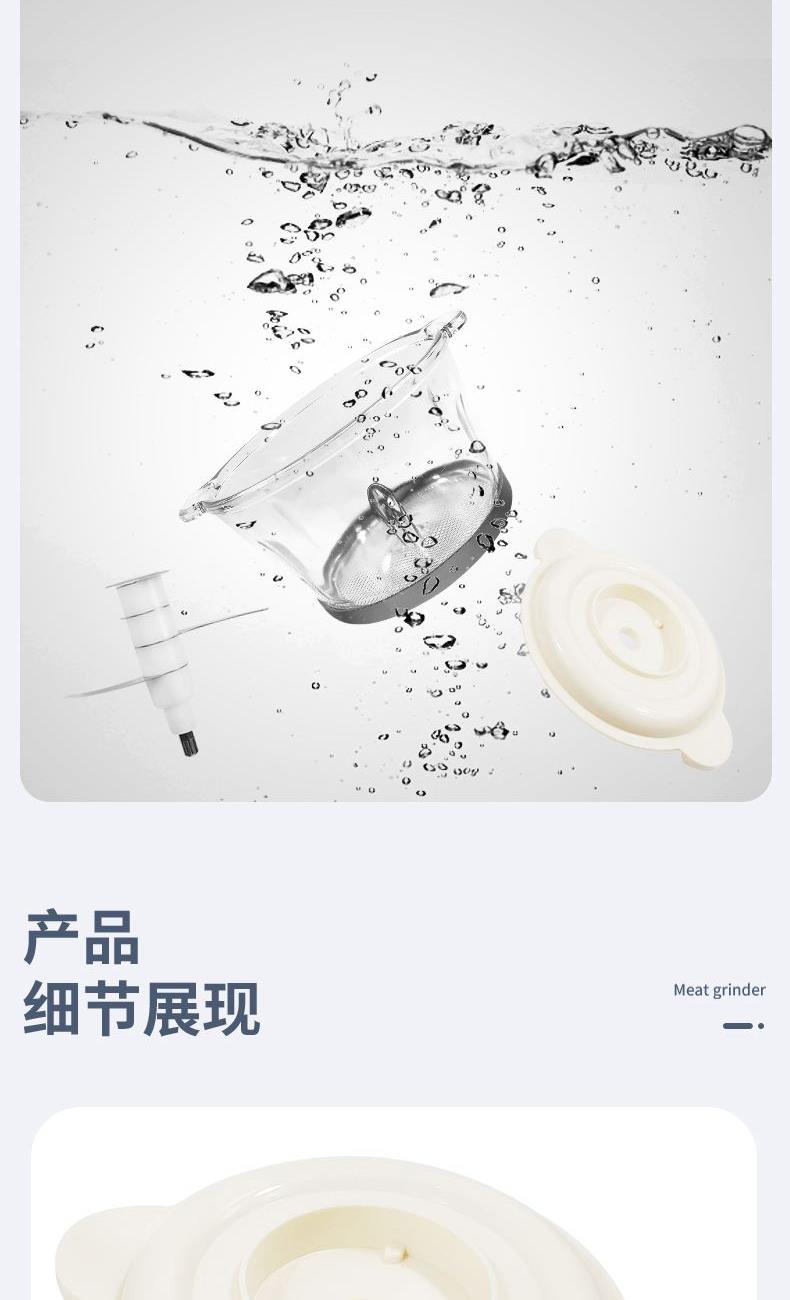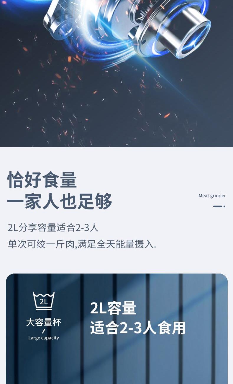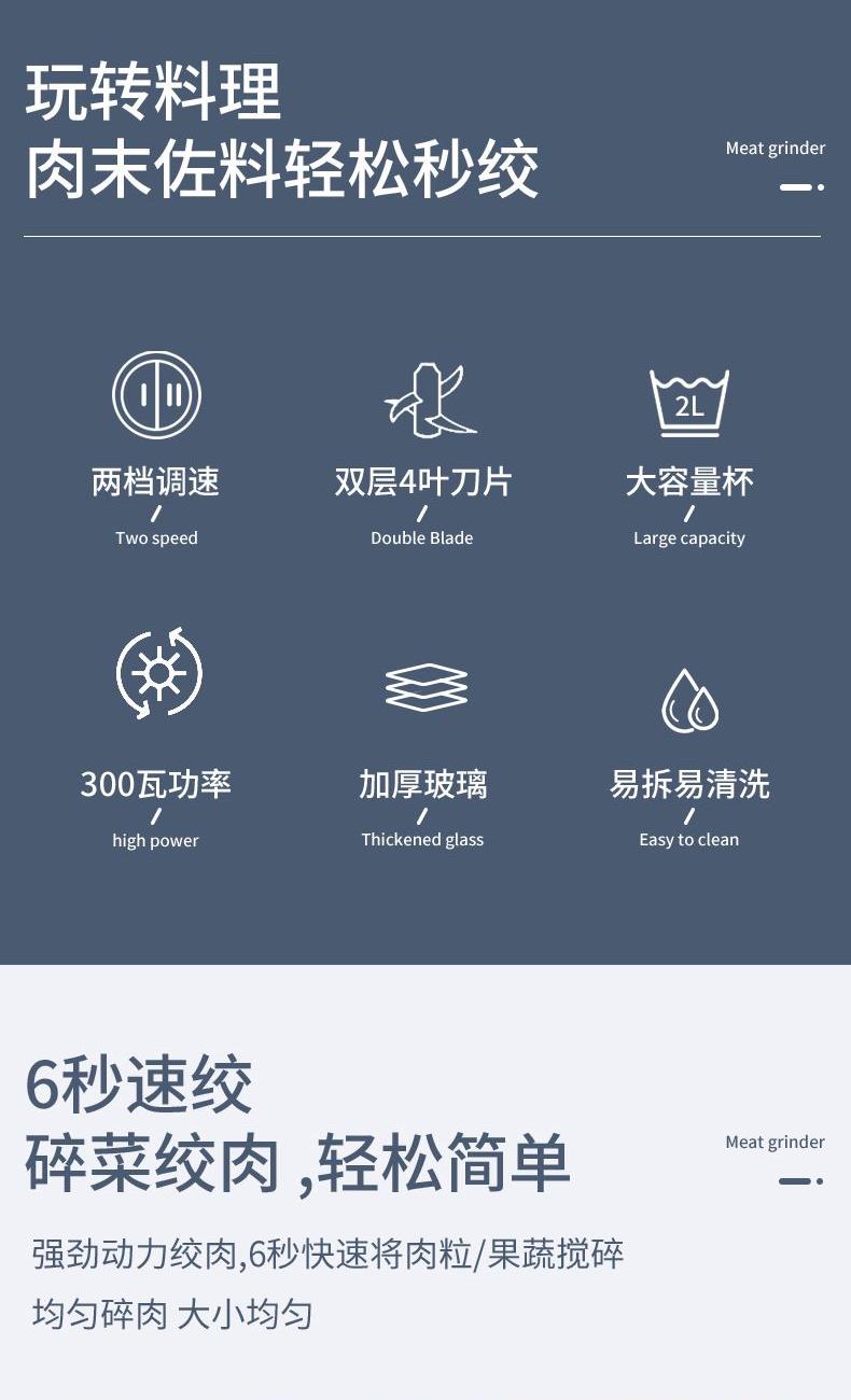 1 、额定电压 :220V/50Hz 2、 额度功率:300W 3、容量:2L 4、机身材质:PP食品级塑料机 5、 杯体材质:高硼硅玻璃 6、 产品毛重:2.3kg 7、尺寸机身:24cm 机头:13cm 1、不锈钢金属效果机身; 2、自主研发一体四叶四层刀头,360度无死角绞肉更细腻,免安装清洗更方便; 3、玻璃/304不锈钢 食品级切碎杯; 4、300W大功率电机,5秒绞肉; 5、双档操作,随按随停,使用安全。