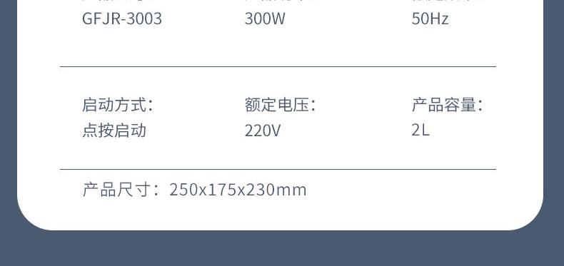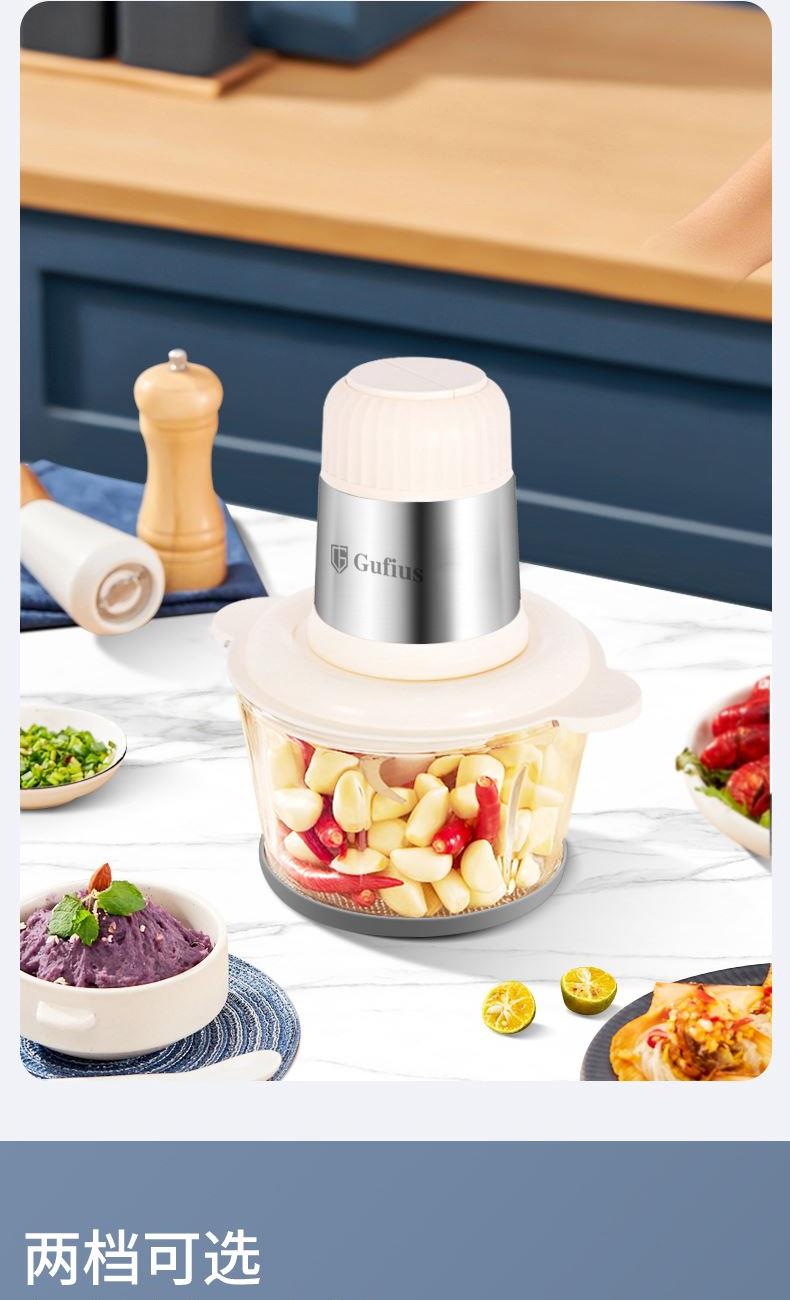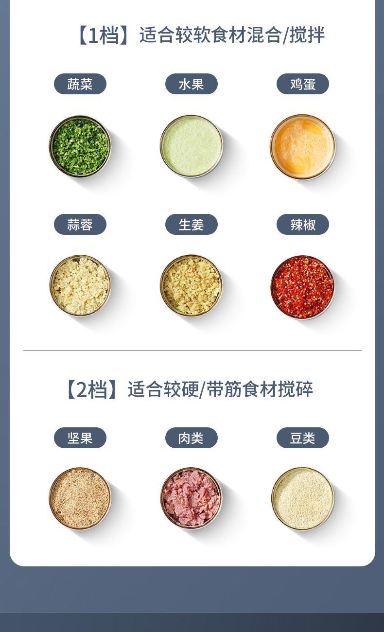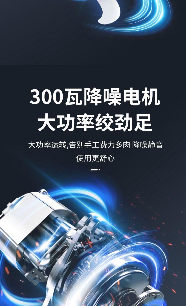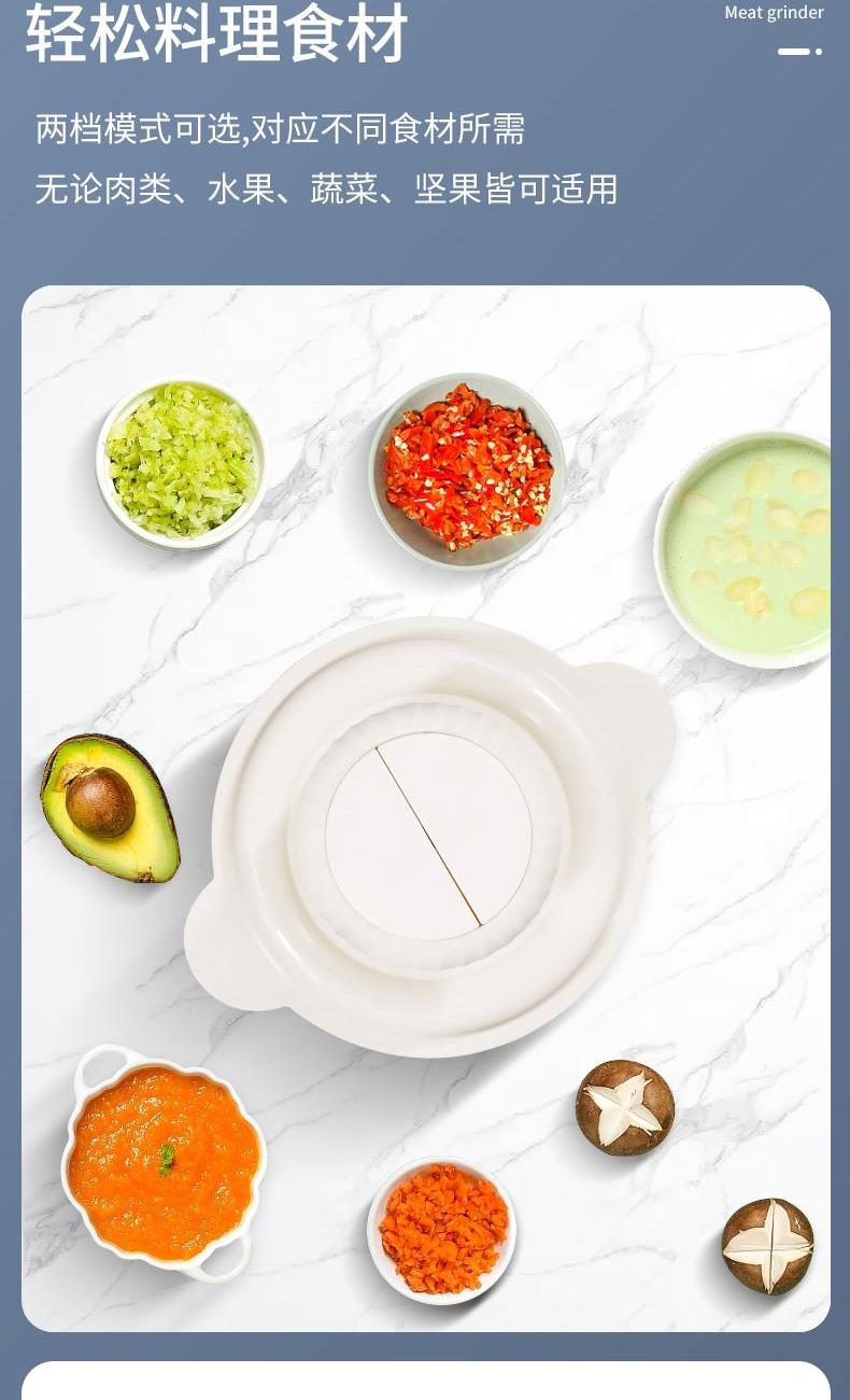 1 、额定电压 :220V/50Hz 2、 额度功率:300W 3、容量:2L 4、机身材质:PP食品级塑料机 5、 杯体材质:高硼硅玻璃 6、 产品毛重:2.3kg 7、尺寸机身:24cm 机头:13cm 1、不锈钢金属效果机身; 2、自主研发一体四叶四层刀头,360度无死角绞肉更细腻,免安装清洗更方便; 3、玻璃/304不锈钢 食品级切碎杯; 4、300W大功率电机,5秒绞肉; 5、双档操作,随按随停,使用安全。