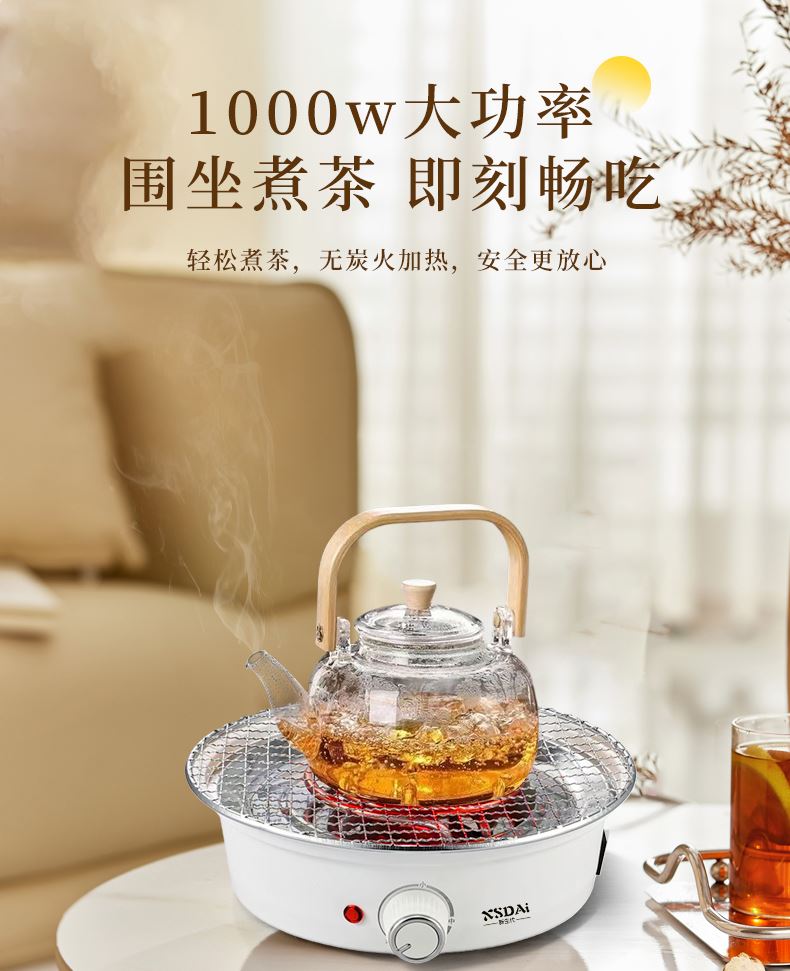 产品型号:DP/KW1170 产品尺寸:270*1280*85 产品功率:1000W 产品容量;0.8升(玻璃壶) 功能说明: 1、轻松煮茶,无碳二氧化碳,安全放心 2、1000W功率,煮茶方便快捷, 3、全套不锈钢 ,安全保障,可配烤肉盘 4、 可煎,可烤,美味切换不费力 5、高硼玻璃水壶, 6、双重锁温发热技术,仿碳耐烧性,长效锁热