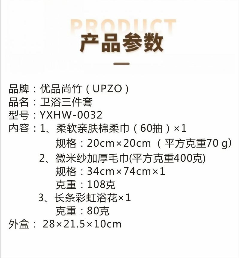 型号:YXHW-0032 产品内容: 1、严选好物系列亲肤棉柔巾×1 (60抽) 20cm×20cm 平方克重70克 2、严选好物系列微米纱加厚毛巾 ×1 克重100克 34cm×74cm 3、严选好物系列长条彩虹浴花 ×1 80克 外盒: 28×21.5×10cm 长条彩虹浴花 精选新料 手工制作 洗脸巾加厚 平方克重70 60抽 微米加厚干发巾 毛巾克重100克 厚度决定吸水性 精制包边