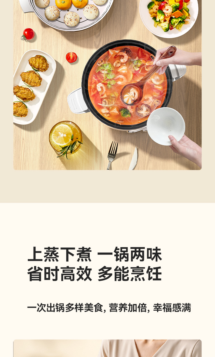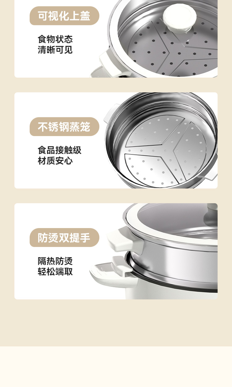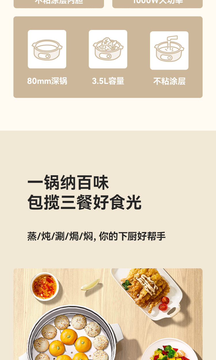 额定电压:220V~ 额定功率:1000W 额定频率:50Hz 额定容量:3.5L 产品尺寸:359x280x246(长x宽x高) 1、优质基材,不粘锅身; 2、加大功率,超强导热,高效储热,节能省时; 3、旋钮式控制开关,简易操作; 4、蒸煮焖炒多功能为一体。