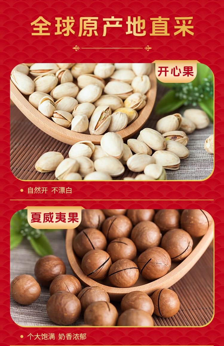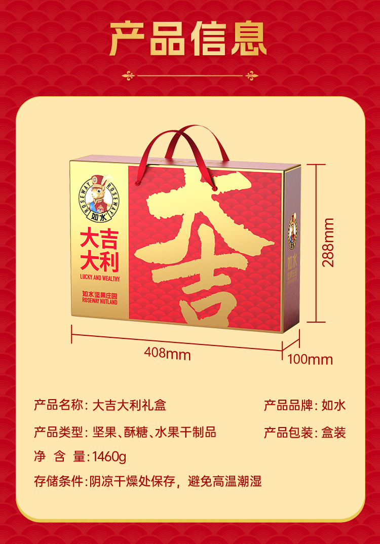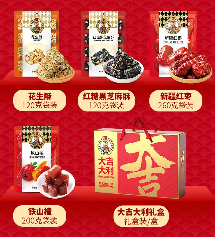 如水大吉大利礼盒 净含量:1460g 如水开心果60g 如水夏威夷果100g 如水薄皮核桃300g 如水开口杏核100g 如水鱼皮花生100g 如水怪味胡豆100g 如水花生酥120g 如水红糖黑芝麻酥120g 如水新疆红枣260g 如水铁山楂200g