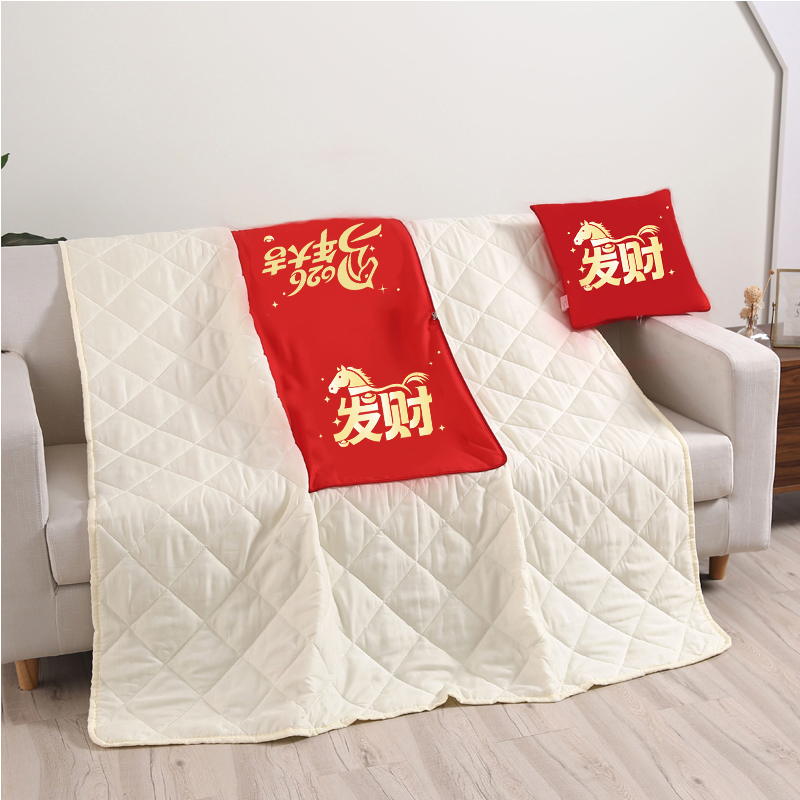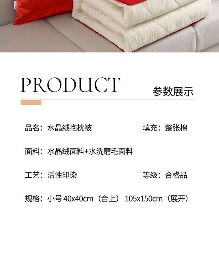规格:40cm*40cm 被子:110cm*150cm 面料:磨毛印花(聚酯纤维) 填充:羽丝棉(聚酯纤维) 1、抱枕被是抱枕的升华,既是抱枕又可以当被子盖的家居用品; 2、可以作抱枕、靠枕、靠垫、头枕、腰枕; 3、适合出差、野营出游、沙发上看电视、办公室里打个盹必备;