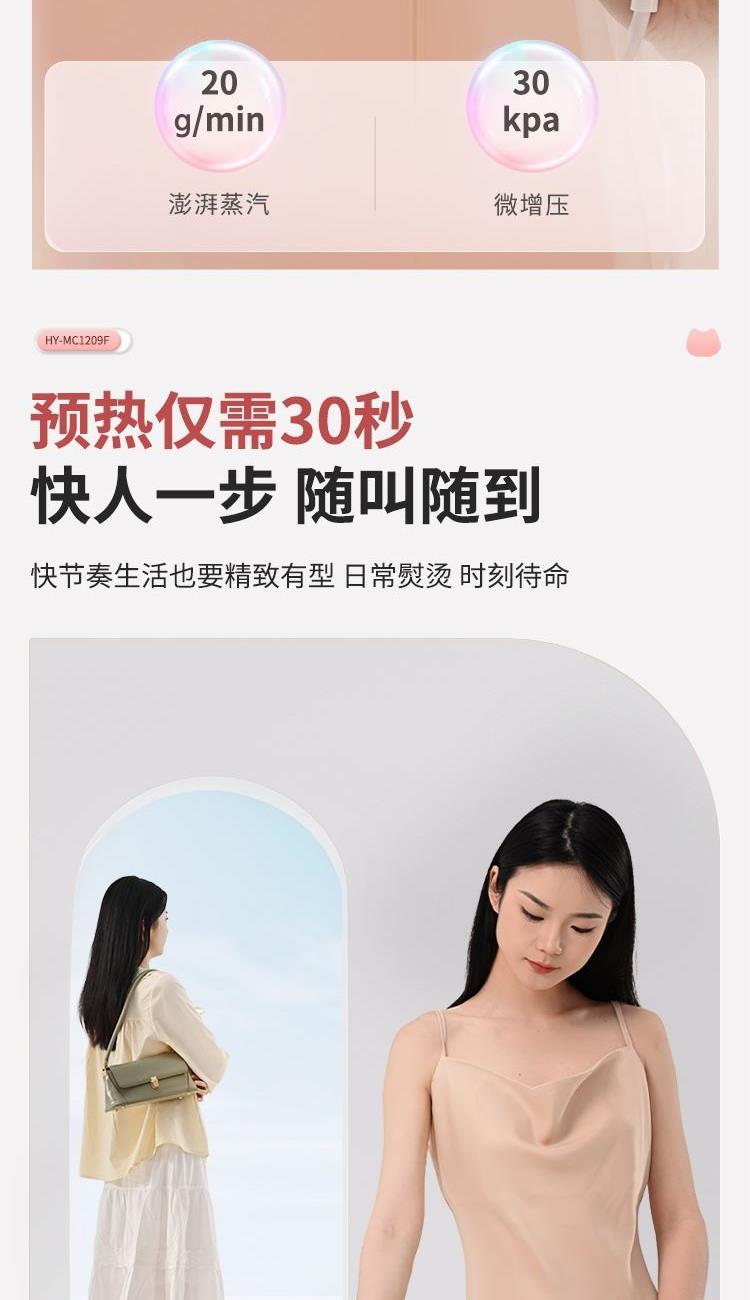 1. 1200W大功率,预热时间快,持续澎湃蒸汽,达到快速渗透衣物定型的效果